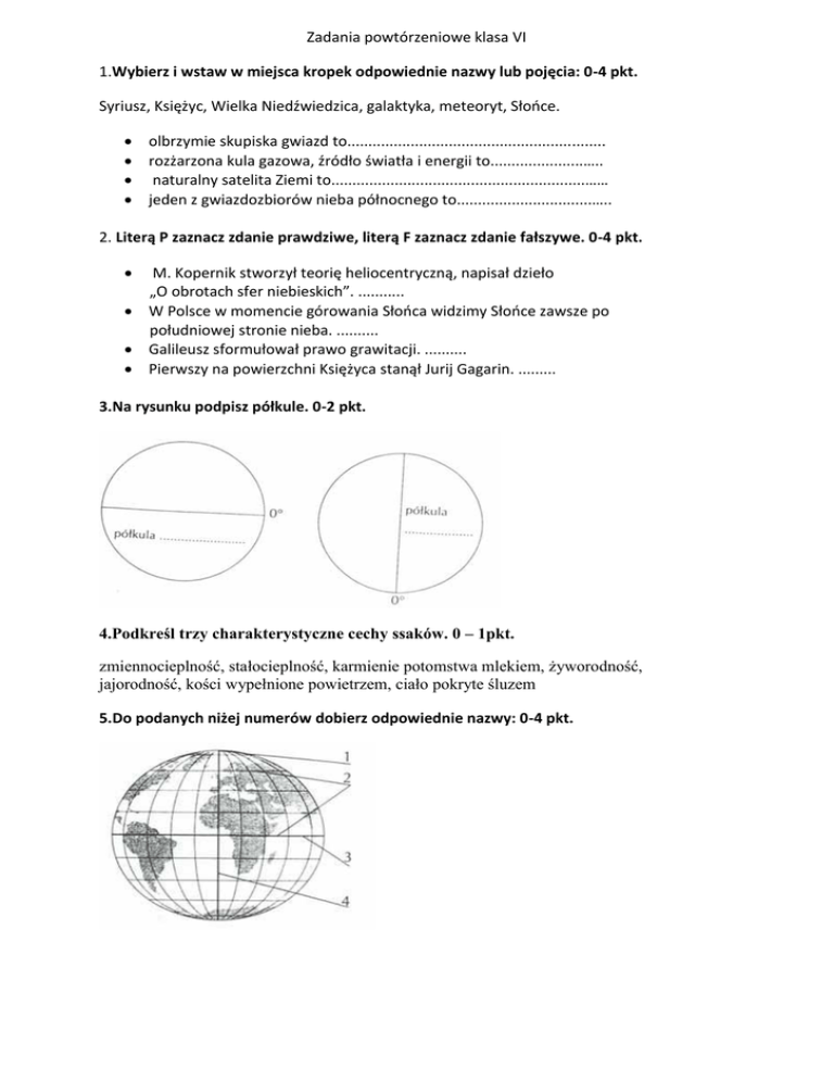 Zadania powtórzeniowe klasa VI 1.Wybierz i wstaw w miejsca kropek odpowiednie nazwy lub pojęcia: 0-4 pkt. Syriusz, Księżyc, Wielka Niedźwiedzica, galaktyka, meteoryt, Słońce. olbrzymie skupiska gwiazd to............................................................. rozżarzona kula gazowa, źródło światła i energii to......................….. naturalny satelita Ziemi to............................................................…… jeden z gwiazdozbiorów nieba północnego to................................….. 2. Literą P zaznacz zdanie prawdziwe, literą F zaznacz zdanie fałszywe. 0-4 pkt. M. Kopernik stworzył teorię heliocentryczną, napisał dzieło „O obrotach sfer niebieskich”. ........... W Polsce w momencie górowania Słońca widzimy Słońce zawsze po południowej stronie nieba. .......... Galileusz sformułował prawo grawitacji. .......... Pierwszy na powierzchni Księżyca stanął Jurij Gagarin. ......... 3.Na rysunku podpisz półkule. 0-2 pkt. 4.Podkreśl trzy charakterystyczne cechy ssaków. 0 – 1pkt. zmiennocieplność, stałocieplność, karmienie potomstwa mlekiem, żyworodność, jajorodność, kości wypełnione powietrzem, ciało pokryte śluzem 5.Do podanych niżej numerów dobierz odpowiednie nazwy: 0-4 pkt. 1)........................................ 2)........................................ 3)........................................ 4)........................................ 6.Gdzie można zaobserwować zjawisko rozszczepiania światła? Podkreśl prawidłowe odpowiedzi. 0-2pkt. a) w głębi oceanów b) w wodzie ze zraszaczy trawników c) przy wodospadzie d) w rzece 7.Ile wynosi długość geograficzna punktu x ? Podkreśl prawidłową odpowiedź: 0-1 pkt. a) 600 E b) 600 W c) 200 S d) 200 W 8.Uzupełnij brakujące w zdaniach wyrazy. 0-4 pkt. a) obieg Ziemi dookoła Słońca nazywamy ruchem ....................... b) Ziemia krąży po drodze zwanej ................................................ c) czas obiegu Ziemi dookoła Słońca wynosi ............................... d) skutkiem ruchu Ziemi dookoła Słońca są (podaj co najmniej jeden przykład) ........................................................................................................ 9.Rysunek przedstawia oświetlenie Ziemi w dniu (zaznacz prawidłową0-1 pkt. a) 23 września b) 22 grudnia c) 21 marca d) 22 czerwca 10.Na kuli ziemskiej wyróżniamy siedem kontynentów. Wymień je: 0-2 pkt. 1) ............................. 2) ............................. 3) ............................. 5) ............................. 6) ............................. 7) ............................. 4) ............................. 11.Wstaw obok zdania literę P jeśli uznasz je za prawdziwe, lub F jeśli uznasz je za fałszywe. 0-4 pkt. a) źródłem dźwięku są ciała drgające. ...... b) fala dźwiękowa nie może rozchodzić się w próżni. ...... c) w sali teatralnej wyłożonej aksamitną tkaniną powstaje echo. ...... d) ukwiał żyje w symbiozie z pustelnikiem. ....... 12.Podkreśl nazwy tych organizmów, które żyją w morzach: 0-1 pkt. żaba, chełbia, krewetka, ostryga, szczupak 13.Nurkując w jeziorze Bartek zaobserwował na dnie raka stawowego. W sąsiedztwie spostrzegł innego mieszkańca jeziora – zatoczka rogowego. W wodach jeziora pływały ławice siei. Przy brzegu jeziora żył przytwierdzony do roślin polip stułbi pospolitej. 0-4 pkt. a)podaj nazwę skorupiaka wymienionego w tekście ............................................. b) jaki tryb życia prowadzi stułbia pospolita? ....................................................... c) wpisz nazwę ślimaka, o którym jest mowa w tekście ........................................ d) jakie ryby pływały w jeziorze? .......................................................................... 14.Podkreśl nazwy tych elementów budowy komórki, które wchodzą w skład komórki zwierzęcej. 0-1 pkt. jądro, cytoplazma, ściana komórkowa, błona komórkowa, chloroplasty 15.Podkreśl trzy charakterystyczne cechy ssaków. 0-1 pkt. zmiennocieplność, stałocieplność, karmienie potomstwa mlekiem, żyworodność, jajorodność, kości wypełnione powietrzem, ciało pokryte śluzem 16.Wpisz podane niżej nazwy zwierząt do właściwych rubryk tabeli. 0-6 pkt. bażant, krzyżak ogrodowy, jeleń, mysz, krokodyl, dżdżownica, jaszczurka zwinka, kuropatwa, ślimak winniczek stawonogi mięczaki pierścienice gady ptaki ssaki 17.Rozwiąż krzyżówkę. 0-6 pkt. 1)Mieszka w Kotlinie Kongo, jest niskiego wzrostu. 2)Najważniejszą rośliną uprawną w oazie. 3)Wysokie trawy z kępami drzew lub pojedynczymi drzewami. 4)Wyschnięte koryto rzeczne na pustyni. 5)Mieszkańcy tundry w Ameryce Północnej. 6)Żyzne gleby stepowe. 18.Niżej podano charakterystyczne cechy stref krajobrazowych. Przyporządkuj charakterystykę odpowiedniej strefie. Odpowiedź wpisz do tabeli. 0-4 pkt. a)zima długa i mroźna b)uprawia się głównie oliwki i winorośl c)padają codziennie obfite deszcze d)oazy, uedy, Beduini Strefa krajobrazowa Tundra Roślinność śródziemnomorska Pustynia Las równikowy Charakterystyczne cechy 19.Wykonaj polecenia korzystając z diagramu. 0-4 pkt. a)odczytaj najwyższą i najniższą sumę opadów atmosferycznych: - najwyższa suma opadów atmosferycznych ............mm - najniższa suma opadów atmosferycznych .............mm b)podaj, w którym miesiącu temperatura powietrza jest najwyższa: Odp. .................................................................................................. Odczytaj z wykresu wartość temperatury powietrza w tym miesiącu: Odp. .................................................................................................. 20.Naszkicuj jak ułożą się opiłki żelaza rozrzucone wokół magnesu sztabkowego. 0-2 pkt. N S 21.Literą P zaznacz zdanie prawdziwe, a literą F zdanie fałszywe. 0-3 pkt. a) Napięcie w domowym gniazdku elektrycznym wynosi 24V. ......... b)