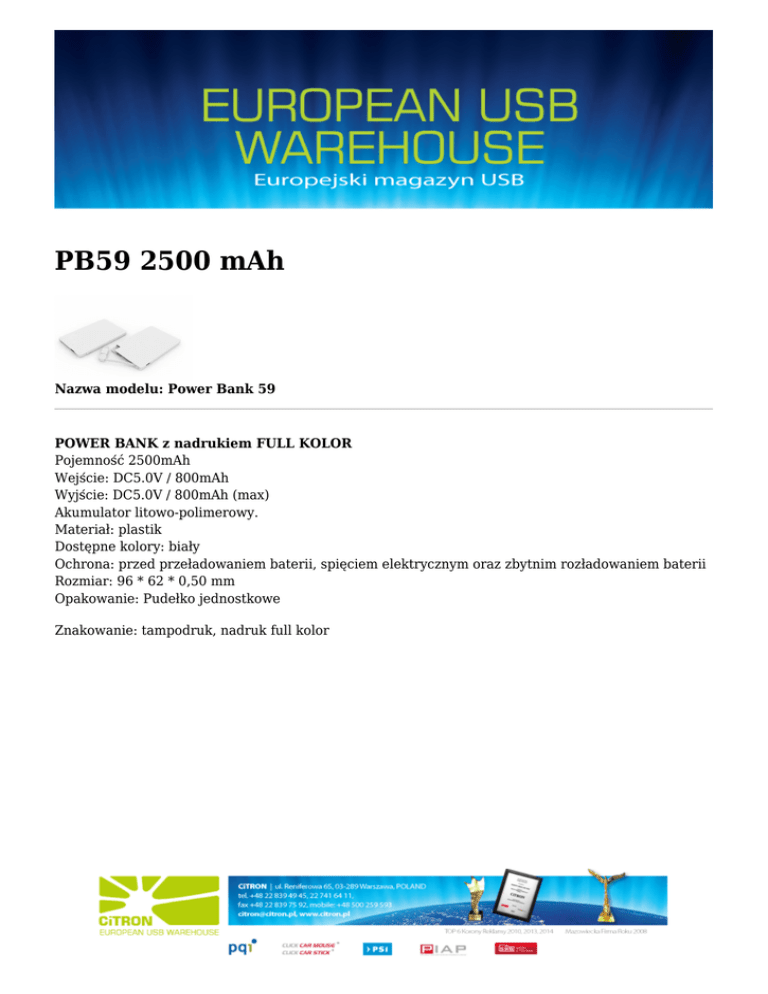 PB59 2500 mAh Nazwa modelu: Power Bank 59 POWER BANK z nadrukiem FULL KOLOR Pojemność 2500mAh Wejście: DC5.0V / 800mAh Wyjście: DC5.0V / 800mAh (max) Akumulator litowo-polimerowy. Materiał: plastik Dostępne kolory: biały Ochrona: przed przeładowaniem baterii, spięciem elektrycznym oraz zbytnim rozładowaniem baterii Rozmiar: 96 * 62 * 0,50 mm Opakowanie: Pudełko jednostkowe Znakowanie: tampodruk, nadruk full kolor
