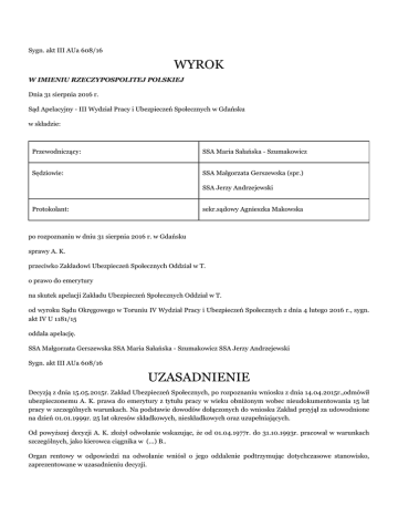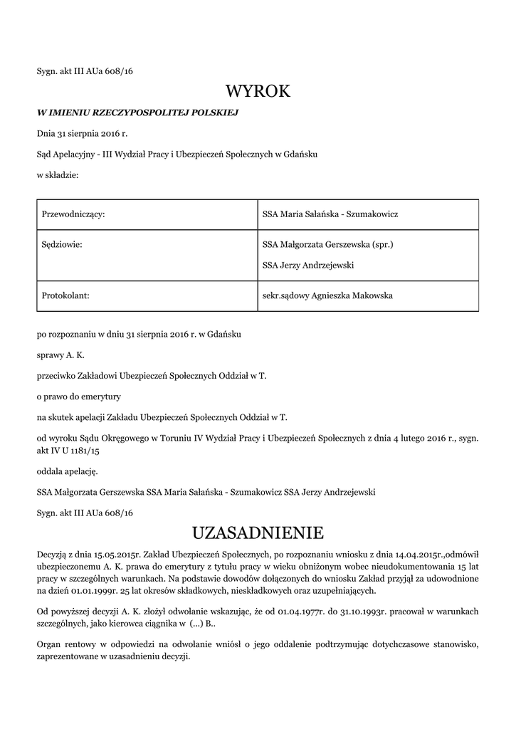 Sygn. akt III AUa 608/16 WYROK W IMIENIU RZECZYPOSPOLITEJ POLSKIEJ Dnia 31 sierpnia 2016 r. Sąd Apelacyjny - III Wydział Pracy i Ubezpieczeń Społecznych w Gdańsku w składzie: Przewodniczący: SSA Maria Sałańska - Szumakowicz Sędziowie: SSA Małgorzata Gerszewska (spr.) SSA Jerzy Andrzejewski Protokolant: sekr.sądowy Agnieszka Makowska po rozpoznaniu w dniu 31 sierpnia 2016 r. w Gdańsku sprawy A. K. przeciwko Zakładowi Ubezpieczeń Społecznych Oddział w T. o prawo do emerytury na skutek apelacji Zakładu Ubezpieczeń Społecznych Oddział w T. od wyroku Sądu Okręgowego w Toruniu IV Wydział Pracy i Ubezpieczeń Społecznych z dnia 4 lutego 2016 r., sygn. akt IV U 1181/15 oddala apelację. SSA Małgorzata Gerszewska SSA Maria Sałańska - Szumakowicz SSA Jerzy Andrzejewski Sygn. akt III AUa 608/16 UZASADNIENIE Decyzją z dnia 15.05.2015r. Zakład Ubezpieczeń Społecznych, po rozpoznaniu wniosku z dnia 14.04.2015r.,odmówił ubezpieczonemu A. K. prawa do emerytury z tytułu pracy w wieku obniżonym wobec nieudokumentowania 15 lat pracy w szczególnych warunkach. Na podstawie dowodów dołączonych do wniosku Zakład przyjął za udowodnione na dzień 01.01.1999r. 25 lat okresów składkowych, nieskładkowych oraz uzupełniających. Od powyższej decyzji A. K. złożył odwołanie wskazując, że od 01.04.1977r. do 31.10.1993r. pracował w warunkach szczególnych, jako kierowca ciągnika w (...) B.. Organ rentowy w odpowiedzi na odwołanie wniósł o jego oddalenie podtrzymując dotychczasowe stanowisko, zaprezentowane w uzasadnieniu decyzji. Wyrokiem z dnia 4.02.2016 roku Sąd Okręgowy w Toruniu zmienił zaskarżoną decyzję ZUS i przyznał A. K. prawo do emerytury poczynając od dnia 27.01.2016r. (pkt I.); nie stwierdził odpowiedzialności organu rentowego za nieustalenie ostatniej okoliczności niezbędnej do wydania decyzji (pkt II). Sąd I instancji rozstrzygnięcie oparł o następujące ustalenia faktyczne oraz rozważania prawne: A. K. urodził się dnia (...) Na dzień 01.01.1999r. udokumentował ogólny staż pracy w wymiarze 25 lat. Do stażu pracy w warunkach szczególnych nie uwzględniono ubezpieczonemu zatrudnienia na stanowisku kierowcy ciągnika w (...) B.. Ubezpieczony wniosek o wykreślenie z rejestru członków OFE i przekazanie środków zgromadzonych na rachunek OFE na dochody budżetu państwa wnioskodawca złożył w organie rentowym 27.01.2016r. W (...) w B. A. K. został zatrudniony 1.04.1977r., jako kierowca ciągnikowy. Prawo jazdy na ciągnik uzyskał w (...) B. dnia 9 maja 1974r. Przed podjęciem pracy w B. zatrudniony był jako kierowca ciągnika w Przedsiębiorstwie Produkcji (...) – Betoniarnia B. od 04.07.1975r. do 30.06.1976r. i w Rolniczej Spółdzielni Produkcyjnej – P. od 01.06.1976r. do 31.03.1977r. (...) B. była to Spółdzielnia prowadząca własną produkcję jak również świadczyła usługi dla rolników. Wnioskodawca pracował w dziale: Zespolone Gospodarstwo Rolne, który zajmował się uprawą oddanej w użytkowanie spółdzielni ziemi. Zespolone gospodarstwo obejmowało uprawę ziemi, zbiórkę plonów i przetwórstwo plonów, hodowle trzody chlewnej i hodowle owiec. Do obowiązków wnioskodawcy należała obsługa maszyn rolniczych takich jak: ciągnik wraz z samobieżnymi maszynami działającymi przy pomocy ciągnika oraz kombajnu. W (...) było 15 ciągników, każdy kierowca miał ciągnik na stanie. Ubezpieczony ciągnikiem wykonywał wszystkie prace polowe tj. bronowanie, siew, opryski, żniwa, zwózka zboża, orał po żniwach, rozsiewał obornik, wykonywał orkę i siew zboża ozimego. Uczestniczył w zbiorach buraków pastewnych. Pracował w pełnym wymiarze czasu pracy. W okresie żniw obsługiwał kombajn. Ciągnikiem wyjeżdżał na pole, gdy nie było mrozu już w styczniu, lutym i pracował do grudnia. Gdy były przestoje, bądź zima wnioskodawca wykonywał prace w transporcie. Woził ciągnikiem obornik, gnojówkę, paszę do tuczarni. Sporadycznie brał udział w strzyżeniu owiec. W warunkach tak jak wyżej pracował do 31.10.1993r. Powyższy stan faktyczny Sąd Okręgowy ustalił na podstawie dokumentów zgromadzonych w aktach sądowych w tym aktach organu rentowego, aktach osobowych wnioskodawcy a także na podstawie zeznań świadków I. M., J. G., P. B. oraz dowodu z przesłuchania ubezpieczonego. Sąd dał wiarę dowodom z dokumentów, gdyż były jasne, pełne, rzetelne, zaś żadna ze stron nie kwestionowała ich autentyczności i mocy dowodowej, a także zeznaniom świadków oraz wnioskodawcy, co do charakteru wykonywanych przez odwołującego czynności w (...) B.. Zeznania te uznał Sąd za spontaniczne, szczere, wzajemnie zgodne i spójne stanowiące miarodajny środek dowodowy do ustalenia faktycznych warunków zatrudnienia wnioskodawcy w spornym okresie. Sąd I instancji miał na uwadze to, że świadkowie pracowali razem z ubezpieczonym w (...) B., zatem mieli niekwestionowane rozeznanie w zakresie obowiązków wykonywanych przez ubezpieczonego. W szczególności świadkowie: G. i B. są niezwykle cenni, jako świadkowie, bowiem wykonywali taką samą pracę jak wnioskodawca i Sąd Okręgowy uznał, iż praca ich winna być zaliczona do pracy w warunkach szczególnych. Otrzymali na tej podstawie prawo do emerytury. Sąd Okręgowy zważył, że istota sporu w niniejszym postępowaniu koncentrowała się wokół ustalenia czy praca świadczona przez wnioskodawcę od 01.04.1977r. do 31.10.1993r. była pracą w szczególnych warunkach, a w konsekwencji, czy wnioskodawca spełnił przesłankę do przyznania prawa do wcześniejszej emerytury. W oparciu o przedstawione dowody Sąd uznał, że wnioskodawca w spornym okresie wykonywał stale i w pełnym wymiarze czasu pracę w szczególnych warunkach jako traktorzysta, a w okresie żniw jako kombajnista. Nie podzielił tym samym poglądu wyrażonego w wyroku Sądu Najwyższego z dnia 3.12.2013r. sygn. I UK 172/13, albowiem prowadzi do tego, że 