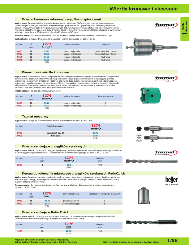 Wiertła kronowe i akcesoria Obróbka skrawaniem Wiertło koronowe udarowe z węglikami spiekanymi 1 Wykonanie: Zestaw stabilnych wierteł koronowych z chwytem SDS-plus lub sześciokątnym chwytem i hartowanym stalowym korpusem z wewnętrznym gwintem M16. Optymalny ruch obrotowy zapewnia czyste otwory, trwałe zęby z węglików spiekanych zapewniają maksymalną stabilność. Wysokowartościowe lutowanie szczelinowe zapewnia dużą trwałość także w twardych materiałach. Dostawa łącznie z wymiennym wiertłem centrującym. Maksymalna głębokość wiercenia 50 mm. Przeznaczenie: Do betonu, kamienia, murów, klinkieru, cegieł, lekkich materiałów budowlanych, itp. Wskazówka: Odpowiednie gniazdo mocujące i wiertło centrujące (nr zam. 1274). nr zam. mm 0650 0800 0651 0801 68 80 68 80 1271 zakres stosowania chwytem 53,20 62,90 55,30 62,90 puszki wyłącznika puszki rozdzielające puszki wyłącznika puszki rozdzielające Sześciokąt SW 12 mm Sześciokąt SW 12 mm SDS-plus SDS-plus (120) Diamentowe wiertło koronowe Wykonanie: Diamentowa puszka do pogłębiania z maksymalnie obciążalnymi diamentowymi krawędziami skrawającymi Zapewnia intensywną abrazję materiału i dużą prędkość wiercenia. Innowacyjna głowica wiertarska o specjalnym skręcanym kształcie zapewnia dużą prędkość skrawania. szybsze odprowadzenie zwierciny i zmniejszone zużycie segmentów. Bardzo precyzyjne i czyste efekty nawet w mokrych bloczkach silikatowych. Optymalne do prac instalacyjnych, dzięki dokładnemu skrawaniu przy wierceniu na sucho, z małym zużyciem. Maksymalna głębokość wiercenia 60 mm. Przeznaczenie: Do cegieł silikatowych, murów. nr zam. mm 0680 0820 68 82 1274 zakres stosowania ilość segmentów 89,40 98,00 puszki wyłącznika puszki rozdzielające 3 4 (120) Trzpień mocujący Wykonanie: Chwyt do diamentowych wierteł koronowych (nr zam. 1271/1274). nr zam. trzpień mocujący 1274 0005 0006 Sześciokąt SW 12 SDS-plus 15,00 20,00 (120) Wiertło centrujące z węglików spiekanych Wykonanie: Wiertło centrujące z węglika spiekanego, stabilne wykonanie, do szybkiego i pewnego nawiercania na wszystkich powierzchniach. Dopasowane do uchwytu mocującego (nr zam. 1271/1274). nr zam. mm 0008 9 1274 4,03 długość mm 120 (120) Korona do wiercenia udarowego z węglików spiekanych RatioQuick Wykonanie: Powiększone odprowadzanie miału poprzez przemienne ustawienie zębów płaskich i ukośnych. Bardzo szybki postęp, idealne połączenie dłutowania i wiercenia w jednym przejściu, duża wydajność pracy także w betonie zbrojeniowym. Przeznaczenie: Do betonu, kamienia, murów, marmuru, klinkieru. Stosowanie z wiertłem centrującym (nr zam. 1276 1000). nr zam. mm 0065 0080 65 80 1276 zakres stosowania liczba zębów z węglików piekanych 166,26 199,54 puszki wyłącznika puszki rozdzielające 6 8 (119) Wiertło centrujące Ratio Quick Wykonanie: Wiertło centrujące w wykonaniu stabilnym do nawiercania na wszystkich powierzchniach. Do korony do wiercenia udarowego z węglików spiekanych Ratio Quick. nr zam. mm 1000 12 1276 28,43 długość mm 155 (119) Artykuły oznaczone znakiem ◊ nie są w magazynie. Zakup tych artykułów realizowany jest w krótkim terminie. Nie wszystkie artykuły są dostępne w każdym kraju. 1/85 Przedłużki/Wiertła/Piły otworowe i akcesoria 1 Obróbka skrawaniem Wiertło zbrojeniowe RebarCutter Wykonanie: Z wpuszczonymi i pojedynczo lutowanymi zębami z węglików spiekanych. Ponadto wiertło dysponuje zintegrowanym mechanizmem wyrzucającym do łatwego wyjmowania zbrojenia z głowicy wiertarskiej. Chwyt posiada gwint do szybkiej wymiany wiertła zbrojeniowego na wiertło udarowe. Przeznaczenie: Zastępując adapter Ratio wiertłem SDS plus, w 100% przydatne do wiercenia udarowego. Idealne do betonu zbrojonego ze standardowym zbrojeniem budowlanym. Wiertło udarowe trafia na zbrojenie. Zastosowane wiertło zbrojeniowe przechodzi przez zbrojenie. Następnie ponownie wprowadza się wiertło udarowe i wiercenie można kontynuować. Wskazówka: Zbrojenia wolno przecinać tylko za zgodą statyka budowlanego. nr zam. mm 0120 0140 0160 0180 0200 0250 0280 0300 12 14 16 18 20 25 28 30 1266 głębokość wiercenia mm długość całkowita mm 190 190 190 190 190 190 190 190 230 230 230 230 230 230 230 230 130,01 130,01 156,96 168,07 171,44 195,23 200,41 211,87 (119) Adapter do wiertła zbrojeniowego Ratio Quick Przeznaczenie: Do wiertła zbrojeniowego RebarCutter (nr zam. 1266) i w koronie z węglików spiekanych do wiercenia udarowego (nr zam. 1276) w młotowiertarkach SDS-plus lub SDS-max. nr zam. trzpień mocujący 1267 0010 0020 SDS-plus SDS-max 49,52 49,52 długość mm 108 185 (119) Otwornice uniwersalne Allmat Wykonanie: Wysoka korona wiertarska ze stabilnym korpusem, zeszlifowana ze wszystkich stron, nadające się do ostrzenia zęby z węglików spiekanych. Duża przestrzeń na wióry zapewnia szybsze odprowadzenie zwierciny, bez zakleszczania. Dodatkowo produkty wiercenia można łatwo usunąć. Maksymalna głębokość wiercenia 65 mm. Przeznaczenie: Idealne do montażu puszek gniazd wtykowych i odgałęźnych. Dzięki wysokiej i stabilnej głowicy wiertarskiej gniazda wtykowe pogłębiane są w jednym przejściu i bez zwichrowania. Zaszlifowane zęby zapobiegają przypaleniu się przy wierceniu w drewnie. Odpowiednie do dużej ilości materiałów, jak aluminium, izolacja, gazobeton, płyty kartonowo-gipsowe, drewno i bloczki silikatowe. Do stosowania na maszynach z gniazdem SDS-plus i gniazdem sześciokątnym. nr zam. mm 0680 0820 68 82 1275 zakres stosowania 47,10 60,56 puszki wyłącznika puszki rozdzielające (121) Uchwyt mocujący Allmat Przeznaczenie: Zabierak sześciokątny do otwornicy uniwersalnej Allmat (nr zam. 1275). nr zam. trzpień mocujący 1275 0050 0055 Sześciokąt SDS-plus 14,75 14,75 (121) Wiertło centrujące Allmat Wykonanie: Wiertło centrujące z węglika spiekanego, stabilne wykonanie. Do szybkiego i pewnego nawie