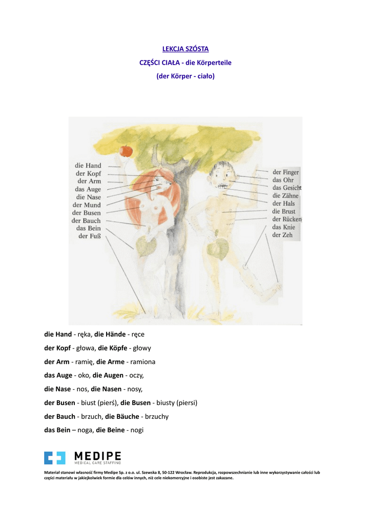 LEKCJA SZÓSTA CZĘŚCI CIAŁA - die Körperteile (der Körper - ciało) die Hand - ręka, die Hände - ręce der Kopf - głowa, die Köpfe - głowy der Arm - ramię, die Arme - ramiona das Auge - oko, die Augen - oczy, die Nase - nos, die Nasen - nosy, der Busen - biust (pierś), die Busen - biusty (piersi) der Bauch - brzuch, die Bäuche - brzuchy das Bein – noga, die Beine - nogi Materiał stanowi własność firmy Medipe Sp. z o.o. ul. Szewska 8, 50-122 Wrocław. Reprodukcja, rozpowszechnianie lub inne wykorzystywanie całości lub części materiału w jakiejkolwiek formie dla celów innych, niż cele niekomercyjne i osobiste jest zakazane. der Fuβ - stopa, die Füβe - stopy der Finger - palec, die Finger - palce das Ohr - ucho, die Ohren - uszy das Gesicht - twarz, die Gesichter - twarze der Zahn - ząb, die Zähne - zęby der Hals - gardło, die Hälse - gardła die Brust - klatka piersiowa, die Brüste - klatki piersiowe der Rücken - plecy das Knie - kolano, die Knie - kolana der Zeh - palec, ale tylko u stopy, die Zehen - palce u stopy Czas na przysłowia: Der Krug grht so lange zum Brunnen, bis er bricht. - Dopóty dzban wodę nosi, dopóki ucho mu się nie urwie. Einem geschenkten Gaul guckt man nicht ins Maul. - Darowanemu koniowi nie zagląda się w zęby. Materiał stanowi własność firmy Medipe Sp. z o.o. ul. Szewska 8, 50-122 Wrocław. Reprodukcja, rozpowszechnianie lub inne wykorzystywanie całości lub części materiału w jakiejkolwiek formie dla celów innych, niż cele niekomercyjne i osobiste jest zakazane.