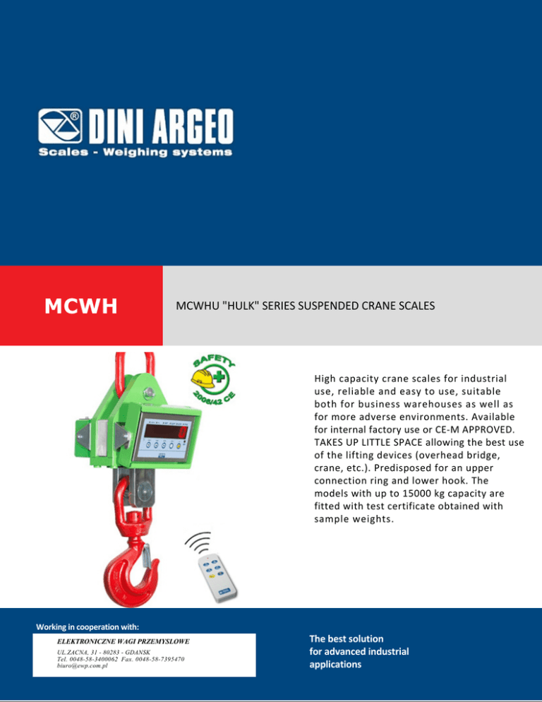 MCWH MCWHU "HULK" SERIES SUSPENDED CRANE SCALES High capacity crane scales for industrial use, reliable and easy to use, suitable both for business warehouses as well as for more adverse environments. Available for internal factory use or CE-M APPROVED. TAKES UP LITTLE SPACE allowing the best use of the lifting devices (overhead bridge, crane, etc.). Predisposed for an upper connection ring and lower hook. The models with up to 15000 kg capacity are fitted with test certificate obtained with sample weights. Working in cooperation with: ELEKTRONICZNE WAGI PRZEMYSLOWE UL.ZACNA, 31 - 80283 - GDANSK Tel. 0048-58-3400062 Fax. 0048-58-7395470 [email protected] The best solution for advanced industrial applications MAIN FEATURES 40 mm RED LED display. Waterproof keyboard with 5 keys which are ZERO, AUTOMATIC TARE, MODE, PRINT, and ON/OFF. Protective screen in plexiglas for display and keyboard. Precision: +/- 0.05% F.S. Built extremely sturdy in oven-fire painted sheet steel, with I P 6 7 protection degree against dust and sprays. Weighs about 86 kg. Radiofrequency 6-key remote control, 433MHz, for use up to 50 m of distance. Configurable as automatic tare only or as a remote keypad. Fitted with extractable rechargeable battery pack, with 60-hour operating time, designed to be combined with MCWHBK option for 24/7 continuous use of the crane scale. Standard fitted with battery charger. Digital set-up and calibration programmable directly from keyboard using a sample weight. Operating temperature: -10 /+80ºC, with optional thermal shield (-10/+40ºC for the CE-M approved model). Programmable digital filter and auto power saving function. Equipped with 230 Vac 50 Hz battery charger, for charging the battery from the crane scale. SELECTABLE FUNCTIONS High Resolution Weighing x 10. Net/Gross or lb/kg conversion. Accumulation. +/- Checkweighing. Percentage weighing. Counting. HOLD (lock of the displayed weight). PEAK (maximum value read). Peer-to-peer. AVAILABLE FUNCTIONS FROM REMOTE CONTROL Zero; tare; enable / disable function; print; switch-off. WEIGHTS OF THE CRANE SCALES Weight in kg Models without including packing packing MCWHU10 MCWHU15 MCWHU25 MCWHU35 73 kg 86 kg OPTIONS ONLY AVAILABLE AT TIME OF ORDER Radio frequency transmission to remote indicator up to 70 m indoors. WI-FI interface. Thermal shield for protection from infrared rays and high temperatures. Remote weight indicator (see DFW.., 3590.., TRS.., DGT.. series weight indicators) with printer or other accessories connected through radio frequency. Separate 230 Vac 50 Hz recharging station for 24/7 continuous use, made up of additional battery pack and adapter for the external recharge of the battery. Date and Time. ACCREDIA calibration certificate according to OIML/ASTM standards. DETAIL 1 DETAIL 2 Fitted with extractable rechargeable battery pack. MCWHU: view of the back. DETAIL 3 Reinforced base. DETAIL 4 Protective screen in plexiglas for display and keyboard. VERSIONS Versioni disponibili Max d Codice (kg) (kg) (kg) MCWHU10-2 10000 2 -- MCWHU15-2 15000 2 -- MCWHU25-2 25000 5 -- MCWHU35-2 35000 10 -- MCWHU10M-2 10000 -- 10 MCWHU15M-2 15000 -- 10 ELEKTRONICZNE WAGI PRZEMYSLOWE UL.ZACNA, 31 - 80283 - GDANSK Tel. 0048-58-3400062 Fax. 0048-58-7395470 [email protected] SALES AND TECHNICAL ASSISTANCE SERVICE