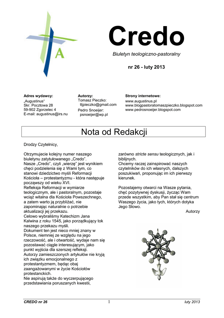 Credo Biuletyn teologiczno-pastoralny nr 26 - luty 2013 Adres wydawcy: „Augustinus“ Skr. Pocztowa 28 59-902 Zgorzelec 4 E-mail: [email protected] Autorzy: Tomasz Pieczko: [email protected] Pedro Snoeijer: [email protected] Strony internetowe: www.augustinus.pl www.blogpastoratomaszpieczko.blogspot.com www.pedrosnoeijer.blogspot.com Nota od Redakcji Drodzy Czytelnicy, zarówno stricte sensu teologicznych, jak i biblijnych. Chcemy raczej zainspirować naszych czytelników do ich własnych, dalszych poszukiwań, proponując im ich pierwszy kierunek. Otrzymujecie kolejny numer naszego biuletynu zatytułowanego „Credo”. Nasze „Credo”, czyli „wierzę” jest wynikiem chęci podzielenia się z Wami tym, co stanowi dziedzictwo myśli Reformacji Kościoła – protestantyzmu - która następuje począwszy od wieku XVI. Refleksja Reformacji w wymiarze teologicznym, ale i pastoralnym, pozostaje wciąż witalna dla Kościoła Powszechnego, a zatem warto ją przybliżać, nie zapominając naturalnie o potrzebie aktualizacji jej przekazu. Celowo wybraliśmy Katechizm Jana Kalwina z roku 1545, jako porządkujący tok naszego przekazu myśli. Dokument ten jest nieco mniej znany w Polsce, niemniej ze względu na jego rzeczowość, ale i otwartość, wydaje nam się pozostawać ciągle interesującym, jako punkt wyjścia dla szerszej refleksji. Autorzy zamieszczonych artykułów nie kryją ich związku emocjonalnego z protestantyzmem, będąc obaj zaangażowanymi w życie Kościołów protestanckich. Nie aspirują także do wyczerpującego przedstawiania poruszanych kwestii, CREDO nr 26 Pozostajemy otwarci na Wasze pytania, chęć pozytywnej dyskusji, życząc Wam przede wszystkim, aby Pan stał się centrum Waszego życia, jako tych, których dotyka Jego Słowo. Autorzy 1 luty 2013 Katechizm Genewski 1545 - Niedziela XXVI Dziecko: Zostało ono nadane z trzech racji. Dwudziesta szósta niedziela Czwarte przykazanie 171. Minister: Jakie one są? Dziecko: Aby dać obraz/figurę odpoczynku duchowego, aby zapewnić dyscyplinę kościelną i aby dać ulgę sługom. 166. Minister: Przejdźmy do czwartego. Dziecko: „Pamiętaj o dniu szabatu, aby go uświęcić. Sześć dni będziesz pracować i wykonywać wszystkie twe zajęcia. Dzień zaś siódmy jest szabatem ku czci Pana, Boga twego. Nie możesz przeto w dniu tym wykonywać żadnej pracy ani ty sam, ani syn twój, ani twoja córka, ani twój niewolnik, ani twoja niewolnica, ani twoje bydło, ani cudzoziemiec, który mieszka pośród twych bram. W sześciu dniach bowiem uczynił Pan niebo, ziemię, morze oraz wszystko, co jest w nich, w siódmym zaś dniu odpoczął. Dlatego pobłogosławił Pan dzień szabatu i uznał go za święty.”. 172. Minister: Czym jest ten odpoczynek duchowy? Dziecko: Jest to zaprzestanie naszych własnych dzieł, aby Pan mógł w nas działać. 173. Minister: Jak to się czyni? Dziecko: Umartwiając nasze ciało, to znaczy wyrzekając się naszej natury, aby Bóg mógł nami kierować przez swego Ducha. 167. Minister: Czy nakazuje ono pracować sześć dni tygodnia, by odpocząć siódmego? Dziecko: Nie tylko. Bóg pozwala na pracę podczas sześciu dni, ale rezerwuje siódmy na odpoczynek. 174. Minister: Czy ma się tak czynić tylko jeden dzień w tygodniu? Dziecko: Należy robić tak w sposób stały, ponieważ od kiedy rozpoczęliśmy, winniśmy kontynuować to przez całe nasze życie. 168. Minister: Czy zakazuje nam wszelką pracę tego dnia? Dziecko: To przykazanie wymaga specjalnego wytłumaczenia, ponieważ zachowanie odpoczynku stanowi część nakazów rytualnych starego prawa, które przez przyjście Jezusa Chrystusa zostało zniesione. 175. Minister: Dlaczego zatem jeden dzień dzień jest przeznaczony by to obrazować? Dziecko: Nie jest wymaganym, aby figura była całkowicie podobna do prawdy, ale wystarczy, aby było w niej jakieś podobieństwo. 176. Minister: Dlaczego to siódmy dzień został nakazany, a nie jakiś inny? Dziecko: Liczba siedem oznacza doskonałość w Piśmie, a więc służy oznaczeniu wieczności. Poucza nas także, że nasz odpoczynek duchowy w tym życiu obecnym ledwie się rozpoczął i nigdy nie będzie doskonały, jak dopiero wtedy, kiedy odejdziemy z tego świata. 169. Minister: Czy chcesz powiedzieć, że przykazanie to przynależy szczególnie Żydom i zostało dane na czas Starego Testamentu? Dziecko: Właśnie, przynajmniej jako prawo rytualne. 170. Minister: Jakże zatem? Czy jest jeszcze coś w nim poza prawem rytualnym, ceremonii? CREDO nr 26 tł. Tomasz Pieczko 2 luty 2013 Studium Biblijne: Ks. Wyjścia (2 Mojż. 20,8-11 i Ks. Powtórzonego Prawa (5 Mojż.) 5,12-15 8 Pamiętaj o dniu sabatu, aby go święcić. 9 Sześć dni będziesz pracował i wykonywał wszelką swoją pracę, 10 ale siódmego dnia jest sabat Pana, Boga twego: Nie będziesz wykonywał żadnej pracy ani ty, ani twój syn, ani twoja córka, ani twój sługa, ani twoja służebnica, ani twoje bydło, ani obcy przybysz, który mieszka w twoich bramach. 11 Gdyż w sześciu dniach uczynił Pan niebo i ziemię, morze i wszystko, co w nich jest, a siódmego dnia odpoczął. Dlatego Pan pobłogosławił dzień sabatu i poświęcił go. Ks. Wyjścia (2 Mojż.) 20,8-11 12 Przestrzegaj dnia sabatu, aby go święcić, jak rozkazał ci Pan, twój Bóg. 13 Sześć dni będziesz pracował i wykonywał wszelką twoją pracę, 14 ale siódmego dnia jest sabat Pana, twojego Boga. Nie będziesz wykonywał żadnej pracy ani ty, ani twój syn, ani twoja córka, ani twój sługa, ani twoja służąca, ani twój wół, ani twój osioł, ani twoje bydlę, ani obcy przybysz, który mieszka w twoich bramach, aby odpoczął twój sługa i twoja służebnica tak jak ty. 15 Pamiętaj, że byłeś niewolnikiem w ziemi egipskiej i że Pan, twój Bóg, wyprowadził cię stamtąd ręką możną i ramieniem wyciągniętym. Dlatego rozkazał ci Pan, twój Bóg, abyś obchodził dzień sabatu. Ks. Powtórzonego Prawa (5 Mojż.) 5,