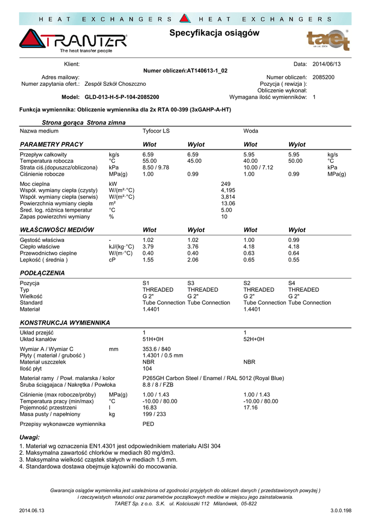 ` Specyfikacja osiągów ` Klient: Data: 2014/06/13 Numer obliczeń:AT140613-1_02 Numer obliczeń: 2085200 Pozycja ( rewizja ): Obliczenie wykonał: Wymagana ilość wymienników: 1 Adres mailowy: Numer zapytania ofert.: Zespół Szkół Choszczno Model: GLD-013-H-5-P-104-2085200 Funkcja wymiennika: Obliczenie wymiennika dla 2x RTA 00-399 (3xGAHP-A-HT) Strona gorąca Strona zimna Nazwa medium Tyfocor LS PARAMETRY PRACY Wlot Wylot Wlot Wylot 6.59 55.00 8.50 / 9.78 1.00 6.59 45.00 5.95 40.00 10.00 / 7.12 1.00 5.95 50.00 Przepływ całkowity Temperatura robocza Strata ciś.(dopuszcz/obliczona) Ciśnienie robocze kg/s °C kPa MPa(g) Moc cieplna Współ. wymiany ciepła (czysty) Współ. wymiany ciepła (serwis) Powierzchnia wymiany ciepła Śred. log. różnica temperatur Zapas powierzchni wymiany kW W/(m²·°C) W/(m²·°C) m² °C % WŁAŚCIWOŚCI MEDIÓW Gęstość właściwa Ciepło właściwe Przewodnictwo cieplne Lepkość ( średnia ) kJ/(kg·°C) W/(m·°C) cP Woda 0.99 0.99 kg/s °C kPa MPa(g) 249 4,195 3,814 13.06 5.00 10 Wlot Wylot Wlot Wylot 1.02 3.79 0.40 1.55 1.02 3.76 0.40 2.06 1.00 4.18 0.63 0.65 0.99 4.18 0.64 0.55 S1 THREADED G 2" Tube Connection 1.4401 S3 THREADED G 2" Tube Connection S2 THREADED G 2" Tube Connection 1.4401 S4 THREADED G 2" Tube Connection PODŁĄCZENIA Pozycja Typ Wielkość Standard Materiał KONSTRUKCJA WYMIENNIKA Układ przejść Układ kanałów Wymiar A / Wymiar C Płyty ( materiał / grubość ) Materiał uszczelek Ilość płyt 1 51H+0H mm 353.6 / 840 1.4301 / 0.5 mm NBR 104 1 52H+0H NBR Materiał ramy / Powł. malarska / kolor Śruba ściągajaca / Nakrętka / Powłoka P265GH Carbon Steel / Enamel / RAL 5012 (Royal Blue) 8.8 / 8 / FZB Ciśnienie (max robocze/próby) Temperatura pracy (min/max) Pojemność przestrzeni Masa pusty / napełniony 1.00 / 1.43 -10.00 / 80.00 16.83 199 / 233 Przepisy wykonawcze wymiennika MPa(g) °C l kg 1.00 / 1.43 -10.00 / 80.00 17.16 PED Uwagi: 1. Materiał wg oznaczenia EN1.4301 jest odpowiednikiem materiału AISI 304 2. Maksymalna zawartość chlorków w mediach 80 mg/dm3. 3. Maksymalna wielkość cząstek stałych w mediach 1,5 mm. 4. Standardowa dostawa obejmuje kątowniki do mocowania. Gwarancja osiągów wymiennika jest uzależniona od zgodności przyjętych do obliczeń danych ( przedstawionych powyżej ) i rzeczywistych własności oraz parametrów początkowych mediów w miejscu jego zainstalowania. TARET Sp. z o.o. S.K. ul. Kościuszki 112 Milanówek, 05-822 2014.06.13 3.0.0.198 Wymiary gabarytowe wymiennika płytowego uszczelkowego : GLD-013-H-5-P-104-2085200 Numer obliczeń 2085200 Podane wymiary są orientacyjne i nie mogą być użyte do celów projektowych Niniejszy dokument stanowi własność intelektualną firmy TARET Sp. z o.o. S.K. i nie może być powielany i kolportowany bez zgody wystawcy dokumentu firmy TARET Sp. z o.o. S.K..