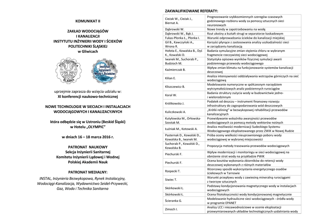 ZAKWALIFIKOWANE REFERATY: KOMUNIKAT II ZAKŁAD WODOCIĄGÓW I KANALIZACJI INSTYTUTU INŻYNIERII WODY I ŚCIEKÓW POLITECHNIKI ŚLĄSKIEJ w Gliwicach Cieżak W., Cieżak J., Biernat A. Dąbrowski W. Dąbrowski W., Bąk J. Fukas-Płonka Ł., Płonka I. Gil B., Kawczyński A., Wrona R. Hołota E., Kowalska B., Dyś K., Kowalski D. Iwanek M., Suchorab P., Budzioch M. Kaźmierczak B. Kilian E. Kliszczewicz B. uprzejmie zaprasza do wzięcia udziału w: XI konferencji naukowo-technicznej NOWE TECHNOLOGIE W SIECIACH I INSTALACJACH WODOCIĄGOWYCH I KANALIZACYJNYCH która odbędzie się w Ustroniu (Beskid Śląski) w Hotelu „OLYMPIC” w dniach 16 – 18 marca 2016 r. PATRONAT NAUKOWY Sekcja Inżynierii Sanitarnej Komitetu Inżynierii Lądowej i Wodnej Polskiej Akademii Nauk PATRONAT MEDIALNY: INSTAL, Inżynieria Bezwykopowa, Rynek Instalacyjny, Wodociągi-Kanalizacja, Wydawnictwo Seidel-Przywecki, Gaz, Woda i Technika Sanitarna Koral W. Królikowska J. Kuliczkowski A. Kutyłowska M., OrłowskaSzostak M. Łuźniak M., Kotowski A. Pasternak D., Kowalski D., Kowalska B., Iwanek M. Suchorab P., Kowalski D., Kowalska B. Piechurski F. Piechurski F. Rzepecki T. Siwiec T. Skórkowski Ł. Skórkowski Ł. Ścieranka G. Zimoch I. Prognozowanie szybkozmiennych szeregów czasowych godzinowego rozbioru wody za pomocą sztucznych sieci neuronowych Nowe trendy w zapotrzebowaniu na wodę Rzut ukośny a kształt strugi w separatorze kaskadowym Warunki odprowadzania ścieków do kanalizacji miejskiej Korzyści płynące z zastosowania analizy uszkadzalności sieci w zarządzaniu kanalizacją Badania symulacyjne zmian stężenia chloru w wybranym fragmencie rzeczywistej sieci wodociągowej Statystyka opisowa wyników fizycznej symulacji awarii podziemnego przewodu wodociągowego Wpływ zmian klimatu na funkcjonowanie systemów kanalizacji deszczowej Analiza intensywności oddziaływania wstrząsów górniczych na sieć wodociągową Modelowanie numeryczne w spółczesnym narzędziem wytrzymałościowych analiz podziemnych rurociągów Badania struktury zużycia wody w budownictwie jednoi wielorodzinnym Podatek od deszczu – instrument finansowy rozwoju infrastruktury do zagospodarowania wód deszczowych „Krótki relining” w bezwykopowej rehabilitacji przewodów kanalizacyjnych Przewidywanie wskaźnika awaryjności przewodów wodociągowych za pomocą metody wektorów nośnych Analiza możliwości modernizacji Sudeckiego Systemu Wodociągowego eksploatowanego przez ZWiK w Nowej Rudzie Próba oceny wielkości nieuprawnionego poboru wody wodociągowej w wybranej miejscowości Propozycja metody trasowania przewodów wodociągowych Wpływ modernizacji i monitoringu w sieci wodociągowej na obniżenie strat wody na przykładzie PWIK Ocena kosztów wykonania zbiorników do retencji wody deszczowej wykonanych z różnych materiałów Wzorcowy sposób wykorzystania energetycznego osadów ściekowych w Tarnowie Warunki przepływu wody z zawiesiną mineralną rurociągami z tworzyw sztucznych Podstawy kondycjonowania magnetycznego wody w instalacjach wodociągowych Ocena fitotoksyczności wody kondycjonowanej magnetycznie Modelowanie hydrauliczne sieci wodociągowych --źródła wody w programie EPANET Analizy LCC i niezawodnościowe w ocenie eksploatacji przewymiarowanych układów technologicznych uzdatniania wody KOSZTY KOMUNIKAT: Kwietniewski M., Żubrowska-Sudoł M.: Krajowa Inteligentna Specjalizacja w zakresie innowacyjnych rozwiązań i technologii w gospodarce wodno-ściekowej oraz PREZENTACJE FIRM BRANŻOWYCH DOJAZD I ZAKWATEROWANIE Dojazd do Ustronia pociągiem lub autobusem PKS. Samochodem – z Katowic - kierunek Wisła, Hotel OLYMPIC**** ul. Grażyńskiego 10, 43 - 450 Ustroń (Ustroń Zawodzie) www.hotelolympic.pl Recepcja Tel.: +48 33 854 43 33 Fax +48 33 854 43 32 [email protected] RAMOWY PROGRAM KONFERENCJI 16.03.2016 (środa) od godz. 14.00 zakwaterowanie od godz. 15.30 rejestracja uczestników konferencji ok. 16.30 do 18.30 otwarcie konferencji i obrady od godz. 19.00 kolacja 17.03.2016 (czwartek) od godz. 7.30 śniadanie 9.00 – 17.00 obrady 14.00 – 15.30 obiad ok. 18.00 spotkanie koleżeńskie i kolacja regionalna 18.03.2016 (piątek) od godz. 7.30 śniadanie 9.00 – 12.30 obrady i zakończenie konferencji ok. 13.00 obiad Obrady odbywać się będą w sali konferencyjnej hotelu OLYMPIC. Koszt uczestnictwa w konferencji z noclegiem w pokoju 2-osobowym wynosi 1250 zł i obejmuje: materiały konferencyjne, dwa noclegi, pełne wyżywienie w hotelu, udział w spotkaniu koleżeńskim i kolacji regionalnej. Dopłata do noclegu w pokoju 1-osobowym wynosi 150 zł. PROPONUJEMY NASTĘPUJĄCE FORMY UDZIAŁU W KONFERENCJI: uczestnictwo w konferencji, prezentacja firmy, wygłoszenie referatu sponsorowanego, zamieszczenie ogłoszenia reklamowego w pracy zbiorowej, ekspozycja na stoisku firmowym. Dodatkowe informacje: Przedłużenie pobytu, korzystanie z baru, dodatkowych posiłków i napojów poza ustalonym menu, kodowanej TV, atrakcji hotelowych i parkingu płatne we własnym zakresie. Szczegółowy program konferencji otrzymają Państwo wraz z materiałami konferencyjnymi przy rejestracji. ADRES ORGANIZATORA KONFERENCJI: Politechnika Śląska Instytut Inżynierii Wody i Ścieków ul. Konarskiego 18 44-100 GLIWICE fax: 32 237-21-73, tel.: 32 237 22 43, 605 686 142 e-mail: [email protected] Nr konta bankowego organizatora konferencji: Politechnika Śląska ING BANK ŚLĄSKI S.A. 60 1050 1230 1000 0002 0211 3056 W tytule wpłaty należy podać: tytuł konferencji, nazwę jednostki wpłacającej, imię i nazwisko uczestnika