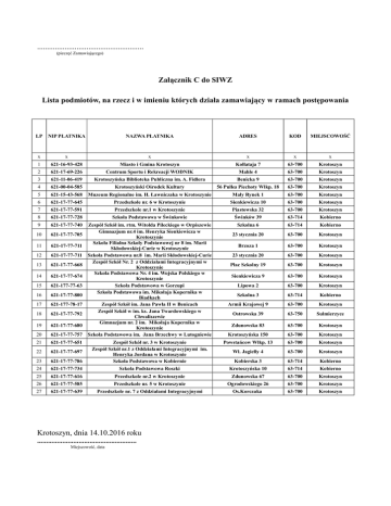 ...................................................... (pieczęć Zamawiającego) Załącznik C do SIWZ Lista podmiotów, na rzecz i w imieniu których działa zamawiający w ramach postępowania LP NIP PŁATNIKA NAZWA PŁATNIKA ADRES KOD MIEJSCOWOŚĆ x x x x x x 1 621-16-93-428 Miasto i Gmina Krotoszyn Kołłataja 7 63-700 Krotoszyn 2 621-17-69-226 Centrum Sportu i Rekreacji WODNIK Mahle 4 63-700 Krotoszyn 3 621-11-06-419 Krotoszyńska Biblioteka Publiczna im. A. Fidlera Benicka 9 63-700 Krotoszyn 4 621-00-04-585 Krotoszyński Ośrodek Kultury 56 Pułku Piechoty Wlkp. 18 63-700 Krotoszyn 5 621-15-43-568 Muzeum Regionalne im. H. Ławniczaka w Krotoszynie Mały Rynek 1 63-700 Krotoszyn 6 621-17-77-645 Przedszkole nr. 6 w Krotoszynie Sienkiewicza 10 63-700 Krotoszyn 7 621-17-77-591 Przedszkole nr.1 w Krotoszynie Piastowska 32 63-700 Krotoszyn 8 621-17-77-728 Szkoła Podstawowa w Świnkowie Świnków 39 63-714 Kobierno 9 621-17-77-740 Szkolna 6 63-714 Kobierno 10 621-17-77-705 23 stycznia 20 63-700 Krotoszyn 11 621-17-77-711 Brzoza 1 63-700 Krotoszyn 12 621-17-77-711 23 stycznia 20 63-700 Krotoszyn 13 621-17-77-668 Plac Szkolny 19 63-700 Krotoszyn 14 621-17-77-674 Sienkiewicza 9 63-700 Krotoszyn 15 621-177-77-63 Lipowa 2 63-700 Krotoszyn 16 621-17-77-800 Szkolna 3 63-714 Kobierno 17 621-177-78-17 Armii Krajowej 9 63-700 Krotoszyn 18 621-17-77-792 Ostrowska 39 63-750 Sulmierzyce 19 621-17-77-680 Zdunowska 83 63-700 Krotoszyn 20 621-17-77-757 Zespół Szkół im. rtm. Witolda Pileckiego w Orpiszewie Gimnazjum nr.4 im. Henryka Sienkiewicza w Krotoszynie Szkoła Filialna Szkoły Podstawowej nr 8 im. Marii Skłodowskiej-Curie w Krotoszynie Szkoła Podstawowa nr.8 im. Marii Skłodowskiej-Curie Zespół Szkół Nr. 2 z Oddziałami Integracyjnymi w Krotoszynie Szkoła Podstawowa Nr. 4 im. Wojska Polskiego w Krotoszynie Szkoła Podstawowa w Gorzupi Szkoła Podstawowa im. Mikołaja Kopernika w Biadkach Zespół Szkół im. Jana Pawła II w Benicach Zespół Szkół w im. ks. Jana Twardowskiego w Chwaliszewie Gimnazjum nr. 2 im. Mikołaja Kopernika w Krotoszynie Szkoła Podstawowa im. Jana Brzechwy w Lutogniewie Krotoszyńska 150 63-700 Krotoszyn Zespół Szkół nr. 3 w Krotoszynie Zespół Szkół nr.1 z Oddziałami Integracyjnymi im. Henryka Jordana w Krotoszynie Szkoła Podstawowa w Kobiernie Powstańcow Wlkp. 13 63-700 Krotoszyn Wł. Jagiełły 4 63-700 Krotoszyn Kobierska 3 63-714 Kobierno 21 621-17-77-651 22 621-17-77-697 23 621-17-77-786 24 621-17-77-734 Szkoła Podstawowa Roszki Krotoszyńska 10 63-714 Kobierno 25 621-17-77-616 Przedszkole nr.2 w Krotoszynie Zdunowska 67 63-700 Krotoszyn 26 621-17-77-585 Przedszkole nr. 5 w Krotoszynie Ogrodowskiego 26 63-700 Krotoszyn 27 621-17-77-639 Przedszkole nr. 7 z Oddziałami Integracyjnymi Os.Korczaka 63-700 Krotoszyn Krotoszyn, dnia 14.10.2016 roku ....................................................... Miejscowość, data