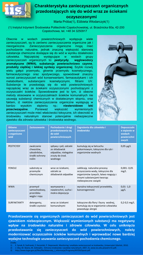 Charakterystyka zanieczyszczeń organicznych przedostających się do wód wraz ze ściekami oczyszczonymi Marta Próba(1), Elżbieta Włodarczyk(1) (1) Instytut Inżynierii Środowiska Politechniki Częstochowskiej, ul. Brzeźnicka 60a, 42-200 Częstochowa, tel. +48 34 3250917 Obecnie w wodach powierzchniowych występuje wiele zanieczyszczeń, są to zarówno zanieczyszczenia organiczne jak i nieorganiczne. Zanieczyszczenia organiczne mogą mieć pochodzenie naturalne, jednak znaczną większość stanowią substancje chemiczne dostające się do wód w wyniku działalności człowieka. Najczęściej występujące w wodach grupy zanieczyszczeń organicznych to: pestycydy, węglowodory aromatyczne (WWA), substancje powierzchniowo czynne, produkty ciężkiej i lekkiej syntezy organicznej. Szybki rozwój wielu gałęzi przemysłu, głownie przemysłu kosmetycznego, farmaceutycznego oraz spożywczego, spowodował znaczny wzrost zanieczyszczeń wód konserwantami, farmaceutykami i ich metabolitami, substancjami kosmetycznymi, filtrami UV. Substancje te przedostają się do wód powierzchniowych najczęściej wraz ze ściekami oczyszczonymi pochodzącymi z oczyszczalni ścieków. Spowodowane jest to tym, iż obecne metody stosowane w oczyszczalniach ścieków komunalnych nie usuwają substancji chemicznych w dostatecznym stopniu, oraz faktem, iż niektóre zanieczyszczenia organiczne występują w bardzo wysokim stężeniu np.: niesteroidowe leki przeciwzapalne. Ponieważ większość wymienionych zanieczyszczeń może mieć właściwości toksyczne, ich obecność w środowisku naturalnym stanowi potencjalnie niebezpieczne zjawisko dla zdrowia człowieka i środowiska wodnego. Główne zanieczyszczeni a organiczne wód Zastosowanie Pochodzenie i drogi przedostawania się do wód powierzchniowych Zagrożenia dla człowieka i środowiska Dopuszczaln e stężenie w wodach powierzchni owych PESTYCYDY zwalczanie chwastów, szkodników, środki ochrony roślin spływy z pól, odcieki ze składowisk odpadów, nielegalne zrzuty do środ. wodnego kumulują się w łańcuchu pokarmowym, toksyczne dla ryb i organizmów wodnych 0,05 μg/L FENOLE substraty w przemyśle chemicznym wraz ze ściekami, odcieki ze składowisk odpadów zakłócają naturalne procesy oczyszczania wody, toksyczne dla organizmów żywych, łatwo reagują z innymi substancjami tworząc niebezpieczne związki 0,001- 0,05 mg/L WWA przemysł samochodowy, przeróbka węgla i ropy wymywanie z nawierzchni, sucha i mokra depozycja wyraźna toksyczność przewlekła, kancerogenność 0,01- 1,0 μg/L SURFAKTANTY detergenty, środki czystości wraz ze ściekami komunalnymi toksyczne dla flory i fauny wodnej, kumulują się w organizmie człowieka powodując alergie 0,2-0,5 mg/L Przedostawanie się organicznych zanieczyszczeń do wód powierzchniowych jest zjawiskiem niebezpiecznym. Większość wymienionych substancji ma negatywny wpływ na środowisko naturalne i zdrowie człowieka. W celu uniknięcia przedostawania się zanieczyszczeń do wód powierzchniowych, należy modernizować oczyszczalnie ścieków komunalnych i wprowadzać nowe bardziej wydajne technologie usuwania zanieczyszczeń pochodzenia chemicznego. Źródła: 1) E. Synak, B. Szafranek, Z. Kaczyński, P. Stepnowski, Monitoring i analityka zanieczyszczeń w środowisku, Uniwersytet Gdański, 2010; 2) J. Ciba, M. Skwira, M. Zołotajkin, Ochrona środowiska i zasobów naturalnych; 2007, 31, www.ios.edu.pl/pol/nr31.pdf; 3) http://www.kzgw.gov.pl/files/file/Materialy_i_Informacje/Programy/KPOSK/kposk.pdf.
