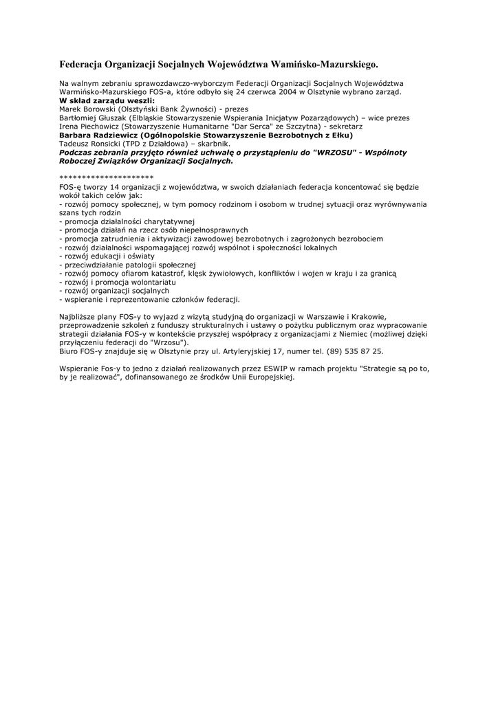 Federacja Organizacji Socjalnych Województwa Wamińsko-Mazurskiego. Na walnym zebraniu sprawozdawczo-wyborczym Federacji Organizacji Socjalnych Województwa Warmińsko-Mazurskiego FOS-a, które odbyło się 24 czerwca 2004 w Olsztynie wybrano zarząd. W skład zarządu weszli: Marek Borowski (Olsztyński Bank Żywności) - prezes Bartłomiej Głuszak (Elbląskie Stowarzyszenie Wspierania Inicjatyw Pozarządowych) – wice prezes Irena Piechowicz (Stowarzyszenie Humanitarne "Dar Serca" ze Szczytna) - sekretarz Barbara Radziewicz (Ogólnopolskie Stowarzyszenie Bezrobotnych z Ełku) Tadeusz Ronsicki (TPD z Działdowa) – skarbnik. Podczas zebrania przyjęto również uchwałę o przystąpieniu do "WRZOSU" - Wspólnoty Roboczej Związków Organizacji Socjalnych. ********************* FOS-ę tworzy 14 organizacji z województwa, w swoich działaniach federacja koncentować się będzie wokół takich celów jak: - rozwój pomocy społecznej, w tym pomocy rodzinom i osobom w trudnej sytuacji oraz wyrównywania szans tych rodzin - promocja działalności charytatywnej - promocja działań na rzecz osób niepełnosprawnych - promocja zatrudnienia i aktywizacji zawodowej bezrobotnych i zagrożonych bezrobociem - rozwój działalności wspomagającej rozwój wspólnot i społeczności lokalnych - rozwój edukacji i oświaty - przeciwdziałanie patologii społecznej - rozwój pomocy ofiarom katastrof, klęsk żywiołowych, konfliktów i wojen w kraju i za granicą - rozwój i promocja wolontariatu - rozwój organizacji socjalnych - wspieranie i reprezentowanie członków federacji. Najbliższe plany FOS-y to wyjazd z wizytą studyjną do organizacji w Warszawie i Krakowie, przeprowadzenie szkoleń z funduszy strukturalnych i ustawy o pożytku publicznym oraz wypracowanie strategii działania FOS-y w kontekście przyszłej współpracy z organizacjami z Niemiec (możliwej dzięki przyłączeniu federacji do "Wrzosu"). Biuro FOS-y znajduje się w Olsztynie przy ul. Artyleryjskiej 17, numer tel. (89) 535 87 25. Wspieranie Fos-y to jedno z działań realizowanych przez ESWIP w ramach projektu "Strategie są po to, by je realizować", dofinansowanego ze środków Unii Europejskiej.