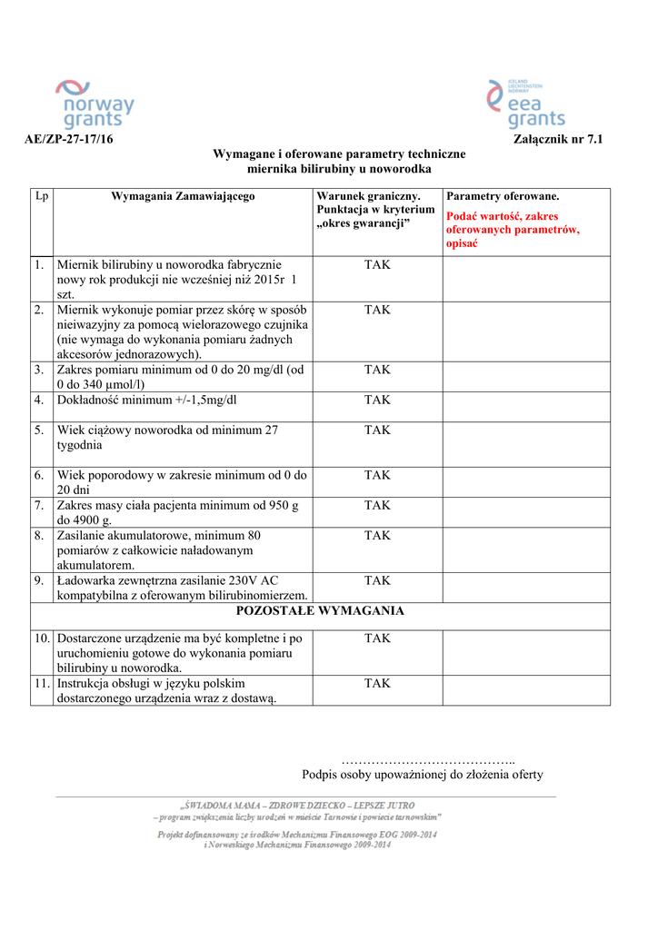 AE/ZP-27-17/16 Załącznik nr 7.1 Wymagane i oferowane parametry techniczne miernika bilirubiny u noworodka Lp Wymagania Zamawiającego 1. Miernik bilirubiny u noworodka fabrycznie nowy rok produkcji nie wcześniej niż 2015r 1 szt. Miernik wykonuje pomiar przez skórę w sposób nieiwazyjny za pomocą wielorazowego czujnika (nie wymaga do wykonania pomiaru żadnych akcesorów jednorazowych). Zakres pomiaru minimum od 0 do 20 mg/dl (od 0 do 340 µmol/l) Dokładność minimum +/-1,5mg/dl TAK 5. Wiek ciążowy noworodka od minimum 27 tygodnia TAK 6. Wiek poporodowy w zakresie minimum od 0 do TAK 20 dni Zakres masy ciała pacjenta minimum od 950 g TAK do 4900 g. Zasilanie akumulatorowe, minimum 80 TAK pomiarów z całkowicie naładowanym akumulatorem. Ładowarka zewnętrzna zasilanie 230V AC TAK kompatybilna z oferowanym bilirubinomierzem. POZOSTAŁE WYMAGANIA 2. 3. 4. 7. 8. 9. Warunek graniczny. Parametry oferowane. Punktacja w kryterium Podać wartość, zakres „okres gwarancji” oferowanych parametrów, opisać 10. Dostarczone urządzenie ma być kompletne i po uruchomieniu gotowe do wykonania pomiaru bilirubiny u noworodka. 11. Instrukcja obsługi w języku polskim dostarczonego urządzenia wraz z dostawą. TAK TAK TAK TAK TAK ………………………………….. Podpis osoby upoważnionej do złożenia oferty 12. Dostawa urządzenia w terminie do 28 dni od TAK daty podpisania umowy. 13. Do oferty należy dołączyć materiały TAK informacyjne w języku polskim dotyczące oferowanego urządzenia oraz jego zdjęcie (fotografię). 14. Szkolenie pracowników w siedzibie TAK Zamawiającego w zakresie obsługi dostarczonego urządzenia w dniu protokolarnego odbioru uruchomionego urządzenia lub w terminie poprzedzającym odbiór wyznaczonym przez Zamawiającego w porozumieniu z Wykonawcą. Warunek min.0 pkt 15. Pełna gwarancja minimum 24 miesiące na dostarczone urządzenie od dnia protokolarnego Maksymalna wartość 1 pkt. Pozostałe proporcjonalnie odbioru uruchomionego urządzenia, rękojmia na przedmiot zamówienia od dnia protokolarnego odbioru uruchomionego urządzenia na zasadach i terminach określonych w Kodeksie Cywilnym 16. W okresie gwarancji dowóz urządzenia do TAK naprawy lub przyjazd serwisanta do siedziby Zamawiającego na koszt Wykonawcy. Niespełnienie wyżej wyszczególnionych parametrów spowoduje odrzucenie oferty. ………………………………….. Podpis osoby upoważnionej do złożenia oferty