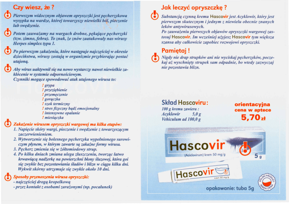 Czy wiesz, że ? ~ Pierwszym widocznym objawem opryszczki jest pęcherzykowa wysypka na wardze, której towarzyszy niewielki ból, pieczenie lub swędzenie. ~ Potem zauważamy na wargach drobne, pękające pęcherzyki (tzw. zimno,febra). To znak, że znów zaatakowały nas wirusy Herpes simplex typu 1. ~ Po pierwszym zakażeniu, które następuje najczęściej w okresie dzieciństwa, wirusy zostają w organizmie przybierając postać utajoną. ~ Aby wirus uaktywnił się na nowo wystarczy nawet niewielkie zakłócenie w systemie odpornościowym. Czynniki mogące spowodować atak utajonego wirusa to: ! grypa !przeziębienie !przemęczenie !gorączka ! szok termiczny ! stresfizyczny bądź emocjonalny ! intensywne opalanie ! miesiączka ~ Zakażenie wirusem opryszczki wargowej ma kilka etapów: 1. Napięcie skóry wargi, pieczenie i swędzenie Z towarzyszącym zaczerwienieniem. 2. Wytworzenie się bolesnego pęcherzyka wypełnionego surowiczym płynem, w którym zawarte są zakaźne formy wirusa. 3. Pęcherz zmienia się w żóhomiodowy strup. 4. Po kilku dniach zmiana ulega złuszczeniu, tworząc łatwo krwawiącą nadżerkę na powierzchni błony śluzowej, która goi się zwykle bez pozostawiania śladów i blizn w ciągu kilku dni Wykwit skórny utrzymuje się zwykle około 10 dni ~ Sposoby przenoszenia wirusa opryszczki: - najczęściej drogą kropelkową - przez kontakt z osobami zarażonymi (np. pocałunek) Jak leczyć opryszczkę? ~ Substancją czynną kremu Hascovir jest Acyklowir, który jest pierwszym skutecznym i jednym Z niewielu obecnie znanych leków antywirusowych. Po zauważeniu pierwszych objawów opryszczki wargowej zastosuj Hascovir. Im wcześniej użyjesz Hascovir tym większa szansa aby całkowicie zapobiec rozwojowi opryszczki. Pamiętaj! ~ Nigdy nie drap strupków ani nie wyciskaj pęcherzyków, poczekaj aż wyschnięty strupek sam odpadnie, bo wtedy zazwyczaj nie pozostawia blizn. Skład Hascoviru: orientacyjna 100g kremu zawiera: Acyklowir 5,0 g Vehiculum ad 100,0 g cena w aptece 5,70zl t!.9,~cov'r "'m50m:. opakowanie: tuba 5g
