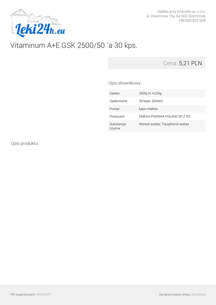 Apteka przy Kościele sp. z o.o. ul. Dworcowa 16a, 64-500 Szamotuły +48 600 823 608 Vitaminum A+E GSK 2500/50 `a 30 kps. Cena: 5,21 PLN Opis słownikowy Dawka 2500j.m.+0,05g Opakowanie 30 kaps. (blister) Postać kaps.miękkie Producent OMEGA PHARMA POLAND SP Z OO Substancja czynna Retinoli acetas, Tocopheroli acetas Opis produktu Plik wygenerowano: 08-03-2017 Powered by TCPDF (www.tcpdf.org) Oprogramowanie sklepu: AptusShop