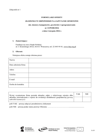 Załącznik nr 1 FORMULARZ OFERTY ZŁOŻONEJ W ODPOWIEDZI NA ZAPYTANIE OFERTOWE dot. dostawy komputerów, peryferiów i oprogramowania nr 13/POIR/2016 z dnia 4 sierpnia 2016 r. 1. Zamawiający: Fundacja na rzecz Nauki Polskiej ul. I. Krasickiego 20/22, 02-611 Warszawa, tel. 22 845 95 01, www.fnp.org.pl 2. Oferent: Niniejsza oferta zostaje złożona przez: Nazwa Data założenia firmy Adres Telefon E-mail Osoba do kontaktu Wyżej wymieniona firma posiada aktualny odpis z właściwego rejestru albo aktualne zaświadczenie o wpisie do ewidencji działalności gospodarczej (proszę zakreślić/zaznaczyć). TAK NIE jeśli TAK – proszę załączyć przedmiotowy dokument jeśli NIE – proszę podać status prawny Oferenta: ……………………………................................ 1z3 3. Ja niżej podpisany oświadczam, że: 1) zapoznaliśmy się z opisem przedmiotu zamówienia, warunkami udziału, kryteriami oceny, terminami i innymi postanowieniami zawartymi w Zapytaniu ofertowym nr 13/POIR/2016 i nie wnosimy do nich zastrzeżeń oraz zdobyliśmy informacje niezbędne do właściwego wykonania zamówienia, 2) jesteśmy związani niniejszą ofertą na czas wskazany w zapytaniu ofertowym nr 13/POIR/2016, 3) w przypadku wybrania naszej oferty jesteśmy gotowi do podpisania umowy z Zamawiającym i realizacji niniejszego zamówienia w terminach określonych w zapytaniu ofertowym 13/POIR/2016, 4) oświadczamy, że nie jesteśmy powiązani osobowo ani kapitałowo z Zamawiającym zgodnie z obowiązującymi przepisami*. *Przez powiązania kapitałowe lub osobowe rozumie się wzajemne powiązania między Zamawiającym lub osobami upoważnionymi do zaciągania zobowiązań w imieniu Zamawiającego lub osobami wykonującymi w imieniu Zamawiającego czynności związane z przygotowaniem i przeprowadzeniem procedury wyboru Wykonawcy, polegające w szczególności na: uczestniczeniu w spółce jako wspólnik spółki cywilnej lub spółki osobowej; posiadaniu co najmniej 10 % udziałów lub akcji; pełnieniu funkcji członka organu nadzorczego lub zarządzającego, prokurenta, pełnomocnika; pozostawaniu w związku małżeńskim, w stosunku pokrewieństwa lub powinowactwa w linii prostej, pokrewieństwa lub powinowactwa w linii bocznej do drugiego stopnia lub w stosunku przysposobienia, opieki lub kurateli. ………………………..…………………………………… podpis, pieczęć 2z3 4. Wykaz trzech podobnych rodzajowo zleceń zrealizowanych w ciągu ostatnich 12 miesięcy (licząc od daty niniejszego zapytania ofertowego): Lp. Nazwa, adres Zleceniodawcy Opis zlecenia Wartość zlecenia 1. 2. 3. 5. Wycena kosztów brutto W Załączniku nr 2 do niniejszego Zapytania ofertowego Oferent jest zobowiązany do podania wszystkich kwot brutto za wyszczególnione składniki dostawy SUMA BRUTTO z Załącznika nr 2: ……………………………… ……………………………………………. data, podpis, pieczęć 3z3