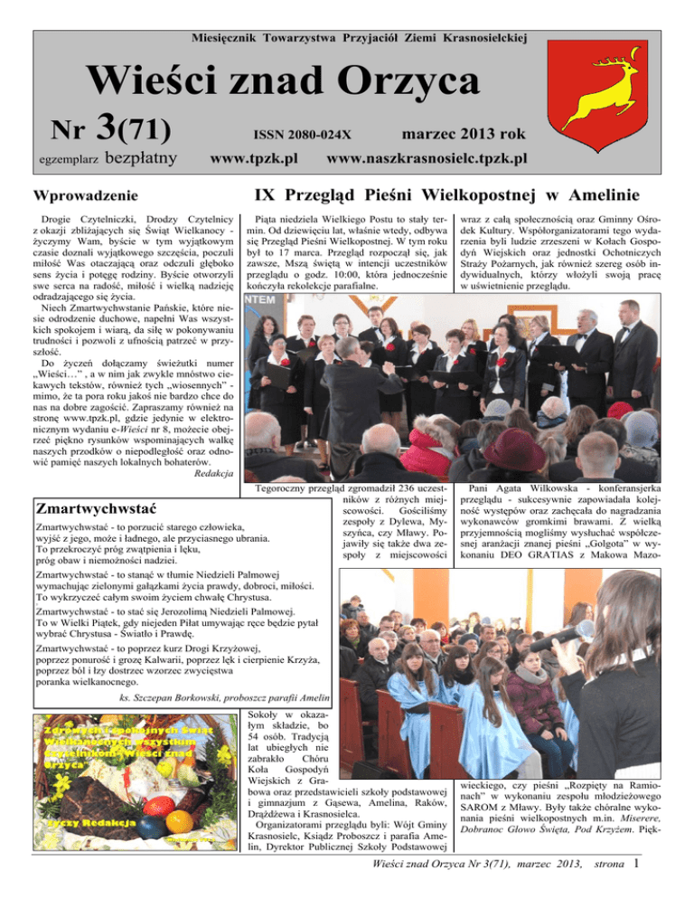 Miesięcznik Towarzystwa Przyjaciół Ziemi Krasnosielckiej Wieści znad Orzyca Nr 3(71) egzemplarz bezpłatny ISSN 2080-024X www.tpzk.pl Wprowadzenie Drogie Czytelniczki, Drodzy Czytelnicy z okazji zbliżających się Świąt Wielkanocy życzymy Wam, byście w tym wyjątkowym czasie doznali wyjątkowego szczęścia, poczuli miłość Was otaczającą oraz odczuli głęboko sens życia i potęgę rodziny. Byście otworzyli swe serca na radość, miłość i wielką nadzieję odradzającego się życia. Niech Zmartwychwstanie Pańskie, które niesie odrodzenie duchowe, napełni Was wszystkich spokojem i wiarą, da siłę w pokonywaniu trudności i pozwoli z ufnością patrzeć w przyszłość. Do życzeń dołączamy świeżutki numer „Wieści…” , a w nim jak zwykle mnóstwo ciekawych tekstów, również tych „wiosennych” mimo, że ta pora roku jakoś nie bardzo chce do nas na dobre zagościć. Zapraszamy również na stronę www.tpzk.pl, gdzie jedynie w elektronicznym wydaniu e-Wieści nr 8, możecie obejrzeć piękno rysunków wspominających walkę naszych przodków o niepodległość oraz odnowić pamięć naszych lokalnych bohaterów. Redakcja marzec 2013 rok www.naszkrasnosielc.tpzk.pl IX Przegląd Pieśni Wielkopostnej w Amelinie Piąta niedziela Wielkiego Postu to stały termin. Od dziewięciu lat, właśnie wtedy, odbywa się Przegląd Pieśni Wielkopostnej. W tym roku był to 17 marca. Przegląd rozpoczął się, jak zawsze, Mszą świętą w intencji uczestników przeglądu o godz. 10:00, która jednocześnie kończyła rekolekcje parafialne. wraz z całą społecznością oraz Gminny Ośrodek Kultury. Współorganizatorami tego wydarzenia byli ludzie zrzeszeni w Kołach Gospodyń Wiejskich oraz jednostki Ochotniczych Straży Pożarnych, jak również szereg osób indywidualnych, którzy włożyli swoją pracę w uświetnienie przeglądu. Tegoroczny przegląd zgromadził 236 uczestników z różnych miejZmartwychwstać scowości. Gościliśmy zespoły z Dylewa, MyZmartwychwstać - to porzucić starego człowieka, szyńca, czy Mławy. Powyjść z jego, może i ładnego, ale przyciasnego ubrania. jawiły się także dwa zeTo przekroczyć próg zwątpienia i lęku, społy z miejscowości próg obaw i niemożności nadziei. Pani Agata Wilkowska - konferansjerka przeglądu - sukcesywnie zapowiadała kolejność występów oraz zachęcała do nagradzania wykonawców gromkimi brawami. Z wielką przyjemnością mogliśmy wysłuchać współczesnej aranżacji znanej pieśni „Golgota” w wykonaniu DEO GRATIAS z Makowa Mazo- Zmartwychwstać - to stanąć w tłumie Niedzieli Palmowej wymachując zielonymi gałązkami życia prawdy, dobroci, miłości. To wykrzyczeć całym swoim życiem chwałę Chrystusa. 3 Zmartwychwstać - to stać się Jerozolimą Niedzieli Palmowej. To w Wielki Piątek, gdy niejeden Piłat umywając ręce będzie pytał wybrać Chrystusa - Światło i Prawdę. Zmartwychwstać - to poprzez kurz Drogi Krzyżowej, poprzez ponurość i grozę Kalwarii, poprzez lęk i cierpienie Krzyża, poprzez ból i łzy dostrzec wzorzec zwycięstwa poranka wielkanocnego. ks. Szczepan Borkowski, proboszcz parafii Amelin Sokoły w okazałym składzie, bo 54 osób. Tradycją lat ubiegłych nie zabrakło Chóru Koła Gospodyń Wiejskich z Grabowa oraz przedstawicieli szkoły podstawowej i gimnazjum z Gąsewa, Amelina, Raków, Drążdżewa i Krasnosielca. Organizatorami przeglądu byli: Wójt Gminy Krasnosielc, Ksiądz Proboszcz i parafia Amelin, Dyrektor Publicznej Szkoły Podstawowej wieckiego, czy pieśni „Rozpięty na Ramionach” w wykonaniu zespołu młodzieżowego SAROM z Mławy. Były także chóralne wykonania pieśni wielkopostnych m.in. Miserere, Dobranoc Głowo Święta, Pod Krzyżem. Pięk- Wieści znad Orzyca Nr 3(71), marzec 2013, strona 1 nymi głosami i repertuarem urzekali widownię soliści, którzy nagradzani byli brawami. Wszyscy uczestnicy przeglądu otrzymali pamiątkowe dyplomy, na których widniało hasło tegorocznego przeglądu: „Krzyż fundamentem wiary” oraz nagrody rzeczowe ufundowane przez GOK. Ksiądz proboszcz, który zabrał głos na koniec przeglądu zaprosił wszystkich zebranych na przyszły rok, na Jubileuszowy X Przegląd Pieśni Wielkopostnych w Amelinie, który odbędzie się 6 kwietnia 2014 r. Po 2,5-godzinnym spotkaniu z pieśnią pasyjną oraz ciepłym poczęstunku uczestnicy przeglądu mogli degustować potrawy wielkanocne przygotowane przez chętne osoby z terenu naszej gminy. Tegoroczna degustacja obfitowała głównie w słodkości. Oprócz degustacji przybyli goście mieli okazję obejrzeć wystawę prac wielkanocnych, tj. stroiki, jaja ozdabiane różnorodnymi technikami, kurki i koguciki, palmy i tradycyjne kosze wielkanocne - święconki. Warsztaty plastyczne W PSP w Amelinie 8 marca dla większości kobiet jest dniem radosnym z okazji ich święta - Dnia Kobiet. Panie szczególnie w tym dniu są obdarowywane upominkami, serdecznością i uśmiechem. My kobiety z parafii Amelin, w tym świątecznym dla nas dniu mogłyśmy w szczególności poświęcić swój wolny czas spędzając go razem ze swoimi dziećmi na warsztatach plastycznych, które były zorganizowane z okazji nie tylko Dnia Kobiet, ale i zbliżającego się przeglądy Pieśni Wielkopostnych w tutejszej parafii. Piękne dekoracje oraz wystawy rękodzieła Pani Anny Żerańskiej i Pani Agnieszki Gwiazda oraz kolekcja lalek w strojach regionalnych Natalii Ryłka przykuwały uwagę oglądających. Była także możliwość zakupienia pamiątek z pobytu w Amelinie w postaci ozdób wielkanocnych. Wszystkim zaangażowanym w przygotowanie przeglądu bardzo serdecznie gratulujemy, a przybyłym gościom – widzom dziękujemy zapraszając za rok, na jubileuszowy przegląd. Witaliśmy wiosnę Na Misterium Męki Pańskiej w Ołtarzewie 21 marca, czyli w pierwszy dzień wiosny, w Szkole Podstawowej w Amelinie zorganizowano dzień „Zdrowej żywności” oraz odbyły si