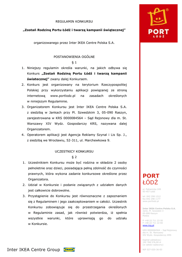 REGULAMIN KONKURSU „Zostań Rodziną Portu Łódź i twarzą kampanii świątecznej” organizowanego przez Inter IKEA Centre Polska S.A. POSTANOWIENIA OGÓLNE §1 1. Niniejszy regulamin określa warunki, na jakich odbywa się Konkurs „Zostań Rodziną Portu Łódź i twarzą kampanii światecznej” zwany dalej Konkursem. 2. Konkurs jest organizowany na terytorium Rzeczypospolitej Polskiej przy wykorzystaniu aplikacji powiązanej ze stroną internetową www.portlodz.pl na zasadach określonych w niniejszym Regulaminie. 3. Organizatorem Konkursu jest Inter IKEA Centre Polska S.A. z siedzibą w Jankach przy Pl. Szwedzkim 3, 05-090 Raszyn, zarejestrowana w KRS 0000084564 – Sąd Rejonowy dla m. St. Warszawy XIV Wydz. Gospodarczy KRS, nazywana dalej Organizatorem. 4. Operatorem aplikacji jest Agencja Reklamy Szynal i Lis Sp. J., z siedzibą we Wrocławiu, 52-311, ul. Marchewkowa 9. UCZESTNICY KONKURSU §2 1. Uczestnikiem Konkursu może być rodzina w składzie 2 osoby pełnoletnie oraz dzieci, posiadająca pełną zdolność do czynności prawnych, która wykona zadanie konkursowe określone przez Organizatora. 2. Udział w Konkursie i podanie związanych z udziałem danych ul. Pabianicka 245 93-457 Łódź jest całkowicie dobrowolne. 3. Przystąpienie do Konkursu jest równoznaczne z zapoznaniem się z Regulaminem i jego zaakceptowaniem w całości. Uczestnik Konkursu zobowiązuje się do przestrzegania określonych w Regulaminie zasad, jak również potwierdza, iż spełnia wszystkie warunki, w Konkursie. które PORT ŁÓDŹ uprawniają go do udziału tel. 042 298 1212 fax 042 298 1177 www.portlodz.pl Inter IKEA Centre Polska S.A. Janki, Pl. Szwedzki 3 05-090 Raszyn Polska P +48 22 711 23 00 F +48 22 711 22 66 www.iicg.pl KRS 0000084564 – Sąd Rejonowy dla m. St. Warszawy XIV Wydz. Gospodarczy KRS Kapitał zakładowy: 192 768 576,00 zł (w całości wpłacony) NIP 527-020-36-03 4. Uczestnikami Konkursu nie mogą być pracownicy Organizatora Konkursu ani osoby pozostające z Organizatorem Konkursu w stosunku zlecenia lub w innym stosunku prawnym, do którego stosuje się przepisy o zleceniu, oraz członkowie rodzin wskazanych osób do drugiego stopnia pokrewieństwa. ZASADY I PRZEBIEG KONKURSU §3 1. Pierwszy etap Konkursu trwa od godziny 14:00 04.11.2013 r. do godz. 24:00 11.11.2013 r. 2. Aby wziąć udział w Konkursie, należy: a. zarejestrować się na www.portlodz-konkurs.pl, stronie konkursowej wypełniając wszystkie wymagane pola, b. umieścić w aplikacji konkursowej na stronie www.portlodz-konkurs.pl swoje zdjęcie prezentujące rodzinę; zdjęcie musi prezentować rodzinę uczestnika Konkursu. 3. Uczestnik ma możliwość zamieszczenia tylko jednego zdjęcia; nie ma możliwości późniejszej zmiany zamieszczonego zdjęcia. 4. Uczestnik Konkursu może się zarejestrować w aplikacji przy użyciu jednego tylko adresu mailowego; korzystanie z kilku adresów mailowych przez jednego Uczestnika spowoduje odrzucenie kolejnych zgłoszeń - do celów konkursowych brane będzie pod uwagę wyłącznie pierwsze zgłoszenie Uczestnika. Organizator zastrzega sobie prawo kontroli uczciwości w Konkursie i eliminowania zgłoszeń naruszających zasady niniejszego regulaminu. 5. Zamieszczenie w aplikacji konkursowej zdjęcia jest równoznaczne z oświadczeniem przez uczestnika Konkursu, że posiada on do niego prawa autorskie oraz że zamieszczane zdjęcia przedstawiają jego samego oraz jego rodzinę i nie naruszają praw osób trzecich, w szczególności praw autorskich PORT ŁÓDŹ ul. Pabianicka 245 93-457 Łódź tel. 042 298 1212 fax 042 298 1177 www.portlodz.pl oraz dóbr osobistych. 6. Maksymalny rozmiar zdjęcia zamieszczonego w aplikacji konkursowej to 1 MB. 7. Zdjęcia uczestników Konkursu podlegają ocenie użytkowników strony konkursowej. W czasie trwania Konkursu internauci mogą oddawać głosy na zdjęcia zamieszczone w aplikacji Inter IKEA Centre Polska S.A. Janki, Pl. Szwedzki 3 05-090 Raszyn Polska P +48 22 711 23 00 F +48 22 711 22 66 www.iicg.pl KRS 0000084564 – Sąd Rejonowy dla m. St. Warszawy XIV Wydz. Gospodarczy KRS Kapitał zakładowy: 192 768 576,00 zł (w całości wpłacony) NIP 527-020-36-03 konkursowej. Każda osoba głosująca na zdjęcia może oddać maksymalnie pięć głosów ( po jednym głosie na różne zdjęcia). 8. Do kolejnego - drugiego etapu Konkursu przechodzi 10 rodzin, których zdjęcia uzyskają największą liczbę głosów. 9. Konkurs jest moderowany. Każde zgłoszone do Konkursu zdjęcie, aby wziąć zaakceptowane udział przez w Konkursie, moderatorów. musi Wszystkie zostać zgłoszone zdjęcia, które nie uzyskają akceptacji moderatorów, zostaną z aplikacji konkursowej usunięte bez powiadamiania o tym zgłaszającego. Zgłoszenie zdjęcia nie jest jednoznaczne z przyjęciem go do Konkursu. 10. Organizator zastrzega, iż Konkursu, nabywa prawa w interaktywnych, mediach Facebook.com i z chwilą przyjęcia do w zdjęcia wykorzystania szczególności na stronie Konkursowej na do go portalu oraz na stronie www.portlodz.pl. 11. W Konkursie jedna rodzina może wygrać maksymalnie jeden raz. 12. W momencie zgłoszenia do Konkursu uczestnicy wyrażają zgodę na przetwarzanie ich danych osobowych przez Organizatora zgodnie z ustawą z dnia 29 sierpnia 1997 o ochronie danych osobowych (Dz. U. z 2002 r. Nr 101, poz. 926) w zakresie niezbędnym do prawidłowego przeprowadzenia Konkursu. Uczestnicy posiadają prawo dostępu do treści danych przez niego przekazanych, ich poprawiania oraz żądania usunięcia. 13. Zgłoszenie do konkursu jest równoznaczne z wyrażeniem zgody na przetwarzanie danych osobowych oraz na użycie wizerunku uczestników Konkursu do celów marketingowych Portu Łódź. Wyrażenie zgody na otrzymywanie materiałów reklamowych drogą elektroniczną jest dobrowolne. 14. Administratorem danych osobowych Uczestników Konkursu jest Organizator. Podanie danych jednak ich niepodanie osobowych uniemożliwi jest laureato