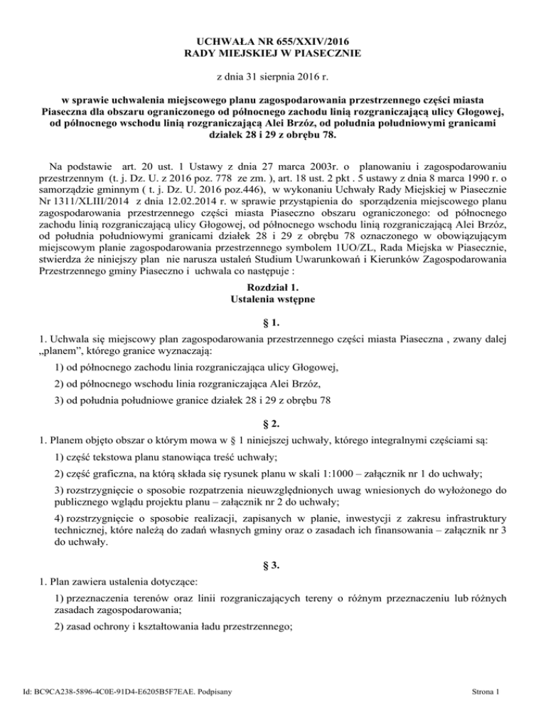 UCHWAŁA NR 655/XXIV/2016 RADY MIEJSKIEJ W PIASECZNIE z dnia 31 sierpnia 2016 r. w sprawie uchwalenia miejscowego planu zagospodarowania przestrzennego części miasta Piaseczna dla obszaru ograniczonego od północnego zachodu linią rozgraniczającą ulicy Głogowej, od północnego wschodu linią rozgraniczającą Alei Brzóz, od południa południowymi granicami działek 28 i 29 z obrębu 78. Na podstawie art. 20 ust. 1 Ustawy z dnia 27 marca 2003r. o planowaniu i zagospodarowaniu przestrzennym (t. j. Dz. U. z 2016 poz. 778 ze zm. ), art. 18 ust. 2 pkt . 5 ustawy z dnia 8 marca 1990 r. o samorządzie gminnym ( t. j. Dz. U. 2016 poz.446), w wykonaniu Uchwały Rady Miejskiej w Piasecznie Nr 1311/XLIII/2014 z dnia 12.02.2014 r. w sprawie przystąpienia do sporządzenia miejscowego planu zagospodarowania przestrzennego części miasta Piaseczno obszaru ograniczonego: od północnego zachodu linią rozgraniczającą ulicy Głogowej, od północnego wschodu linią rozgraniczającą Alei Brzóz, od południa południowymi granicami działek 28 i 29 z obrębu 78 oznaczonego w obowiązującym miejscowym planie zagospodarowania przestrzennego symbolem 1UO/ZL, Rada Miejska w Piasecznie, stwierdza że niniejszy plan nie narusza ustaleń Studium Uwarunkowań i Kierunków Zagospodarowania Przestrzennego gminy Piaseczno i uchwala co następuje : Rozdział 1. Ustalenia wstępne § 1. 1. Uchwala się miejscowy plan zagospodarowania przestrzennego części miasta Piaseczna , zwany dalej „planem”, którego granice wyznaczają: 1) od północnego zachodu linia rozgraniczająca ulicy Głogowej, 2) od północnego wschodu linia rozgraniczająca Alei Brzóz, 3) od południa południowe granice działek 28 i 29 z obrębu 78 § 2. 1. Planem objęto obszar o którym mowa w § 1 niniejszej uchwały, którego integralnymi częściami są: 1) część tekstowa planu stanowiąca treść uchwały; 2) część graficzna, na którą składa się rysunek planu w skali 1:1000 – załącznik nr 1 do uchwały; 3) rozstrzygnięcie o sposobie rozpatrzenia nieuwzględnionych uwag wniesionych do wyłożonego do publicznego wglądu projektu planu – załącznik nr 2 do uchwały; 4) rozstrzygnięcie o sposobie realizacji, zapisanych w planie, inwestycji z zakresu infrastruktury technicznej, które należą do zadań własnych gminy oraz o zasadach ich finansowania – załącznik nr 3 do uchwały. § 3. 1. Plan zawiera ustalenia dotyczące: 1) przeznaczenia terenów oraz linii rozgraniczających tereny o różnym przeznaczeniu lub różnych zasadach zagospodarowania; 2) zasad ochrony i kształtowania ładu przestrzennego; Id: BC9CA238-5896-4C0E-91D4-E6205B5F7EAE. Podpisany Strona 1 3) zasad ochrony środowiska, przyrody i krajobrazu; 4) zasad kształtowania krajobrazu; 5) zasad kształtowania zabudowy oraz wskaźników zagospodarowania terenu; 6) szczegółowych zasad i warunków scalania i podziału nieruchomości objętych planem miejscowym; 7) szczególnych warunków zagospodarowania terenów oraz ograniczeń w ich użytkowaniu; 8) zasad modernizacji, rozbudowy i budowy systemów komunikacji i infrastruktury technicznej; 9) sposobu i terminu tymczasowego zagospodarowania, urządzania i użytkowania terenów; 10) stawek procentowych, na podstawie których ustala się opłatę od wzrostu wartości nieruchomości w wyniku uchwalenia planu; 2. Plan nie zawiera ustaleń dotyczących: 1) zasad ochrony dziedzictwa kulturowego i zabytków oraz dóbr kultury współczesnej 2) wymagań wynikających z potrzeb kształtowania przestrzeni publicznych; 3) terenów górniczych, terenów narażonych na niebezpieczeństwo powodzi oraz terenów narażonych na niebezpieczeństwo osuwania się mas ziemnych, ze względu na brak w granicach planu § 4. 1. Następujące oznaczenia graficzne na rysunku planu : 1) granice obszaru objętego planem; 2) linie rozgraniczające tereny o różnym przeznaczeniu lub różnym sposobie zagospodarowania; 3) nieprzekraczalne linie zabudowy; 4) symbole literowe określające przeznaczenie terenów; 5) wymiarowanie w metrach; 2. Pozostałe oznaczenie graficzne mają charakter informacyjny. § 5. 1. Ilekroć w przepisach niniejszej uchwały jest mowa o: 1) planie – należy przez to rozumieć ustalenia miejscowego planu zagospodarowania przestrzennego, o którym mowa w § 1 niniejszej uchwały; 2) uchwale – należy przez to rozumieć niniejszą uchwałę, o ile z treści przepisu nie wynika inaczej; 3) przepisach szczególnych (odrębnych) - należy przez to rozumieć przepisy ustaw, poza ustawą o planowaniu i zagospodarowaniu przestrzennym oraz inne prawne ograniczenia w dysponowaniu terenami; 4) obszarze planu – należy przez to rozumieć obszar objęty planem, w granicach przedstawionych na rysunku planu i opisanych w § 1 ust. 1; 5) terenie – należy przez to rozumieć obszar wyznaczony liniami rozgraniczającymi, oraz określony symbolem terenu zgodnie z rysunkiem planu; 6) linii rozgraniczającej – należy przez to rozumieć linie, które wyznaczają tereny o różnym przeznaczeniu lub różnych zasadach zagospodarowania i zabudowy; 7) usługach – należy przez to rozumieć obiekty niemieszkalne wolnostojące lub lokale niemieszkalne wbudowane w inne obiekty, w których prowadzona jest działalność służąca zaspokajaniu potrzeb Id: BC9CA238-5896-4C0E-91D4-E6205B5F7EAE. Podpisany Strona 2 ludności, nie związana z wytwarzaniem dóbr materialnych metodami przemysłowymi, z wykluczeniem usług uciążliwych i obiektów handlowych; 8) usługach nieuciążliwych - należy przez to rozumieć działalność z wykorzystaniem urządzeń, które spełniają standardy środowiskowe, i której celem jest zaspakajanie potrzeb miejscowej ludności, a nie wytwarzanie dóbr materialnych metodami przemysłowymi; ewentualny negatywny wpływ na otoczenie tej działalności ogranicza się do terenu bądź lokalu, do którego prowadzący działalność usługową ma tytuł prawny, usługi nie zaliczane d