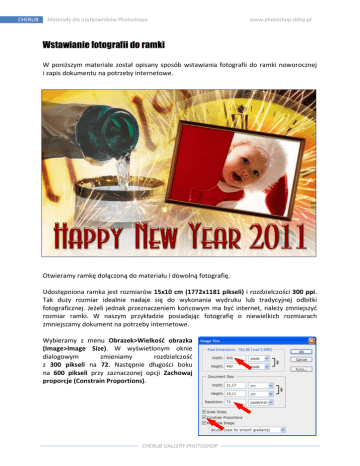CHERUB Materiały dla użytkowników Photoshopa www.photoshop.sklep.pl Wstawianie fotografii do ramki W poniższym materiale został opisany sposób wstawiania fotografii do ramki noworocznej i zapis dokumentu na potrzeby internetowe. Otwieramy ramkę dołączoną do materiału i dowolną fotografię. Udostępniona ramka jest rozmiarów 15x10 cm (1772x1181 pikseli) i rozdzielczości 300 ppi. Tak duży rozmiar idealnie nadaje się do wykonania wydruku lub tradycyjnej odbitki fotograficznej. Jeżeli jednak przeznaczeniem końcowym ma być internet, należy zmniejszyć rozmiar ramki. W naszym przykładzie posiadając fotografię o niewielkich rozmiarach zmniejszamy dokument na potrzeby internetowe. Wybieramy z menu Obrazek>Wielkość obrazka (Image>Image Size). W wyświetlonym oknie dialogowym zmieniamy rozdzielczość z 300 pikseli na 72. Następnie długości boku na 600 pikseli przy zaznaczonej opcji Zachowaj proporcje (Constrain Proportions). CHERUB GALLERY PHOTOSHOP CHERUB Materiały dla użytkowników Photoshopa www.photoshop.sklep.pl Wybieramy narzędzie Przesunięcie (Move Tool). Przenosimy fotografię do dokumentu z ramką. Po tej czynności fotografia zostanie umieszczona w dokumencie jako nowa warstwa nad warstwą tła o nazwie photoshop.sklep.pl, w innym przypadku należy wybrać z menu Warstwa>Ułóż>Przesuń do tyłu (Layer>Arrange>Bring to Back). Kolejnym krokiem jest skalowanie. Wybieramy z menu Edycja>Swobodnie przekształć (Edit>Free Transform). Chwytamy jeden z narożników widocznej ramki skalowania i dopasowujemy fotografię do dokumentu. Podczas skalowania przytrzymujemy klawisz Shift, celem zachowania proporcji boków. Akceptujemy Enter. Jeżeli przygotowujemy dokument na potrzeby internetowe zalecanym jest aby przed spłaszczeniem wykonać kadrowanie. Pozwoli to na odrzucenie fragmentów fotografii wychodzących poza dokument, co znacznie odchudzi ciężar pliku końcowego. Wybieramy narzędzie Kadrowanie (Crop Tool). Przeciągamy ramkę kadrowania po całym dokumencie i akceptujemy Enter. Spłaszczamy dokument wybierając z menu Warstwa>Spłaszcz obrazek (Layer>Flatten Image). Wybieramy z menu Plik>Zapisz dla Interneu i Urządzeń (File>Save for Web & Devices) lub Zapisz dla Weba (Save for Web), w zależności od posiadanej wersji programu. W grupie Ustawienia (Presets) wybieramy rozszerzenie pliku JPEG i jakość, w naszym przykładzie 60. Przy tym wyborze fotografia jest wyraźna a jej ciężar nie przekroczył 80K. Akceptujemy Zapisz (Save). Autor: cherub CHERUB GALLERY PHOTOSHOP
