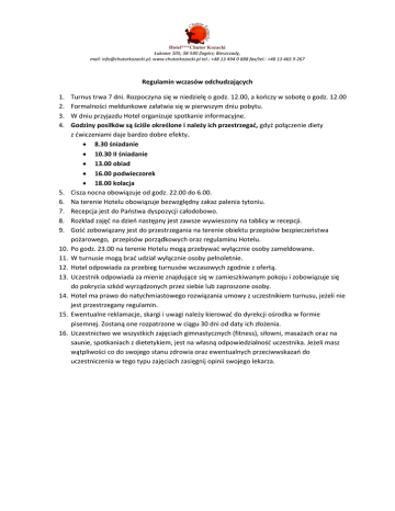 Hotel***Chutor Kozacki Łukowe 105; 38-540 Zagórz; Bieszczady, mail: [email protected]; www.chutorkozacki.pl tel.: +48 13 494 0 888 fax/tel.: +48 13 465 9 267 Regulamin wczasów odchudzających 1. 2. 3. 4. 5. 6. 7. 8. 9. 10. 11. 12. 13. 14. 15. 16. Turnus trwa 7 dni. Rozpoczyna się w niedzielę o godz. 12.00, a kończy w sobotę o godz. 12.00 Formalności meldunkowe załatwia się w pierwszym dniu pobytu. W dniu przyjazdu Hotel organizuje spotkanie informacyjne. Godziny posiłków są ściśle określone i należy ich przestrzegać, gdyż połączenie diety z ćwiczeniami daje bardzo dobre efekty.  8.30 śniadanie  10.30 II śniadanie  13.00 obiad  16.00 podwieczorek  18.00 kolacja Cisza nocna obowiązuje od godz. 22.00 do 6.00. Na terenie Hotelu obowiązuje bezwzględny zakaz palenia tytoniu. Recepcja jest do Państwa dyspozycji całodobowo. Rozkład zajęć na dzień następny jest zawsze wywieszony na tablicy w recepcji. Gość zobowiązany jest do przestrzegania na terenie obiektu przepisów bezpieczeństwa pożarowego, przepisów porządkowych oraz regulaminu Hotelu. Po godz. 23.00 na terenie Hotelu mogą przebywać wyłącznie osoby zameldowane. W turnusie mogą brać udział wyłącznie osoby pełnoletnie. Hotel odpowiada za przebieg turnusów wczasowych zgodnie z ofertą. Uczestnik odpowiada za mienie znajdujące się w zamieszkiwanym pokoju i zobowiązuje się do pokrycia szkód wyrządzonych przez siebie lub zaproszone osoby. Hotel ma prawo do natychmiastowego rozwiązania umowy z uczestnikiem turnusu, jeżeli nie jest przestrzegany regulamin. Ewentualne reklamacje, skargi i uwagi należy kierować do dyrekcji ośrodka w formie pisemnej. Zostaną one rozpatrzone w ciągu 30 dni od daty ich złożenia. Uczestnictwo we wszystkich zajęciach gimnastycznych (fitness), siłowni, masażach oraz na saunie, spotkaniach z dietetykiem, jest na własną odpowiedzialność uczestnika. Jeżeli masz wątpliwości co do swojego stanu zdrowia oraz ewentualnych przeciwwskazań do uczestniczenia w tego typu zajęciach zasięgnij opinii swojego lekarza.