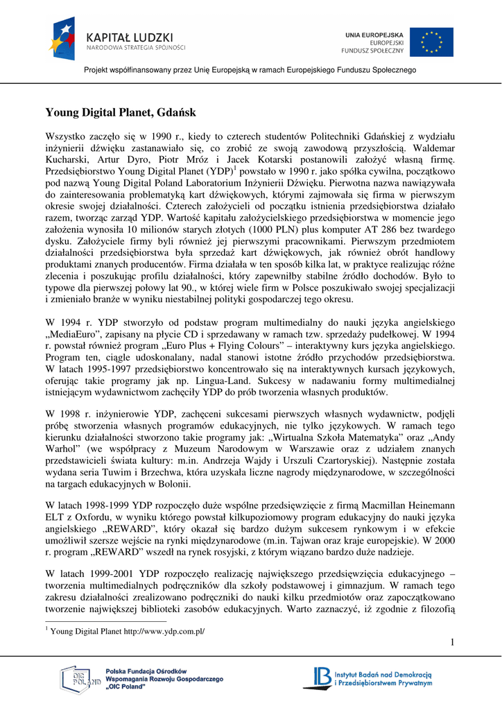 Projekt współfinansowany przez Unię Europejską w ramach Europejskiego Funduszu Społecznego Young Digital Planet, Gdańsk Wszystko zaczęło się w 1990 r., kiedy to czterech studentów Politechniki Gdańskiej z wydziału inżynierii dźwięku zastanawiało się, co zrobić ze swoją zawodową przyszłością. Waldemar Kucharski, Artur Dyro, Piotr Mróz i Jacek Kotarski postanowili założyć własną firmę. Przedsiębiorstwo Young Digital Planet (YDP)1 powstało w 1990 r. jako spółka cywilna, początkowo pod nazwą Young Digital Poland Laboratorium Inżynierii Dźwięku. Pierwotna nazwa nawiązywała do zainteresowania problematyką kart dźwiękowych, którymi zajmowała się firma w pierwszym okresie swojej działalności. Czterech założycieli od początku istnienia przedsiębiorstwa działało razem, tworząc zarząd YDP. Wartość kapitału założycielskiego przedsiębiorstwa w momencie jego założenia wynosiła 10 milionów starych złotych (1000 PLN) plus komputer AT 286 bez twardego dysku. Założyciele firmy byli również jej pierwszymi pracownikami. Pierwszym przedmiotem działalności przedsiębiorstwa była sprzedaż kart dźwiękowych, jak również obrót handlowy produktami znanych producentów. Firma działała w ten sposób kilka lat, w praktyce realizując różne zlecenia i poszukując profilu działalności, który zapewniłby stabilne źródło dochodów. Było to typowe dla pierwszej połowy lat 90., w której wiele firm w Polsce poszukiwało swojej specjalizacji i zmieniało branże w wyniku niestabilnej polityki gospodarczej tego okresu. W 1994 r. YDP stworzyło od podstaw program multimedialny do nauki języka angielskiego „MediaEuro”, zapisany na płycie CD i sprzedawany w ramach tzw. sprzedaży pudełkowej. W 1994 r. powstał również program „Euro Plus + Flying Colours” – interaktywny kurs języka angielskiego. Program ten, ciągle udoskonalany, nadal stanowi istotne źródło przychodów przedsiębiorstwa. W latach 1995-1997 przedsiębiorstwo koncentrowało się na interaktywnych kursach językowych, oferując takie programy jak np. Lingua-Land. Sukcesy w nadawaniu formy multimedialnej istniejącym wydawnictwom zachęciły YDP do prób tworzenia własnych produktów. W 1998 r. inżynierowie YDP, zachęceni sukcesami pierwszych własnych wydawnictw, podjęli próbę stworzenia własnych programów edukacyjnych, nie tylko językowych. W ramach tego kierunku działalności stworzono takie programy jak: „Wirtualna Szkoła Matematyka” oraz „Andy Warhol” (we współpracy z Muzeum Narodowym w Warszawie oraz z udziałem znanych przedstawicieli świata kultury: m.in. Andrzeja Wajdy i Urszuli Czartoryskiej). Następnie została wydana seria Tuwim i Brzechwa, która uzyskała liczne nagrody międzynarodowe, w szczególności na targach edukacyjnych w Bolonii. W latach 1998-1999 YDP rozpoczęło duże wspólne przedsięwzięcie z firmą Macmillan Heinemann ELT z Oxfordu, w wyniku którego powstał kilkupoziomowy program edukacyjny do nauki języka angielskiego „REWARD”, który okazał się bardzo dużym sukcesem rynkowym i w efekcie umożliwił szersze wejście na rynki międzynarodowe (m.in. Tajwan oraz kraje europejskie). W 2000 r. program „REWARD” wszedł na rynek rosyjski, z którym wiązano bardzo duże nadzieje. W latach 1999-2001 YDP rozpoczęło realizację największego przedsięwzięcia edukacyjnego – tworzenia multimedialnych podręczników dla szkoły podstawowej i gimnazjum. W ramach tego zakresu działalności zrealizowano podręczniki do nauki kilku przedmiotów oraz zapoczątkowano tworzenie największej biblioteki zasobów edukacyjnych. Warto zaznaczyć, iż zgodnie z filozofią 1 Young Digital Planet http://www.ydp.com.pl/ 1 Projekt współfinansowany przez Unię Europejską w ramach Europejskiego Funduszu Społecznego firmy wszystkie zasoby, poczynając od scenariuszy, poprzez grafikę, (zdjęcia, rysunki, itp.) oraz filmy (technika 2D, 3D oraz filmy audio) powstawały w YDP. W 2009 r. cyfrowa biblioteka tego typu zasobów liczyła ponad 20 tys. pozycji. Warto podkreślić, iż w 1999 r. przedsiębiorstwo pozyskało mniejszościowego inwestora strategicznego – koncern medialny Sanoma Learning and Literature, z siedzibą centrali w Finlandii. Coraz większe sukcesy na rynkach międzynarodowych oraz reorientacja zainteresowania polskich władz w zakresie szkolnictwa publicznego w kierunku nowoczesnych technologii2, a także niewątpliwy postęp w zapewnianiu przejrzystości w polityce przetargowej w Polsce, spowodowały powrót YDP na polski rynek szkolnictwa publicznego. W 2006 r. YDP, na zlecenie Ministerstwa Edukacji Narodowej, opracowało i wypełniło treścią portal edukacyjny scholaris.pl. Dzięki sukcesom krajowym na rynku publicznym oraz porozumieniom z wieloma krajami (np. Belgią i Holandią) zakres oddziaływania YDP zaczął się poszerzać na inne kraje Azji (Indonezja) i kolejne kraje Europejskie (m.in. Chorwacja i Węgry). W 2006 r. struktura wewnętrzna przedsiębiorstwa została rozbudowana – powstały dwie jednostki biznesowe: Business Unit Poland i Business Unit International, co w szerszym stopniu odpowiadało międzynarodowej i krajowej specyfice przedsiębiorstwa, ponieważ nie sposób prowadzić dwa główne nurty w obrębie tej samej jednostki organizacyjnej. Szybki wzrost sprzedaży serwisowej dla szkolnictwa publicznego w innych krajach oraz bardzo poważny wzrost współpracy partnerskiej z czołowymi wydawnictwami europejskimi spowodowały znaczny wzrost pracochłonności i czynności operacyjnych, które powinny były być realizowane poza Polską. W efekcie w 2008 r. YDP otworzyło dwie filie zagraniczne: jedną w Wielkiej Brytanii (YDP UK) i drugą w Norwegii (CyberBook). Te nowe przedsiębiorstwa nie pełnią roli biur przedstawicielskich czy sprzedażowych, ale uczestniczą w formułowaniu propozycji YDP na rynki, na których działają, w tym również propozycji nowych prod