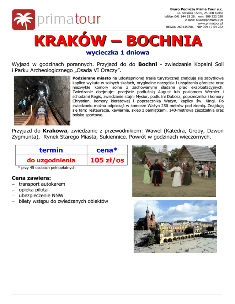 Biuro Podróży Prima Tour s.c. ul. Staszica 1/205, 25-008 Kielce tel/fax 041 344 53 29, kom. 509 222 020 e-mail: [email protected] www.primatour.pl REGON 260135098, NIP 959 17 64 282 KRAKÓW – BOCHNIA wycieczka 1 dniowa Wyjazd w godzinach porannych. Przyjazd do do Bochni - zwiedzanie Kopalni Soli i Parku Archeologicznego „Osada VI Oraczy”. Podziemne miasto na udostępnionej trasie turystycznej znajdują się zabytkowe kaplice wykute w solnych skałach, oryginalne narzędzia i urządzenia górnicze oraz niezwykłe komory solne z zachowanymi śladami prac eksploatacyjnych. Zwiedzanie obejmuje: przejście podłużnią August lub poziomem Wernier i schodami Regis, zwiedzanie stajni Mysiur, podłużni Dobosz, poprzecznika i komory Chrystian, komory kieratowej i poprzecznika Ważyn, kaplicy św. Kingi. Po zwiedzaniu można odpocząć w komorze Ważyn 250 metrów pod ziemią. Znajdują się tam: restauracja, kawiarnia, sklep z pamiątkami, 140-metrowa zjeżdżalnia oraz boisko sportowe. Przyjazd do Krakowa, zwiedzanie z przewodnikiem: Wawel (Katedra, Groby, Dzwon Zygmunta), Rynek Starego Miasta, Sukiennice. Powrót w godzinach wieczornych. termin cena* do uzgodnienia 105 zł/os * przy 45 osobach pełnopłatnych Cena zawiera: − − − − transport autokarem opieka pilota ubezpieczenie NNW bilety wstępu do zwiedzanych obiektów