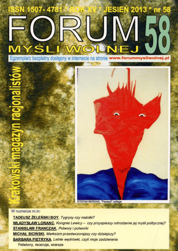 SPIS TREŚCI: 1 SŁOWO OD REDAKTORA TEMATY SPRZED LAT 2 Czesława Kotarba, Tygrysy czy matołki? Fragmenty felietonu Tadeusza Żeleńskiego Boya. ROCZNICE 4 5 72 rocznica śmierci Tadeusza Żeleńskiego Boya (fras). 97 rocznica urodzin Juliana Kawalca, Honorowego Prezesa STAL. POLSKA LEWICA 7 9 12 Jan Nowak, Kongres Polskiej Lewicy – to początek drogi do sukcesu wyborczego... Władysław Loranc, Kongres Lewicy – czy przyspieszy odrodzenie jej myśli politycznej? Karl Genzler, Sen, Niebo, wiersze. PUBLICYSTYKA 13 15 17 Barbara Pietryka, Letnie wędrówki, czyli moje zadziwienia. Stanisław Franczak, Namur – Belgia. Notatki z podróży. Stanisław Franczak, Ścięte drzewo, Zielony obrazek (wiersze). RADA PROGRAMOWA: doc. dr Andrzej Kurz – przewodniczący, prof. dr hab. Czesław Banach – wiceprzewodniczący, mgr Stanisław Franczak – wiceprzewodniczący, mgr Jan Nowak – wiceprzewodniczący, dr Józef Kabaj – sekretarz. Członkowie: prof. dr hab. Adam Chmielewski, prof. dr hab. Ignacy S. Fiut, prof. dr hab. Marian Grzybowski, prof. dr hab. Jerzy Kochan, prof. dr hab. Jerzy Kolarzowski, dr Jan Kozłowski, dr hab. Zbigniew Krawczyk, prof. dr hab. Józef Lipiec, mgr Mieczysław Noworyta, prof. dr hab. Jerzy Ochman, prof. dr hab. Jan Szmyd, prof. dr hab. Piotr Szydłowski, prof. dr hab. Jan Woleński, prof. dr hab. Krzysztof Woźniakowski RECENZJE 18 25 27 29 Michał Siciński, Marksizm przedwczorajszy czy dzisiejszy? Ignacy Fiut, Poeci w poszukiwaniu światów alternatywnych. Artur Rotter, Taboret, Zaskoczenie (wiersze). Andrzej Dębkowski, Idzie nowe (wiersz). ADRES REDAKCJI: 30-703 Kraków, ul. Dekerta 2A/5 tel. 12 423-50-16 e-mail: [email protected]; [email protected] LITERATURA PIĘKNA 30 35 Stanisław Franczak, Poszukiwanie Boga (opowiadanie). Ignacy S. Fiut, Kosmos (wiersz). Ignacy S. Fiut, *** w kosmosie, Przeciw-wiersz (wiersze). Anna Lasek Dumlar, Pozytywka, Prorocy, Kamienny Krąg Merlinga (wiersze). Rada Wojewódzka Towarzystwa Kultury Świeckiej, 30-703 Kraków, ul. Dekerta 2A/5 www.forummysliwolnej.pl Dom Fundacyjny im. Lidii i Leona Świeżawskich KRONIKA Fotoskład: Antoni Pietryka, Po co pisać do szuflady. Antoni Pietryka 31-422 Kraków, ul. Strzelców 9/1 tel. 500-141-674 e-mail: [email protected] POEZJA 36 37 38 Wydawca: KĄTEM OKA 41 Stanisław Franczak, Potwory i potworki. 44 Z PRASY (sf) Z PORTALI INTERNETOWYCH 46 Niewinnych złośliwostki nie ranią, bo ich nie dotykają. 61 WYDARZENIA KOMENTARZE – Czesława Jolanta Kotarba. MYŚLI. Wybrała: Czesława Jolanta Kotarba. Druk: Agencja Reklamowa Novum, 31-158 Kraków, ul. Krowoderska 66/8 tel.: 12-633-35-53, kom.: 502-067-059 ISSN 1507-4781, Index 325813 Redaktor naczelny: Stanisław Franczak. Zespół redakcyjny: Ignacy S. Fiut, Sylwester Marynowicz i Antoni Pietryka (zastępcy red. nacz.), Józef Kabaj (sekretarz), Julian Kawalec, Czesława Jolanta Kotarba, Sławomir Brodziński, Barbara Pietryka (red. techniczny). Fotoreporterzy: Ryszard Kosiba, Antoni Pietryka. Opracowanie graficzne: Stefan Berdak, Barbara Pietryka. Redakcja zastrzega sobie prawo do skracania tekstów i zmiany tytułów. Nie odsyłamy materiałów niezamówionych. Artykuły naukowe są recenzowane przez samodzielnych pracowników nauki. TEMATY SPRZED LAT TADEUSZ ŻELEŃSKI BOY Tygrysy czy matołki? Fragmenty felietonu zawartego w tomie pt. Słowa cienkie i grube (1930) Kiedy po raz enty czytałam ten felieton, pomyślałam sobie: wszystko w życiu może się powtórzyć. Napisany prawie sto lat temu felieton, gdzieś w latach dwudziestych ubiegłego stulecia, porusza kwestię solidności prowadzenia dochodzenia prokuratorskiego i ferowania wyroków sędziowskich zgodnych z kodeksem karnym. Właśnie wysłuchałam relacji z prowadzenia śledztwa w sprawie zabójstwa generała Marka Papały i dowiedziałam się, że dochodzenie prowadziły dwie odrębne prokuratury i sformułowały zdecydowanie różne wnioski. Innym przykładem niewiedzy i niefrasobliwości prokuratorów jest następujący fakt: prokurator z Białegostoku nie doszukał się faszyzacji w publicznym noszeniu swastyki niemieckiej. Wyjaśnił, że swastyka jest symbolem szczęścia w krajach azjatyckich. Być może tam, ale u nas jest ona symbolem cierpienia i dramatu ludzi przeżywanego w czasach okupacji niemieckiej. Inna sędzia – kobieta – nie widzi nic obraźliwego w nazwaniu „ścierwem społecznym” obcokrajowca mieszkającego w Polsce. Boy w cytowanym poniżej felietonie pisze o niewłaściwym interpretowaniu przez sędziów i prokuratorów aktualnego prawa karnego, co automatycznie przekłada się na niesprawiedliwe wyroki. CJK Tygrysy czy matołki? Może nie wszyscy wiedzą o tym, że Komisja Kodyfikacyjna w swoim projekcie prawa karnego usunęła karę śmierci. (...) Jeden z najbardziej zasadniczych punktów nowoczesnego prawa, rzecz, która od lat była w innych krajach przedmiotem tylu walk i dyskusji. I oto teraz, gdy przyszła u nas okazja praktycznej w tej mierze decyzji, znów ta sama obojętność. Tak, jeszcze nie przywykliśmy do decydowania o sobie! (...) Należałoby tedy milczącą zgodą przyjąć, że już dzisiaj prawo w Polsce kary śmierci nie zna. Tymczasem co się dzieje? 2 W dzielnicach, w których istnieje jeszcze – aż do unifikacji kodeksu – kara śmierci, nigdy sądy tak lekkomyślnie się z nią nie obchodziły jak właśnie teraz, nigdy wyroki śmierci nie szalały tak jak w tej chwili. Oto w Małopolsce w ciągu miesiąca wydano pięć wyroków śmierci, jeden głupszy i dzikszy od drugiego. Zaczęło się we Lwowie wyrokiem śmierci przez powieszenie na trzech młodych ludzi za przechowywanie czy też powielanie druków komunistycznych. Trudno orzec, czy wyrok bardziej okrutny, czy bardziej bezmyślny, ale szkodliwy i antypaństwowy na pewno. Wyko- nany nie będzie, do tegośmy jeszcze nie doszli – a co nam zaszkodzi to zaszkodzi. (...) Jeszcze nie minęło fatalne wrażenie wywołane tym wyrokiem – nowa sensacja: przys
