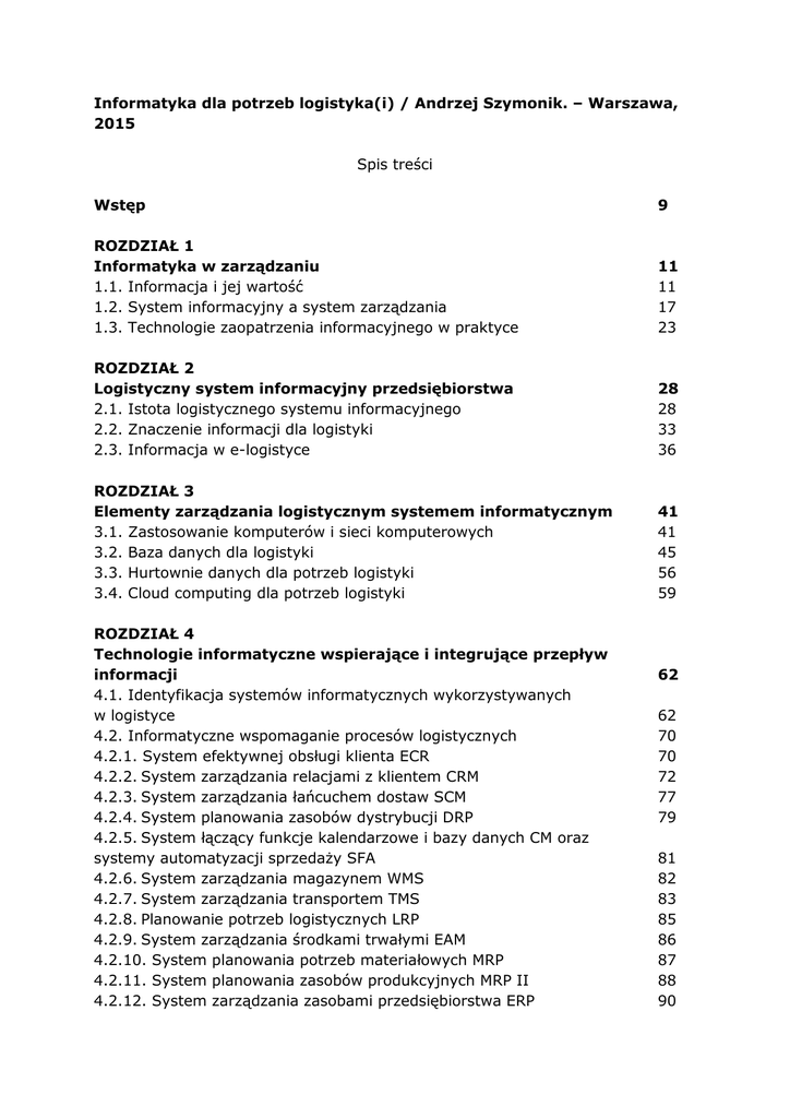 Informatyka dla potrzeb logistyka(i) / Andrzej Szymonik. – Warszawa, 2015 Spis treści Wstęp 9 ROZDZIAŁ 1 Informatyka w zarządzaniu 1.1. Informacja i jej wartość 1.2. System informacyjny a system zarządzania 1.3. Technologie zaopatrzenia informacyjnego w praktyce 11 11 17 23 ROZDZIAŁ 2 Logistyczny system informacyjny przedsiębiorstwa 2.1. Istota logistycznego systemu informacyjnego 2.2. Znaczenie informacji dla logistyki 2.3. Informacja w e-logistyce 28 28 33 36 ROZDZIAŁ 3 Elementy zarządzania logistycznym systemem informatycznym 3.1. Zastosowanie komputerów i sieci komputerowych 3.2. Baza danych dla logistyki 3.3. Hurtownie danych dla potrzeb logistyki 3.4. Cloud computing dla potrzeb logistyki 41 41 45 56 59 ROZDZIAŁ 4 Technologie informatyczne wspierające i integrujące przepływ informacji 4.1. Identyfikacja systemów informatycznych wykorzystywanych w logistyce 4.2. Informatyczne wspomaganie procesów logistycznych 4.2.1. System efektywnej obsługi klienta ECR 4.2.2. System zarządzania relacjami z klientem CRM 4.2.3. System zarządzania łańcuchem dostaw SCM 4.2.4. System planowania zasobów dystrybucji DRP 4.2.5. System łączący funkcje kalendarzowe i bazy danych CM oraz systemy automatyzacji sprzedaży SFA 4.2.6. System zarządzania magazynem WMS 4.2.7. System zarządzania transportem TMS 4.2.8. Planowanie potrzeb logistycznych LRP 4.2.9. System zarządzania środkami trwałymi EAM 4.2.10. System planowania potrzeb materiałowych MRP 4.2.11. System planowania zasobów produkcyjnych MRP II 4.2.12. System zarządzania zasobami przedsiębiorstwa ERP 62 62 70 70 72 77 79 81 82 83 85 86 87 88 90 4.2.13. Systemy informatyczne wykonujące operacje planistyczne i symulacyjne APS 4.2.14. System zarządzania relacjami z dostawcami SRM 4.3. Elektroniczna platforma logistyczna 93 95 95 ROZDZIAŁ 5 Elektroniczna wymiana danych dla potrzeb logistyki 5.1. Automatyczna identyfikacja w łańcuchach dostaw 5.2. Stosowane techniki automatycznej identyfikacji 5.2.1. Kody kreskowe 5.2.2. Elektroniczne oznakowanie produktu 5.2.3. Rozpoznawanie znaków metodą optyczną 5.2.4. Komunikacja głosowa 5.2.5. Metody biometryczne 5.3. Elektroniczna wymiana danych - EDI 5.4. Traceability w logistyce 102 102 105 105 107 115 116 117 120 124 ROZDZIAŁ 6 Technologie informatyczne w nowoczesnych systemach transportowych 6.1. Uwarunkowania usprawnień przepływu informacji w systemach transportowych 6.2. Telematyka w systemach transportowych 6.3. Systemy informatyczne w przedsiębiorstwach transportowych w praktyce 6.4. Karty elektroniczne w transporcie publicznym 151 159 ROZDZIAŁ 7 Bezpieczeństwo strumienia informacji 7.1. Podstawowe pojęcia z ochrony informacji 7.2. Zagrożenia 7.3. System zarządzania bezpieczeństwem informacji 162 162 168 179 ROZDZIAŁ 8 Wdrażanie systemów informatycznych dla potrzeb logistyki 8.1. Czynniki utrudniające zaimplementowanie systemów informatycznych w praktyce 8.2. Zarządzanie ryzykiem w projektach informatycznych dla potrzeb logistyki 8.3. Koszty a systemy informatyczne w logistyce Załączniki Bibliografia 130 130 138 187 187 193 202 208 212 oprac. BPK
