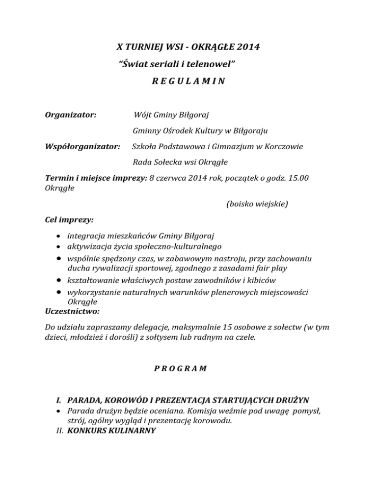 X TURNIEJ WSI - OKRĄGŁE 2014 “Świat seriali i telenowel” REGULAMIN Organizator: Wójt Gminy Biłgoraj Gminny Ośrodek Kultury w Biłgoraju Współorganizator: Szkoła Podstawowa i Gimnazjum w Korczowie Rada Sołecka wsi Okrągłe Termin i miejsce imprezy: 8 czerwca 2014 rok, początek o godz. 15.00 Okrągłe (boisko wiejskie) Cel imprezy: integracja mieszkańców Gminy Biłgoraj aktywizacja życia społeczno-kulturalnego wspólnie spędzony czas, w zabawowym nastroju, przy zachowaniu ducha rywalizacji sportowej, zgodnego z zasadami fair play kształtowanie właściwych postaw zawodników i kibiców wykorzystanie naturalnych warunków plenerowych miejscowości Okrągłe Uczestnictwo: Do udziału zapraszamy delegacje, maksymalnie 15 osobowe z sołectw (w tym dzieci, młodzież i dorośli) z sołtysem lub radnym na czele. PROGRAM I. PARADA, KOROWÓD I PREZENTACJA STARTUJĄCYCH DRUŻYN Parada drużyn będzie oceniana. Komisja weźmie pod uwagę pomysł, strój, ogólny wygląd i prezentację korowodu. II. KONKURS KULINARNY Stoisko kulinarne stoisko z potrawami regionalnymi: chleb pieczony domowym sposobem, piróg, bułka drożdżowa, placki, smalec domowy, przetwory z jagody i żurawiny, miód, nalewki i inne… Przy okazji stoiska kulinarnego prośba organizatora o przygotowanie dodatkowej tacki z potrawą na poczęstunek dla zaproszonych gości. KONKURSY SPRAWNOŚCIOWE III. Konkurs plastyczny dla Dzieci wspólne malowanie obrazu na zadany temat np. „Ulubiony bohater serialowy” (Organizator zapewnia materiały plastyczne) Konkurencje dla Młodzieży i Dorosłych Konkurencje dla pań: 1. Wiązanie krawata na czas – Drużyna wystawia 2 osoby, zawodniczkę i partnera. Zawodniczka wiąże partnerowi krawat wykonując węzeł prosty, długość krawata ma sięgać do pasa partnera. Wygrywa zawodniczka, która jako pierwsza ukończy konkurencję. Rekwizyty: krawaty zawodnicy przywożą ze sobą. 2. Bieg z wodą - Każde sołectwo wystawia jedną zawodniczkę, która kubkiem/szklanką o pojemności 250 ml w jednej ręce (bez przykrywania drugą ręką) przenosi wodę z wiadra (na linii) do plastikowej butelki o pojemności 1.5 l. Odległość między wiadrem a butelką wynosi 15 m. Wygrywa zawodniczka, która jako pierwsza zapełni butelkę. Rekwizyty: 1 wiadro, kubek/szklanka o pojemności 250 ml zawodnicy przywożą ze sobą. Organizator zapewni butelki o pojemności 1.5 litra. 3. Rzut beretem - Zawodniczka z wyznaczonego miejsca rzuca beretem jak najdalej przed siebie.Wygrywa zawodniczka, która wykona najdłuższy rzut. Rekwizyty: berety zawodnicy przywożą ze sobą Konkurencje dla panów: 4. Nawlekanie igły - W konkurencji startuje jeden zawodnik (mężczyzna) z każdego sołectwa. Zadaniem zawodnika jest nawlec 5 sztuk igieł na nitkę i zawiązać na końcu supełek. Wygrywa zawodnik z najlepszym czasem. Rekwizyty: igły i nici zabezpiecza organizator 5. Wypijanie napoju/piwa przez słomkę – Wieś wystawia jednego zawodnika. Każdy zawodnik dostaje butelkę z napojem gazowanym, otwieracz i słomkę. Na sygnał startu zawodnik otwiera butelkę i wypija w jak najszybszym czasie jej zawartość. Ukończenie zadania zawodnik sygnalizuje podniesieniem ręki do góry. Wygrywa osoba, która jako pierwsza wykona zadanie. Rekwizyty: butelkę z napojem i słomkę zapewnia organizator, otwieracze zawodnicy przywożą ze sobą. 6. Przetaczanie opony - W konkurencji startuje jeden zawodnik z każdego sołectwa. Zawodnik ma za zadanie przetoczyć oponę samochodową na odcinku o długości 20m. Wygrywa zawodnik z najlepszym czasem. Rekwizyty: opony zawodnicy przywożą ze sobą. Opona o wymiarach 185/60/R13 Konkurencje drużynowe: 7. Przeciąganie liny - W konkurencji startują po 4 osoby (2 mężczyzn i 2 kobiety) z każdego sołectwa. Konkurencja zostanie rozegrana systemem pucharowym. Rekwizyty: liny zabezpiecza organizator Konkurencje na scenie: 8. Ulubionka scenka serialowa Drużyna prezentuje na scenie dowolną scenkę serialową. Czas prezentacji maksymalnie do 5 minut. Komisja ocenia pomysł, zgodność tematyczną, stroje i grę aktorską. Wygrywają najciekawsze, najtrafniejsze i najzabawniejsze prezentacje sceniczne. 9. Serialowa wiązanka taneczna Drużyna wystawia parę tancerzy, którzy zaprezentują swoje umiejętności w wiązance znanych serialowych melodii wybranych przez organizatora. Komisja ocenia zarówno umiejętności taneczne jak i ogólną prezencję pary tancerzy. Czas prezentacji 3 minuty. Na wiązankę złożą się np. fragment walca z “Nocy i dni”, “Kariera Nikodema Dyzmy” i “Bonanza” Postanowienia końcowe Organizator powołuje dwie komisje: Pierwsza komisja ocenia stoiska kulinarne, przewiduje się I, II i III nagrodę oraz wyróżnienia dla pozostałych uczestników Druga komisja ocenia paradę drużyn oraz konkurencje sprawnościowe, przewiduje się nagrody za zajęcie I, II i III miejsca oraz dla pozostałych nagrody za udział Uczestnicy przyjeżdżają własnym transportem Rekwizyty przywiezione przez zawodników będą sprawdzane komisyjnie przed konkurencjami. Zgłoszenia udziału miejscowości prosimy składać w nieprzekraczalnym terminie do 26 maja 2014r. do Gminnego Ośrodka Kultury w Biłgoraju, Tel 84 688 28 53 Organizator zabezpiecza posiłek dla uczestników turnieju Organizator zastrzega sobie prawo interpretacji i dokonywania zmian w regulaminie. Serdecznie zapraszamy do wspólnej zabawy!