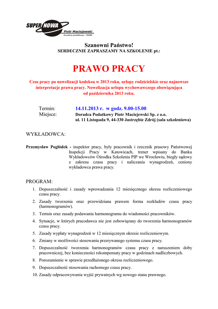 Szanowni Państwo! SERDECZNIE ZAPRASZAMY NA SZKOLENIE pt.: PRAWO PRACY Czas pracy po nowelizacji kodeksu w 2013 roku, urlopy rodzicielskie oraz najnowsze interpretacje prawa pracy. Nowelizacja urlopu wychowawczego obowiązująca od października 2013 roku. Termin: Miejsce: 14.11.2013 r. w godz. 9.00-15.00 Doradca Podatkowy Piotr Maciejewski Sp. z o.o. ul. 11 Listopada 9, 44-330 Jastrzębie Zdrój (sala szkoleniowa) WYKŁADOWCA: Przemysław Pogłódek - inspektor pracy, były pracownik i rzecznik prasowy Państwowej Inspekcji Pracy w Katowicach, trener wpisany do Banku Wykładowców Ośrodka Szkolenia PIP we Wrocławiu, biegły sądowy z zakresu czasu pracy i naliczania wynagrodzeń, ceniony wykładowca prawa pracy. PROGRAM: 1. Dopuszczalność i zasady wprowadzania 12 miesięcznego okresu rozliczeniowego czasu pracy. 2. Zasady tworzenia oraz przewidziana prawem forma rozkładów czasu pracy (harmonogramów). 3. Termin oraz zasady podawania harmonogramu do wiadomości pracowników. 4. Sytuacje, w których pracodawca nie jest zobowiązany do tworzenia harmonogramów czasu pracy. 5. Zasady wypłaty wynagrodzeń w 12 miesięcznym okresie rozliczeniowym. 6. Zmiany w możliwości stosowania przerywanego systemu czasu pracy. 7. Dopuszczalność tworzenia harmonogramów czasu pracy z naruszeniem doby pracowniczej, bez konieczności rekompensaty pracy w godzinach nadliczbowych. 8. Porozumienie w sprawie przedłużonego okresu rozliczeniowego. 9. Dopuszczalność stosowania ruchomego czasu pracy. 10. Zasady odpracowywania wyjść prywatnych wg nowego stanu prawnego. 11. Zmiany w regulaminach wynagradzania spowodowane wejściem w życie nowych przepisów o czasie pracy. 12. Czas pracy w umowie o pracę o warunkach pracy udzielanej pracownikowi. a czas pracy w informacji 13. Przepisy limitujące swobodę układania harmonogramów pracy. 14. Zasady ustalania wymiarów czasu pracy po wyroku Trybunału Konstytucyjnego z dnia 2 października 2012 roku. Czy wyrok działa wstecz. Od którego momentu należy wg nowych zasad ustalać wymiar czasu pracy. 15. Prawo pracownika do wypoczynku. 16. Systemy czasu pracy, podstawowy, równoważny, zadaniowy. 17. Zasady obliczania normalnego wynagrodzenia i dodatków za godziny nadliczbowe przy dłuższych niż miesięczny okres rozliczeniowy. 18. Podstawy naliczania wynagrodzenia i dodatku za godziny nadliczbowe. 19. Rekompensata dobowych i tygodniowych godzin nadliczbowych. 20. Skutki finansowe dla pracodawcy rozliczającego pracę poza rozkładem (tzw. harmonogramem). 21. Dyżury. 22. Czas pracy w podróży służbowej. 23. Czas szkolenia i doskonalenia zawodowego a czas pracy. 24. Badania lekarskie a czas pracy. 25. Dyskusja, pytania, przykłady, konsultacje. AGENDA: 8.45 - 9.00 rejestracja uczestników szkolenia 9.00 - 10.30 wykład 10.30 - 10.45 przerwa kawowa 10.45 - 12.15 wykład 12.15 - 13.00 przerwa (kawa, herbata, poczęstunek) 13.00 - 15.00 wykład, pytania i odpowiedzi KOSZT SZKOLENIA: • 210 zł + VAT 23% • 190 zł + VAT 23% za każdą następną osobę z tej samej instytucji WSZYSTKIM UCZESTNIKOM SZKOLENIA ZAPEWNIAMY MATERIAŁY SZKOLENIOWE I CATERING. WARUNKI UCZESTNICTWA: Szkolenie odbędzie się pod warunkiem zgłoszenia odpowiedniej liczby uczestników. Zgłoszenie na szkolenie musi zostać potwierdzone przesłaniem karty uczestnictwa (fax: 32 7500022, mail: [email protected]). Ilość miejsc jest ograniczona – o uczestnictwie decyduje kolejność zgłoszeń. Brak pisemnej rezygnacji ze szkolenia do 3 dni przed terminem jest równoznaczny z obciążeniem Państwa należnością za szkolenie. Wpłaty należy dokonać najpóźniej na 3 dni przed szkoleniem w tytule przelewu podając nazwę szkolenia. ING Bank Śląski S.A. w Jastrzębiu Zdroju NR RACHUNKU: 85 1050 1605 1000 0022 4813 2181 Dodatkowych informacji udzielają: Monika Nazarewicz tel. 32 476 36 13 wew. 202 Magdalena Buturla tel. 32 476 36 13 wew. 203 Organizator szkolenia: Doradca Podatkowy Piotr Maciejewski Sp. z o.o.