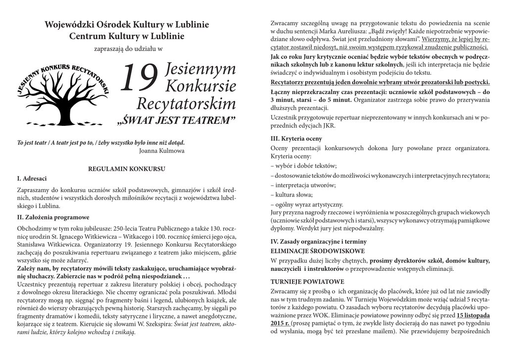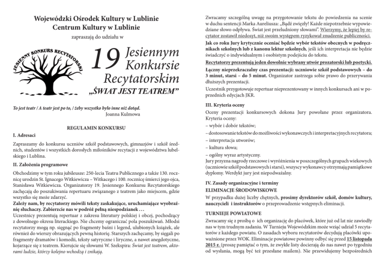 Wojewódzki Ośrodek Kultury w Lublinie Centrum Kultury w Lublinie zapraszają do udziału w 19 Jesiennym Konkursie Recytatorskim „ŚWIAT JEST TEATREM” To jest teatr / A teatr jest po to, / żeby wszystko było inne niż dotąd. Joanna Kulmowa REGULAMIN KONKURSU I. Adresaci Zapraszamy do konkursu uczniów szkół podstawowych, gimnazjów i szkół średnich, studentów i wszystkich dorosłych miłośników recytacji z województwa lubelskiego i Lublina. II. Założenia programowe Obchodzimy w tym roku jubileusze: 250-lecia Teatru Publicznego a także 130. rocznicę urodzin St. Ignacego Witkiewicza – Witkacego i 100. rocznicę śmierci jego ojca, Stanisława Witkiewicza. Organizatorzy 19. Jesiennego Konkursu Recytatorskiego zachęcają do poszukiwania repertuaru związanego z teatrem jako miejscem, gdzie wszystko się może zdarzyć. Zależy nam, by recytatorzy mówili teksty zaskakujące, uruchamiające wyobraźnię słuchaczy. Zabierzcie nas w podróż pełną niespodzianek . . . Uczestnicy prezentują repertuar z zakresu literatury polskiej i obcej, pochodzący z dowolnego okresu literackiego. Nie chcemy ograniczać pola poszukiwań. Młodsi recytatorzy mogą np. sięgnąć po fragmenty baśni i legend, ulubionych książek, ale również do wierszy obrazujących pewną historię. Starszych zachęcamy, by sięgali po fragmenty dramatów i komedii, teksty satyryczne i liryczne, a nawet anegdotyczne, kojarzące się z teatrem. Kierujcie się słowami W. Szekspira: Świat jest teatrem, aktorami ludzie, którzy kolejno wchodzą i znikają. Zwracamy szczególną uwagę na przygotowanie tekstu do powiedzenia na scenie w duchu sentencji Marka Aureliusza: „Bądź zwięzły! Każde niepotrzebnie wypowiedziane słowo odpływa. Świat jest przeludniony słowami”. Wierzymy, że lepiej by recytator zostawił niedosyt, niż swoim występem ryzykował znudzenie publiczności. Jak co roku Jury krytycznie oceniać będzie wybór tekstów obecnych w podręcznikach szkolnych lub z kanonu lektur szkolnych, jeśli ich interpretacja nie będzie świadczyć o indywidualnym i osobistym podejściu do tekstu. Recytatorzy prezentują jeden dowolnie wybrany utwór prozatorski lub poetycki. Łączny nieprzekraczalny czas prezentacji: uczniowie szkół podstawowych – do 3 minut, starsi – do 5 minut. Organizator zastrzega sobie prawo do przerywania dłuższych prezentacji. Uczestnik przygotowuje repertuar nieprezentowany w innych konkursach ani w poprzednich edycjach JKR. III. Kryteria oceny Oceny prezentacji konkursowych dokona Jury powołane przez organizatora. Kryteria oceny: – wybór i dobór tekstów; – dostosowanie tekstów do możliwości wykonawczych i interpretacyjnych recytatora; – interpretacja utworów; – kultura słowa; – ogólny wyraz artystyczny. Jury przyzna nagrody rzeczowe i wyróżnienia w poszczególnych grupach wiekowych (uczniowie szkół podstawowych i starsi), wszyscy wykonawcy otrzymają pamiątkowe dyplomy. Werdykt jury jest niepodważalny. IV. Zasady organizacyjne i terminy ELIMINACJE ŚRODOWISKOWE W przypadku dużej liczby chętnych, prosimy dyrektorów szkół, domów kultury, nauczycieli i instruktorów o przeprowadzenie wstępnych eliminacji. TURNIEJE POWIATOWE Zwracamy się z prośbą o ich organizację do placówek, które już od lat nie zawiodły nas w tym trudnym zadaniu. W Turnieju Wojewódzkim może wziąć udział 5 recytatorów z każdego powiatu. O zasadach wyboru recytatorów decydują placówki upoważnione przez WOK. Eliminacje powiatowe powinny odbyć się przed 15 listopada 2015 r. (proszę pamiętać o tym, że zwykłe listy docierają do nas nawet po tygodniu od wysłania, mogą być też przesłane mailem). Nie przewidujemy bezpośrednich zgłoszeń uczestników do Konkursu Wojewódzkiego. Zaznaczamy, że organizator będzie honorował jedynie karty opatrzone pieczęcią instytucji odpowiedzialnej za kwalifikacje powiatowe. Prosimy organizatorów eliminacji powiatowych o przesłanie kart zgłoszeń 5 recytatorów w nieprzekraczalnym terminie 16 listopada 2015 r. (mogą być przesłane faxem) na adres: WOK w Lublinie, ul. Dolna Panny Marii 3, 20-010 Lublin, tel./fax (81) 532 37 75, e-mail: [email protected] będą się 29 września 2015 r. o godz. 10.00 w Wojewódzkim Ośrodku Kultury w Lublinie, ul. Dolna Panny Marii 3. Warsztaty poprowadzi Pan Mateusz Nowak. Prosimy o zgłoszenie uczestnictwa w warsztatach do dnia 22 września drogą elektroniczną na adres: e-mail: [email protected]. W ramach szkolenia zapraszamy również na spektakl Mateusza Nowaka „Od przodu i od tyłu”. Spektakl uhonorowano licznymi nagrodami na znaczących festiwalach teatralnych w Polsce. Liczba miejsc ograniczona! TURNIEJE POWIATOWE – OGŁOSZENIA .................................................................................................................................. Placówki kultury upoważnione do delegowania recytatorów z poszczególnych powiatów: .................................................................................................................................. .................................................................................................................................. .................................................................................................................................. TURNIEJ WOJEWÓDZKI Wojewódzkie przesłuchania recytatorów odbędą się w dniach 25-26 listopada 2015 r. w Wojewódzkim Ośrodku Kultury w Lublinie, ul. Dolna Panny Marii 3 od godz. 10.00. Uczestnicy otrzymają pisemne zawiadomienie o terminie występu. Uczestników oraz ich nauczycieli lub instruktorów obowiązuje obecność od początku do końca trwania przesłuchań konkursowych w każdym z turniejów. Zachęcamy do udziału w omówieniach jurorskich prezentacji konkursowych jak również do indywidualnych rozmów z jurorami. KONCERT FINAŁOWY Wyłonieni laureaci eliminacji wojewódzkich Konkursu wystąpią w kon