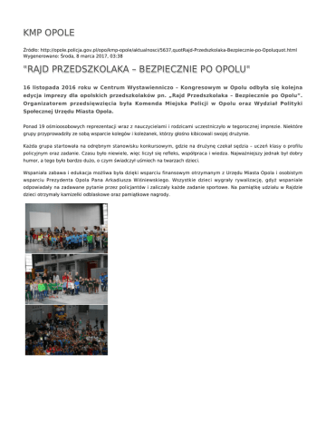 KMP OPOLE Źródło: http://opole.policja.gov.pl/opo/kmp-opole/aktualnosci/5637,quotRajd-Przedszkolaka-Bezpiecznie-po-Opoluquot.html Wygenerowano: Środa, 8 marca 2017, 03:38 "RAJD PRZEDSZKOLAKA – BEZPIECZNIE PO OPOLU" 16 listopada 2016 roku w Centrum Wystawienniczo – Kongresowym w Opolu odbyła się kolejna edycja imprezy dla opolskich przedszkolaków pn. „Rajd Przedszkolaka – Bezpiecznie po Opolu”. Organizatorem przedsięwzięcia była Komenda Miejska Policji w Opolu oraz Wydział Polityki Społecznej Urzędu Miasta Opola. Ponad 19 ośmioosobowych reprezentacji wraz z nauczycielami i rodzicami uczestniczyło w tegorocznej imprezie. Niektóre grupy przyprowadziły ze sobą wsparcie kolegów i koleżanek, którzy głośno kibicowali swojej drużynie. Każda grupa startowała na odrębnym stanowisku konkursowym, gdzie na drużynę czekał sędzia – uczeń klasy o profilu policyjnym oraz zadanie. Czasu było niewiele, więc liczył się refleks, współpraca i wiedza. Najważniejszy jednak był dobry humor, a tego było bardzo dużo, o czym świadczył uśmiech na twarzach dzieci. Wspaniała zabawa i edukacja możliwa była dzięki wsparciu finansowym otrzymanym z Urzędu Miasta Opola i osobistym wsparciu Prezydenta Opola Pana Arkadiusza Wiśniewskiego. Wszystkie dzieci wygrały rywalizację, gdyż wspaniale odpowiadały na zadawane pytanie przez policjantów i zaliczały każde zadanie sportowe. Na pamiątkę udziału w Rajdzie dzieci otrzymały kamizelki odblaskowe oraz pamiątkowe nagrody. Ocena: 0/5 (0) Tweetnij