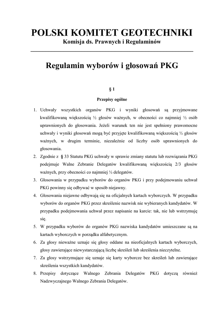 POLSKI KOMITET GEOTECHNIKI Komisja ds. Prawnych i Regulaminów ______________________________________________________ Regulamin wyborów i głosowań PKG §1 Przepisy ogólne 1. Uchwały wszystkich organów PKG i wyniki głosowań są przyjmowane kwalifikowaną większością ½ głosów waŜnych, w obecności co najmniej ½ osób uprawnionych do głosowania. JeŜeli warunek ten nie jest spełniony prawomocne uchwały i wyniki głosowań mogą być przyjęte kwalifikowaną większością ½ głosów waŜnych, w drugim terminie, niezaleŜnie od liczby osób uprawnionych do głosowania. 2. Zgodnie z § 33 Statutu PKG uchwały w sprawie zmiany statutu lub rozwiązania PKG podejmuje Walne Zebranie Delegatów kwalifikowaną większością 2/3 głosów waŜnych, przy obecności co najmniej ½ delegatów. 3. Głosowania w przypadku wyborów do organów PKG i przy podejmowaniu uchwał PKG powinny się odbywać w sposób niejawny. 4. Głosowania niejawne odbywają się na oficjalnych kartach wyborczych. W przypadku wyborów do organów PKG przez skreślenie nazwisk nie wybieranych kandydatów. W przypadku podejmowania uchwał przez napisanie na karcie: tak, nie lub wstrzymuję się. 5. W przypadku wyborów do organów PKG nazwiska kandydatów umieszczane są na kartach wyborczych w porządku alfabetycznym. 6. Za głosy niewaŜne uznaje się głosy oddane na nieoficjalnych kartach wyborczych, głosy zawierające niewystarczającą liczbę skreśleń lub skreślenia nieczytelne. 7. Za głosy wstrzymujące się uznaje się karty wyborcze bez skreśleń lub zawierające skreślenia wszystkich kandydatów. 8. Przepisy dotyczące Walnego Zebrania Delegatów Nadzwyczajnego Walnego Zebrania Delegatów. PKG dotyczą równieŜ 2 9. Delegaci na Walne Zebranie Delegatów PKG zachowują swoje prawa na Nadzwyczajnych Walnych Zebraniach Delegatów w ciągu całej kadencji. §2 Uprawnienia do głosowania 1. Zgodnie z § 18 statutu PKG uprawnionymi do głosowania na Walnym Zebraniu Delegatów PKG są jedynie delegaci na WZD, w tym: a) członkowie ustępującego Prezydium Zarządu PKG (w składzie pięcioosobowym lub sześcioosobowym), b) członkowie ustępującego Zarządu PKG ( w składzie trzyosobowym), c) członkowie ustępującej Komisji Rewizyjnej (w składzie trzyosobowym), d) Przewodniczący Sekcji Mechaniki Gruntów i Fundamentowania oraz Skał Komitetu InŜynierii Lądowej i Wodnej PAN, e) nowo wybrani przewodniczący Oddziałów lub Podkomitetów PKG, f) Honorowy Prezydent PKG, jeŜeli nie został wybrany w skład Prezydium Zarządu PKG, g) Honorowi Członkowie PKG, h) delegaci Oddziałów lub Podkomitetów PKG w liczbie jeden na kaŜdą rozpoczętą dziesiątkę członków oddziału lub podkomitetu, biorąc pod uwagę liczbę członków na dzień 31 grudnia roku poprzedzającego WZD. 2. JeŜeli delegatowi na Walne Zebranie Delegatów PKG przysługuje obecność z tytułu pełnienia kilku funkcji, to ma on prawo tylko do jednego głosu na WZD. 3. Uprawnionymi do głosowania na Walnym Zebraniu Członków Oddziału lub Podkomitetu są: a) wszyscy członkowie Oddziału lub Podkomitetu, b) Honorowi Członkowie PKG z danego Oddziału lub Podkomitetu. 4. Uprawnionymi do głosowania na zebraniach Zarządu PKG (Zarządu Oddziału PKG lub Zarządu Podkomitetu PKG) i na zebraniach Prezydium Zarządu PKG (Prezydium Zarządu Oddziału PKG lub Prezydium Zarządu Podkomitetu PKG) są członkowie tych organów. 5. Zaleca się, aby uprawnieni do głosowania otrzymywali specjalne mandaty wyborcze podczas podpisywania listy obecności, na początku zebrania. Mandaty powinny być kaŜdorazowo okazywane w trakcie pobierania kart wyborczych. 3 §3 Przewodniczący zebrania wyborczego, komisja wyborcza i komisja skrutacyjna 1. Zebraniom Prezydium Zarządu PKG i zebraniom Zarządu PKG przewodniczy prezydent PKG ( w wyjątkowych przypadkach, w razie nieobecności prezydenta PKG, jeden z wiceprezydentów PKG). 2. Zebraniom Oddziałów Prezydiów Zarządów Oddziałów (Podkomitetów) lub (Podkomitetów) przewodniczą przewodniczący Zarządów oddziałów lub podkomitetów (w wyjątkowych przypadkach, w razie nieobecności przewodniczącego oddziału lub podkomitetu, jeden z wiceprzewodniczących oddziału lub podkomitetu). 3. Walne Zebrania Delegatów PKG (Walne Zebranie Członków Oddziału lub Podkomitetu) prowadzi przewodniczący zebrania. Kandydata na przewodniczącego zebrania zgłasza ustępujący prezydent (przewodniczący Oddziału lub Podkomitetu) PKG. Wybór przewodniczącego zebrania odbywa się w sposób jawny. 4. W przypadku gdyby kandydat na przewodniczącego zebrania nie uzyskał w głosowaniu kwalifikowanej większości ½ głosów, zgłasza się trzech kandydatów z sali i ponownie przeprowadza się głosowanie jawne. Przewodniczącym zebrania zostaje osoba, która uzyskała zwykłą większość głosów. 5. Komisję Wyborczą, w liczbie 3 osób, wybiera się w sposób jawny, spośród osób zgłoszonych z sali. Członkami Komisji Wyborczej nie mogą być osoby kandydujące do organów PKG. Komisja wybiera spośród członków Przewodniczącego Komisji. 6. Podstawowym zadaniem Komisji Wyborczej jest czuwanie nad przebiegiem wyborów zgodnie z Regulaminem Wyborczym PKG. W wyjątkowych przypadkach dopuszcza się do połączenia Komisji Wyborczej z Komisją Skrutacyjną. 7. Komisję Skrutacyjną, w liczbie 3 osób, wybiera się w głosowaniu jawnym spośród osób zgłoszonych z sali, zwykłą większością głosów. Członkami Komisji Skrutacyjnej nie mogą być osoby kandydujące do organów PKG. Komisja wybiera spośród członków Przewodniczącego Komisji. 8. Do podstawowych obowiązków Komisji Skrutacyjnej naleŜą: a) sprawdzanie na początku zebrania, na podstawie listy obecności, czy zebranie jest prawomocne do podejmowania uchwał lub głosowania. Prawomocność zebrania ogłasza Przewodniczący Zebrania, b) liczenie głosów oddanych w głosowaniu jawnym i niejawnym, 4 c) sprawdzanie czy liczba odda