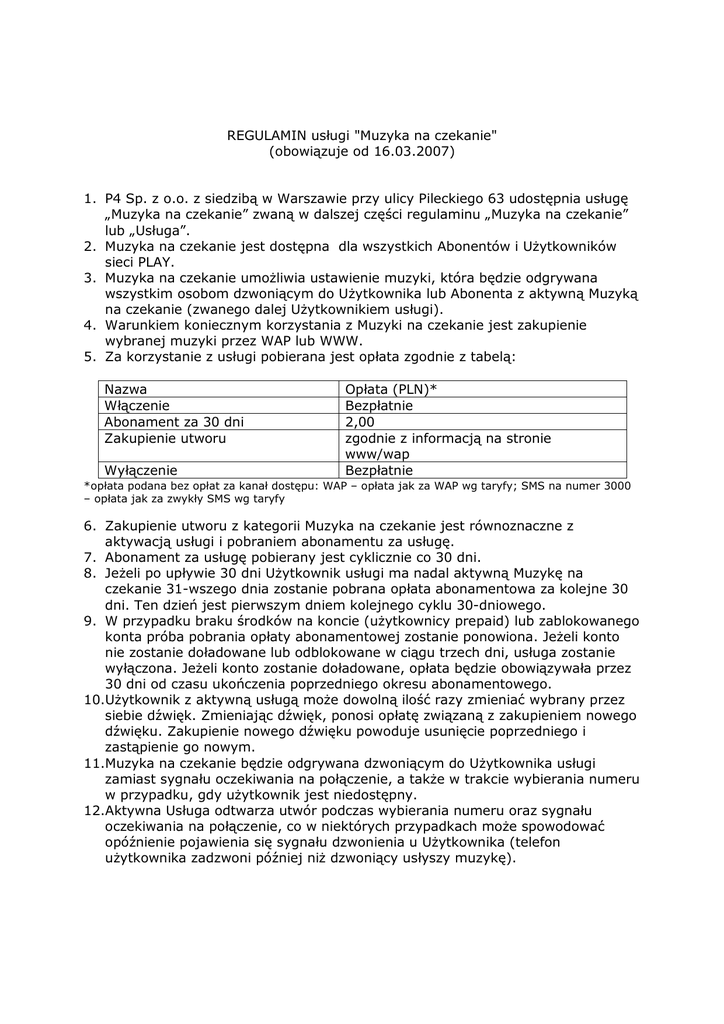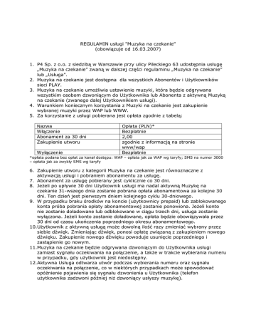 REGULAMIN usługi "Muzyka na czekanie" (obowiązuje od 16.03.2007) 1. P4 Sp. z o.o. z siedzibą w Warszawie przy ulicy Pileckiego 63 udostępnia usługę „Muzyka na czekanie” zwaną w dalszej części regulaminu „Muzyka na czekanie” lub „Usługa”. 2. Muzyka na czekanie jest dostępna dla wszystkich Abonentów i UŜytkowników sieci PLAY. 3. Muzyka na czekanie umoŜliwia ustawienie muzyki, która będzie odgrywana wszystkim osobom dzwoniącym do UŜytkownika lub Abonenta z aktywną Muzyką na czekanie (zwanego dalej UŜytkownikiem usługi). 4. Warunkiem koniecznym korzystania z Muzyki na czekanie jest zakupienie wybranej muzyki przez WAP lub WWW. 5. Za korzystanie z usługi pobierana jest opłata zgodnie z tabelą: Nazwa Włączenie Abonament za 30 dni Zakupienie utworu Wyłączenie Opłata (PLN)* Bezpłatnie 2,00 zgodnie z informacją na stronie www/wap Bezpłatnie *opłata podana bez opłat za kanał dostępu: WAP – opłata jak za WAP wg taryfy; SMS na numer 3000 – opłata jak za zwykły SMS wg taryfy 6. Zakupienie utworu z kategorii Muzyka na czekanie jest równoznaczne z aktywacją usługi i pobraniem abonamentu za usługę. 7. Abonament za usługę pobierany jest cyklicznie co 30 dni. 8. JeŜeli po upływie 30 dni UŜytkownik usługi ma nadal aktywną Muzykę na czekanie 31-wszego dnia zostanie pobrana opłata abonamentowa za kolejne 30 dni. Ten dzień jest pierwszym dniem kolejnego cyklu 30-dniowego. 9. W przypadku braku środków na koncie (uŜytkownicy prepaid) lub zablokowanego konta próba pobrania opłaty abonamentowej zostanie ponowiona. JeŜeli konto nie zostanie doładowane lub odblokowane w ciągu trzech dni, usługa zostanie wyłączona. JeŜeli konto zostanie doładowane, opłata będzie obowiązywała przez 30 dni od czasu ukończenia poprzedniego okresu abonamentowego. 10.UŜytkownik z aktywną usługą moŜe dowolną ilość razy zmieniać wybrany przez siebie dźwięk. Zmieniając dźwięk, ponosi opłatę związaną z zakupieniem nowego dźwięku. Zakupienie nowego dźwięku powoduje usunięcie poprzedniego i zastąpienie go nowym. 11.Muzyka na czekanie będzie odgrywana dzwoniącym do UŜytkownika usługi zamiast sygnału oczekiwania na połączenie, a takŜe w trakcie wybierania numeru w przypadku, gdy uŜytkownik jest niedostępny. 12.Aktywna Usługa odtwarza utwór podczas wybierania numeru oraz sygnału oczekiwania na połączenie, co w niektórych przypadkach moŜe spowodować opóźnienie pojawienia się sygnału dzwonienia u UŜytkownika (telefon uŜytkownika zadzwoni później niŜ dzwoniący usłyszy muzykę). 13.Wyłączenia usługi moŜna dokonać wysyłając SMS o treści „NIE” na numer 3000 (opłata jak za zwykły SMS) lub przez stronę wap. 14.Wyłączenie Usługi po okresie krótszym niŜ miesiąc nie powoduje zwrotu części abonamentu na konto. 15.Po wyłączeniu Usługi uprzednio opłacony abonament ulega uniewaŜnieniu i ponowna aktywacja wiąŜe się z nową opłatą abonamentową. Wyłączenie usługi powoduje utratę zakupionej muzyki. 16.Włączenie/wyłączenie usługi następuje w ciągu 24 godzin od dokonania aktywacji przez stronę wap lub www lub deaktywacji przez SMS lub wap. 17.Korzystanie z usługi oznacza akceptację regulaminu usługi. 18.P4 sp. z o.o. nie ponosi odpowiedzialności za zastąpienie wybranej muzyki przez standardowy dźwięk oczekiwania na połączenie z powodu krótkotrwałych problemów technicznych. 19.P4 Sp. z o.o. zastrzega sobie prawo do zmiany niniejszego regulaminu w dowolnym czasie. Wszelkie zmiany staja się obowiązujące w momencie ich opublikowania na stronie www dotyczącej Usługi, o ile nie zastrzeŜono inaczej.