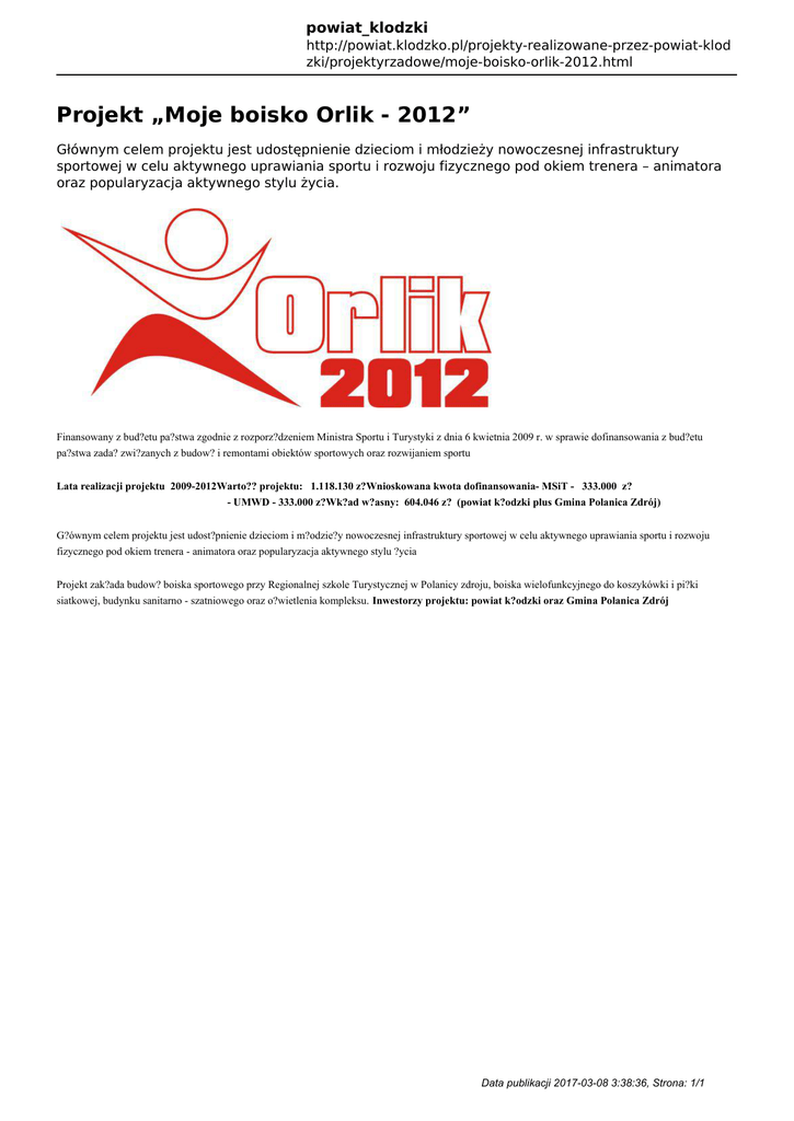 powiat_klodzki http://powiat.klodzko.pl/projekty-realizowane-przez-powiat-klod zki/projektyrzadowe/moje-boisko-orlik-2012.html Projekt „Moje boisko Orlik - 2012” Głównym celem projektu jest udostępnienie dzieciom i młodzieży nowoczesnej infrastruktury sportowej w celu aktywnego uprawiania sportu i rozwoju fizycznego pod okiem trenera – animatora oraz popularyzacja aktywnego stylu życia. Finansowany z bud?etu pa?stwa zgodnie z rozporz?dzeniem Ministra Sportu i Turystyki z dnia 6 kwietnia 2009 r. w sprawie dofinansowania z bud?etu pa?stwa zada? zwi?zanych z budow? i remontami obiektów sportowych oraz rozwijaniem sportu Lata realizacji projektu 2009-2012Warto?? projektu: 1.118.130 z?Wnioskowana kwota dofinansowania- MSiT - 333.000 z? - UMWD - 333.000 z?Wk?ad w?asny: 604.046 z? (powiat k?odzki plus Gmina Polanica Zdrój) G?ównym celem projektu jest udost?pnienie dzieciom i m?odzie?y nowoczesnej infrastruktury sportowej w celu aktywnego uprawiania sportu i rozwoju fizycznego pod okiem trenera - animatora oraz popularyzacja aktywnego stylu ?ycia Projekt zak?ada budow? boiska sportowego przy Regionalnej szkole Turystycznej w Polanicy zdroju, boiska wielofunkcyjnego do koszykówki i pi?ki siatkowej, budynku sanitarno - szatniowego oraz o?wietlenia kompleksu. Inwestorzy projektu: powiat k?odzki oraz Gmina Polanica Zdrój Data publikacji 2017-03-08 3:38:36, Strona: 1/1