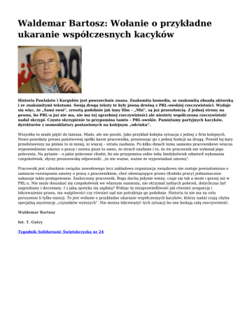 Waldemar Bartosz: Wołanie o przykładne ukaranie współczesnych kacyków Historia Pawlaków i Kargulów jest powszechnie znana. Znakomita komedia, ze znakomitą obsadą aktorską i ze znakomitymi tekstami. Swoją drogą teksty te były jawną drwiną z PRL-owskiej rzeczywistości. Wydaje się więc, że „Sami swoi”, zresztą podobnie jak inny film – „Miś”, są już przeszłością. Z jednej strony na pewno, bo PRL-u już nie ma, nie ma tej zgrzebnej rzeczywistości ale niestety współczesna rzeczywistość nadal skrzypi. Często skrzypienie to przypomina tamto – PRL-owskie. Pamiętamy partyjnych kacyków, dyrektorów z nomenklatury postawionych na kolejnym „odcinku”. Wszystko to miało pójść do lamusa. Miało, ale nie poszło. Jako przykład kolejna sytuacja z jednej z firm kolejnych. Nowo powołany prezes państwowej spółki karze pracownika, przenosząc go z jednej funkcji na drugą. Powód tej kary przedstawiony na piśmie to ni mniej, ni więcej – utrata zaufania. Po kilku dniach temu samemu pracownikowi wręcza wypowiedzenie umowy o pracę i znowu pisze to samo, że stracił zaufanie i to, że ów pracownik nie wykonał jego polecenia. Na pytanie – o jakie polecenie chodzi, bo nie przypomina sobie żeby kiedykolwiek odmówił wykonania czegokolwiek, słyszy prezesowską odpowiedź: „to nie ważne, ważne że wypowiadam umowę”. Pracownik jest członkiem związku zawodowego lecz zakładowa organizacja związkowa nie zostaje powiadomiona o zamiarze rozwiązania umowy o pracę z pracownikiem, choć obowiązujące prawo (Kodeks pracy) jednoznacznie nakazuje takie postępowanie. Zaskoczony pracownik, Bogu ducha jedynie winny, czuje się tak a może i gorzej niż w PRL-u. Nie może doszukać się czegokolwiek we własnym sumieniu, nie otrzymał żadnych poleceń, dotychczas był nagradzany i doceniany. I z jaką spotyka się zapłatą? Widząc tę niesprawiedliwość jak również arogancję i lekceważenie prawa, ma wątpliwości czy również sąd nie potraktuje go podobnie. Historia ta nie ma na celu poruszenie li tylko emocji. To jest wołanie o przykładne ukaranie współczesnych kacyków, którzy nadal czują chyba specjalną asystencję „czynników wyższych”. Nie można lekceważyć tych sytuacji bo one budują całą rzeczywistość. Waldemar Bartosz fot. T. Gutry Tygodnik Solidarność Świętokrzyska nr 24