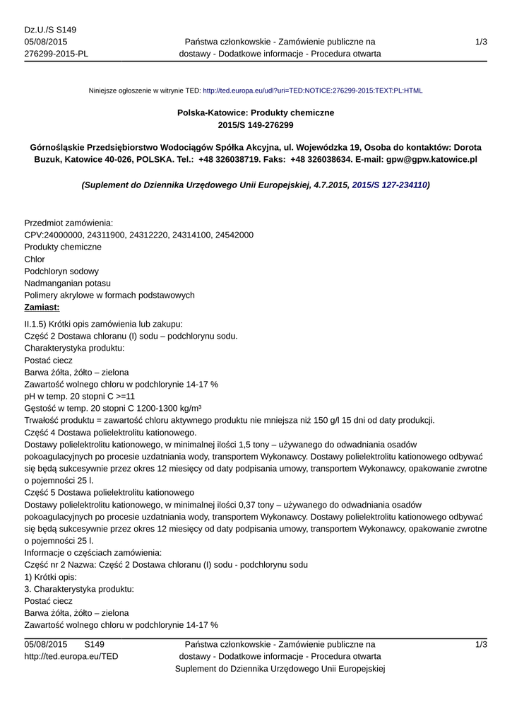 Dz.U./S S149 05/08/2015 276299-2015-PL Państwa członkowskie - Zamówienie publiczne na dostawy - Dodatkowe informacje - Procedura otwarta 1/3 Niniejsze ogłoszenie w witrynie TED: http://ted.europa.eu/udl?uri=TED:NOTICE:276299-2015:TEXT:PL:HTML Polska-Katowice: Produkty chemiczne 2015/S 149-276299 Górnośląskie Przedsiębiorstwo Wodociągów Spółka Akcyjna, ul. Wojewódzka 19, Osoba do kontaktów: Dorota Buzuk, Katowice 40-026, POLSKA. Tel.: +48 326038719. Faks: +48 326038634. E-mail: [email protected] (Suplement do Dziennika Urzędowego Unii Europejskiej, 4.7.2015, 2015/S 127-234110) Przedmiot zamówienia: CPV:24000000, 24311900, 24312220, 24314100, 24542000 Produkty chemiczne Chlor Podchloryn sodowy Nadmanganian potasu Polimery akrylowe w formach podstawowych Zamiast: II.1.5) Krótki opis zamówienia lub zakupu: Część 2 Dostawa chloranu (I) sodu – podchlorynu sodu. Charakterystyka produktu: Postać ciecz Barwa żółta, żółto – zielona Zawartość wolnego chloru w podchlorynie 14-17 % pH w temp. 20 stopni C >=11 Gęstość w temp. 20 stopni C 1200-1300 kg/m³ Trwałość produktu = zawartość chloru aktywnego produktu nie mniejsza niż 150 g/l 15 dni od daty produkcji. Część 4 Dostawa polielektrolitu kationowego. Dostawy polielektrolitu kationowego, w minimalnej ilości 1,5 tony – używanego do odwadniania osadów pokoagulacyjnych po procesie uzdatniania wody, transportem Wykonawcy. Dostawy polielektrolitu kationowego odbywać się będą sukcesywnie przez okres 12 miesięcy od daty podpisania umowy, transportem Wykonawcy, opakowanie zwrotne o pojemności 25 l. Część 5 Dostawa polielektrolitu kationowego Dostawy polielektrolitu kationowego, w minimalnej ilości 0,37 tony – używanego do odwadniania osadów pokoagulacyjnych po procesie uzdatniania wody, transportem Wykonawcy. Dostawy polielektrolitu kationowego odbywać się będą sukcesywnie przez okres 12 miesięcy od daty podpisania umowy, transportem Wykonawcy, opakowanie zwrotne o pojemności 25 l. Informacje o częściach zamówienia: Część nr 2 Nazwa: Część 2 Dostawa chloranu (I) sodu - podchlorynu sodu 1) Krótki opis: 3. Charakterystyka produktu: Postać ciecz Barwa żółta, żółto – zielona Zawartość wolnego chloru w podchlorynie 14-17 % 05/08/2015 S149 http://ted.europa.eu/TED Państwa członkowskie - Zamówienie publiczne na dostawy - Dodatkowe informacje - Procedura otwarta Suplement do Dziennika Urzędowego Unii Europejskiej 1/3 Dz.U./S S149 05/08/2015 276299-2015-PL Państwa członkowskie - Zamówienie publiczne na dostawy - Dodatkowe informacje - Procedura otwarta 2/3 pH w temp. 20 stopni C >=11 Gęstość w temp. 20 stopni C 1200-1300 kg/m³ Trwałość produktu = zawartość chloru aktywnego produktu nie mniejsza niż 150 g/l 15 dni od daty produkcji. Część nr 4 Nazwa: Część 4 Dostawa polielektrolitu kationowego 1) Krótki opis: 1. Dostawy polielektrolitu kationowego, w minimalnej ilości 1,5 tony – używanego do odwadniania osadów pokoagulacyjnych po procesie uzdatniania wody, transportem Wykonawcy. Opakowanie zwrotne o pojemności 25 l. Część nr 5 Nazwa: Część 5 Dostawa polielektrolitu kationowego 1) Krótki opis: 1. Dostawy polielektrolitu kationowego, w minimalnej ilości 0,37 tony – używanego do odwadniania osadów pokoagulacyjnych po procesie uzdatniania wody, transportem Wykonawcy. Opakowanie zwrotne o pojemności 25 l. III.1.1) Wymagane wadia i gwarancje: 3. Termin wnoszenia wadium upływa w dniu: 10.8.2015 r. o godzinie 9:00. IV.3.3) Warunki uzyskania specyfikacji i dokumentów dodatkowych: 7.8.2015 (14:30) IV.3.4) Termin składania ofert lub wniosków o dopuszczenie do udziału w postępowaniu: 10.8.2015 (9:00) IV.3.7) Warunki otwarcia ofert: 10.8.2015 (10:00) Powinno być: II.1.5) Krótki opis zamówienia lub zakupu: Część 2 Dostawa chloranu (I) sodu – podchlorynu sodu. Charakterystyka produktu: Postać ciecz Barwa żółta, żółto – zielona Zawartość aktywnego chloru w podchlorynie 14-17 % pH w temp. 20 stopni C >=11 Gęstość w temp. 20 stopni C 1200-1300 kg/m³ Trwałość produktu = zawartość chloru aktywnego produktu nie mniejsza niż 150 g/l – 30 dni od daty produkcji. Część 4 Dostawa polielektrolitu kationowego. Dostawy polielektrolitu kationowego, w minimalnej ilości 1,5 tony – używanego do odwadniania osadów pokoagulacyjnych po procesie uzdatniania wody, transportem Wykonawcy. Dostawy polielektrolitu kationowego odbywać się będą sukcesywnie przez okres 12 miesięcy od daty podpisania umowy, transportem Wykonawcy, opakowanie zwrotne zawierające po 25 kg produktu. Część 5 Dostawa polielektrolitu kationowego Dostawy polielektrolitu kationowego, w minimalnej ilości 0,37 tony – używanego do odwadniania osadów pokoagulacyjnych po procesie uzdatniania wody, transportem Wykonawcy. Dostawy polielektrolitu kationowego odbywać się będą sukcesywnie przez okres 12 miesięcy od daty podpisania umowy, transportem Wykonawcy, opakowanie zwrotne zawierające po 25 kg produktu. Informacje o częściach zamówienia: Część nr 2 Nazwa: Część 2 Dostawa chloranu (I) sodu - podchlorynu sodu 1) Krótki opis: 3. Charakterystyka produktu: Postać ciecz Barwa żółta, żółto – zielona 05/08/2015 S149 http://ted.europa.eu/TED Państwa członkowskie - Zamówienie publiczne na dostawy - Dodatkowe informacje - Procedura otwarta Suplement do Dziennika Urzędowego Unii Europejskiej 2/3 Dz.U./S S149 05/08/2015 276299-2015-PL Państwa członkowskie - Zamówienie publiczne na dostawy - Dodatkowe informacje - Procedura otwarta 3/3 Zawartość aktywnego chloru w podchlorynie 14-17 % pH w temp. 20 stopni C >=11 Gęstość w temp. 20 stopni C 1200-1300 kg/m³ Trwałość produktu = zawartość chloru aktywnego produktu nie mniejsza niż 150 g/l – 30 dni od daty produkcji. Część nr 4 Nazwa: Część 4 Dostawa polielektrolitu kationowego 1) Krótki opis: 1. Dostawy polielektrolitu kationowego, w minimalnej ilości 1,5 tony – u