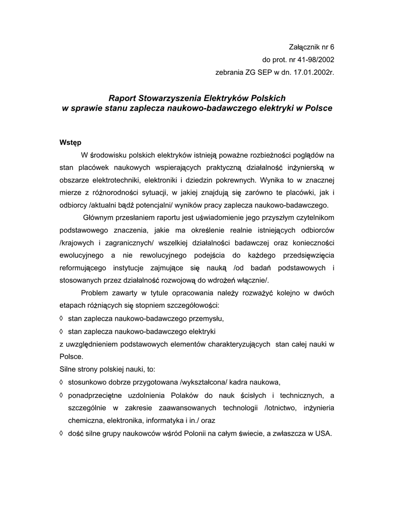 Zał cznik nr 6 do prot. nr 41-98/2002 zebrania ZG SEP w dn. 17.01.2002r. Raport Stowarzyszenia Elektryków Polskich w sprawie stanu zaplecza naukowo-badawczego elektryki w Polsce Wst p W rodowisku polskich elektryków istniej powa ne rozbie no ci pogl dów na stan placówek naukowych wspieraj cych praktyczn działalno in yniersk w obszarze elektrotechniki, elektroniki i dziedzin pokrewnych. Wynika to w znacznej mierze z ró norodno ci sytuacji, w jakiej znajduj si zarówno te placówki, jak i odbiorcy /aktualni b d potencjalni/ wyników pracy zaplecza naukowo-badawczego. Głównym przesłaniem raportu jest u wiadomienie jego przyszłym czytelnikom podstawowego znaczenia, jakie ma okre lenie realnie istniej cych odbiorców /krajowych i zagranicznych/ wszelkiej działalno ci badawczej oraz konieczno ci ewolucyjnego a nie rewolucyjnego podej cia reformuj cego instytucje zajmuj ce si nauk do ka dego /od bada przedsi wzi cia podstawowych i stosowanych przez działalno rozwojow do wdro e wł cznie/. Problem zawarty w tytule opracowania nale y rozwa y kolejno w dwóch etapach ró ni cych si stopniem szczegółowo ci: stan zaplecza naukowo-badawczego przemysłu, stan zaplecza naukowo-badawczego elektryki z uwzgl dnieniem podstawowych elementów charakteryzuj cych stan całej nauki w Polsce. Silne strony polskiej nauki, to: stosunkowo dobrze przygotowana /wykształcona/ kadra naukowa, ponadprzeci tne uzdolnienia Polaków do nauk cisłych i technicznych, a szczególnie w zakresie zaawansowanych technologii /lotnictwo, in ynieria chemiczna, elektronika, informatyka i in./ oraz do silne grupy naukowców w ród Polonii na całym wiecie, a zwłaszcza w USA. 2 Słabe strony polskiej nauki daj si sprowadzi do trzech, wzajemnie sprz onych ze sob ródeł: niskie, zarówno w liczbach bezwzgl dnych, jak i w przeliczeniu na jednego mieszka ca, finansowanie bada naukowych /zarówno z bud etu, jak i z gospodarki/; katastrofalna, pr dko pogł biaj ca si „przerwa pokoleniowa”, tj. niedopuszczalnie niski stosunek ilo ciowy młodej i redniej kadry naukowej do pracowników w wieku powy ej 50 lat; szybko post puj cy upadek krytyki naukowej, nadmiar przesadnie pozytywnych ocen, tragiczny zanik mechanizmów samoreguluj cych poziom bada . 1. Stan zaplecza naukowo-badawczego przemysłu „Specjalno ci polsk ” w zakresie organizacji nauki jest podział tej ostatniej na trzy piony: szkolnictwo wy sze, akademie nauk /PAN, PAU/ i jednostki badawczorozwojowe /JBR-y/. Dotychczasowe posuni cia reformuj ce nauk oraz wymienione wy ej ogólne słabo ci polskiej nauki podział ten jedynie pogł biły. Drug „specjalno ci ” jest zachwianie proporcji mi dzy finansowaniem nauk podstawowych /poznawczych/ i finansowaniem nauk stosowanych a zwłaszcza prac rozwojowych, szczególnie na niekorzy tych ostatnich. Zjawisko to wyst puje jednak tak e w innych krajach znajduj cych si na niskim poziomie rozwoju i ma dwie główne przyczyny: w badaniach poznawczych łatwo o znacz cy i efektowny sukces osi gni ty w stosunkowo w skim, izolowanym zagadnieniu, a wi c i przy u yciu niewielkich rodków finansowych. Badania stosowane, a zwłaszcza prace rozwojowe, aby miały jakie osi gni cia licz ce si na wiecie, wymagaj rodków wielokrotnie wi kszych. Jednocze nie, a ta przyczyna jest jeszcze wa niejsza, w krajach rozwini tych i bogatych wi kszo rodków na badania ło ró ne dziedziny gospodarki, a przede wszystkim przemysł i w najlepiej rozumianym, własnym interesie, dofinansowuj głównie badania stosowane i prace rozwojowe. Obecnie w Polsce, z punktu widzenia udziału nauki w zaspokajaniu potrzeb przemysłu, wy sze uczelnie borykaj ce si z przerastaj c ich mo liwo ci liczb ch tnych do studiowania oraz instytuty PAN nie b d ce na ogół nastawione na prowadzenie bada stosowanych, a zwłaszcza prac rozwojowych - praktycznie nie mog zaspokaja potrzeb przemysłu. Jednostki badawczo-rozwojowe - instytuty, o rodki, centra, samodzielne laboratoria - cierpi na te same schorzenia, co cała nauka, a jednocze nie w znacznej mierze utraciły swych dotychczasowych 3 odbiorców i mo liwo ci podejmowania odpowiednio du ych przedsi wzi charakterystycznych dla systemów centralnego sterowania nauk i gospodark . W krajach o wysokim stopniu rozwoju ródłem du ych przedsi wzi s wielkie, przewa nie ponadnarodowe koncerny, a rzadziej /w krajach naprawd bogatych/ rz dy lub zwi zane z rz dami fundacje. Małe fragmentaryczne, izolowane przedsi wzi cia, w których brak ci gło ci poczyna wdro enie do produkcji, staj si od bada poznawczych po ju od paru dziesi tków lat „nauk b d „naukowym serwisem”, a te obecnie s dla ubogich” coraz mniej opłacalne i coraz mniej potrzebne, jak coraz mniej potrzebne s warsztaty naprawcze samochodów bazuj ce na r cznie dorabianych cz ciach. Wielu polityków z całego tego zjawiska zauwa a tylko jeden element - JBR-y s reliktem centralnego sterowania. Do niezbyt wesołego, naszkicowanego wy ej obrazu, dochodzi wi c jeszcze niech mediów i niektórych organów zarz dzaj cych /cz KBN-u/ wobec najwa niejszego z punktu widzenia potrzeb przemysłu, a tak e szerzej - gospodarki /rolnictwo, budownictwo, medycyna itp./ - pionu nauki. Z drugiej strony nie wolno zapomnie , e zwłaszcza w dobie ogromnych przekształce gospodarczych i szybkiego wchodzenia obcego kapitału na polski rynek, rola JBR-ów jest nie do przecenienia. Tylko ich działalno , a nawet samo istnienie, wydatnie wspomagaj utrzymanie, a w przyszło ci rozwój rodzimej produkcji z udziałem wysokich technologii, gdy poj tym własnym interesie, staraj sprzeda si wytwórcy zagraniczni, w dobrze w nowo opanowywanym kraju rozwin swych wyrobów z fabryk od dawna działaj cych lub zakłada głównie fabryki - montownie wymagaj ce jedynie niskokwalifikowanych pracowników, wykorzystuj ce my l techniczn fabryk - matek i ich zaplecza. St d we wszystkich rozwini tych krajach importowi innowacji towarzysz odpowiednio sformułowane warunki wykorzystania rodzimej my li technicz