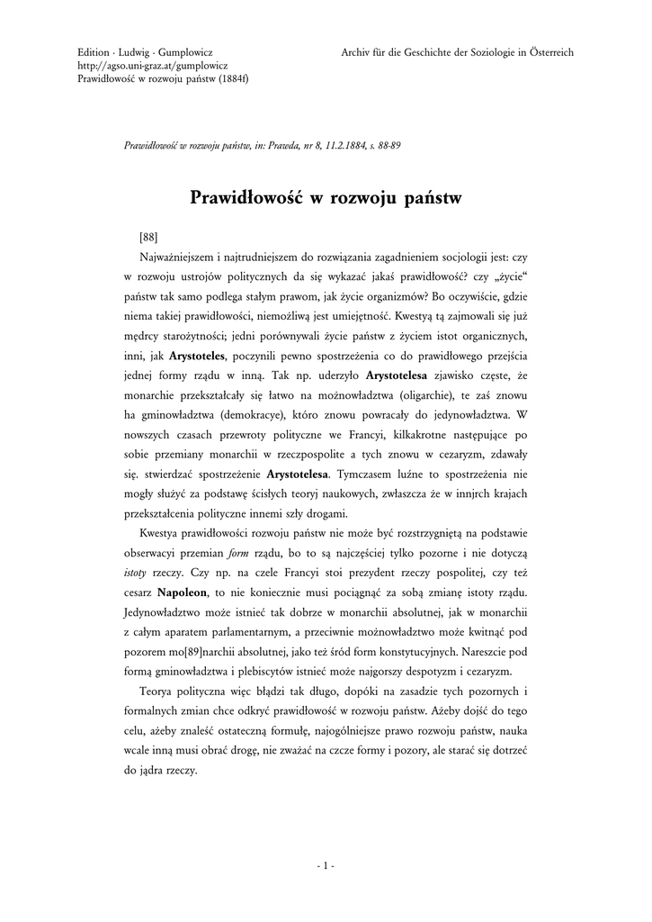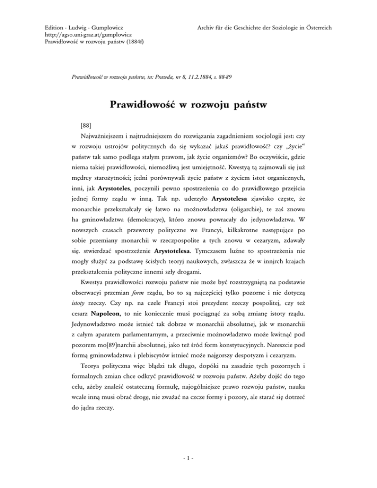 Edition · Ludwig · Gumplowicz http://agso.uni-graz.at/gumplowicz Prawidłowość w rozwoju państw (1884f) Archiv für die Geschichte der Soziologie in Österreich Prawidłowość w rozwoju państw, in: Prawda, nr 8, 11.2.1884, s. 88-89 Prawidłowość w rozwoju państw [88] Najważniejszem i najtrudniejszem do rozwiązania zagadnieniem socjologii jest: czy w rozwoju ustrojów politycznych da się wykazać jakaś prawidłowość? czy „życie“ państw tak samo podlega stałym prawom, jak życie organizmów? Bo oczywiście, gdzie niema takiej prawidłowości, niemożliwą jest umiejętność. Kwestyą tą zajmowali się już mędrcy starożytności; jedni porównywali życie państw z życiem istot organicznych, inni, jak Arystoteles, poczynili pewno spostrzeżenia co do prawidłowego przejścia jednej formy rządu w inną. Tak np. uderzyło Arystotelesa zjawisko częste, że monarchie przekształcały się łatwo na możnowładztwa (oligarchie), te zaś znowu ha gminowładztwa (demokracye), któro znowu powracały do jedynowładztwa. W nowszych czasach przewroty polityczne we Francyi, kilkakrotne następujące po sobie przemiany monarchii w rzeczpospolite a tych znowu w cezaryzm, zdawały się. stwierdzać spostrzeżenie Arystotelesa. Tymczasem luźne to spostrzeżenia nie mogły służyć za podstawę ścisłych teoryj naukowych, zwłaszcza że w innjrch krajach przekształcenia polityczne innemi szły drogami. Kwestya prawidłowości rozwoju państw nie może być rozstrzygniętą na podstawie obserwacyi przemian form rządu, bo to są najczęściej tylko pozorne i nie dotyczą istoty rzeczy. Czy np. na czele Francyi stoi prezydent rzeczy pospolitej, czy też cesarz Napoleon, to nie koniecznie musi pociągnąć za sobą zmianę istoty rządu. Jedynowładztwo może istnieć tak dobrze w monarchii absolutnej, jak w monarchii z całym aparatem parlamentarnym, a przeciwnie możnowładztwo może kwitnąć pod pozorem mo[89]narchii absolutnej, jako też śród form konstytucyjnych. Nareszcie pod formą gminowładztwa i plebiscytów istnieć może najgorszy despotyzm i cezaryzm. Teorya polityczna więc błądzi tak długo, dopóki na zasadzie tych pozornych i formalnych zmian chce odkryć prawidłowość w rozwoju państw. Ażeby dojść do tego celu, ażeby znaleść ostateczną formułę, najogólniejsze prawo rozwoju państw, nauka wcale inną musi obrać drogę, nie zważać na czcze formy i pozory, ale starać się dotrzeć do jądra rzeczy. -1- Edition · Ludwig · Gumplowicz http://agso.uni-graz.at/gumplowicz Prawidłowość w rozwoju państw (1884f) Archiv für die Geschichte der Soziologie in Österreich Wiemy już, że państwa wszędzie i zawsze składają się z różnorodnych żywiołów społecznych. Otóż życie państwa i rozwój jego nie są niczem innem, jak nieustaunym szeregiem przemian i zjawisk, następujących po sobie wskutek działania i przeciwdziałania wzajemnego tych żywiołów. Jeżeli więc uda się wyrazić je ogólnie, to jest, jeżeli zdołamy w nich dostrzedz ogólne typy, wszędzie i zawsze powtarzające się, jeżeli następnie dla stosunku ich wzajemnego potrafimy wynaleść stalą formułę, że tak powiem, matematyczną, to jest, jeżeli znajdziemy najogólniejsze prawo, według którego wszędzie i zawsze te typowe składniki na siebie działają i postępują: wtedy będziemy mieli w ręce klucz do zagadki prawidłowego rozwoju państw. Bo jeżeli różnorodne żywioły społeczne państw dadzą się zredukować do niewielu form typowych, a stosunek wzajemny owych typów da się wyrazić w ogólnem prawie – to oczywista, że rozwój każdego państwa przedstawi nam się już tylko jako rachunek czysty, jako operacya naukowa, w której ze znanych czynników obliczyć możemy konieczny rezultat. Przypatrzmy się więc, czy w składowych żywiołach państw można odkryć takie typy ogólne i czy dla wzajemnego stosunku ich do siebie da się wynaleść ogólne prawo? Jako organizacya władzy jednych nad drugimi każde państwo z natury rzeczy musi się składać z panujących i opanowanych. Te dwie klasy ludności stanowią niejako szkielet każdego państwa. Każde panowanie potrzebuje pracy podległych. I otóż ogólne prawo, wyraża wiecznie i wszędzie zachodzący stosunek między panującymi a opanowanymi: ci ostatni pracują nietylko dla siebie, ale nadwyżka owoców, czy zysku ich pracy musi służyć na utrzymanie panowania. W tym stosunku leży istota państwa, bez niego ustrój państwowy byłby niemożliwym. Ponieważ stosunek ten jest konieczny a nadto każdy żywioł, każda klasa społeczna (czy też stan) dąży zawsze do zajęcia stanowiska lepszego: stąd wypada, że rozwój państwowy idzie zawsze w kierunku tych dążności i w miarę materyalnychi moralnych sił owych poszczególnych żywiołów społecznych. Do tego dodać należy, że w rozwoju państwo wzrasta i w obręb swój wciąga najróżnorodniejsze pierwiastki, które odpowiednio do sił i środków swoich zajmują najrozmaitsze stopnie w hierarchii społecznej: każdy zaś z żywiołów, jakiekolwiek zajmuje stanowisko, zawsze dąży do opanowania innych, do obracania zysków pracy obcych na swoje cele, przez co życie wewnętrzne państwa, przedstawiające się nam jako bezustanna walka polityczna i ekonomiczna klas społecznych, staje się coraz zawilsze, co wprawdzie nie usuwa prawidłowości rozwoju, ale obliczenie jej choćby -2- Edition · Ludwig · Gumplowicz http://agso.uni-graz.at/gumplowicz Prawidłowość w rozwoju państw (1884f) Archiv für die Geschichte der Soziologie in Österreich tylko prawdopodobne czyni nadzwyczaj trudnem, zwłaszcza, że na wewnętrzny rozwój państwa wpływają częstokroć czynniki zewnętrzne. Najprostszym będzie rozwój państwa tam, gdzie na niewielkiem terytoryum możnowładztwo panuje nad klasą poddanych rolników i z nadwyżki zysków pracy ich żyje. Dopóki ono zdoła utrzymać lud poddany w ciemności i ubóstwie