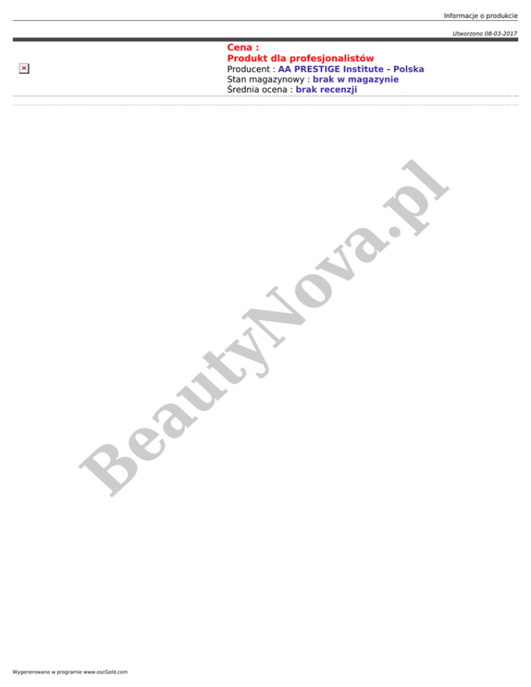 Informacje o produkcie Utworzono 08-03-2017 Cena : Produkt dla profesjonalistów B ea ut yN ov a. pl Producent : AA PRESTIGE Institute - Polska Stan magazynowy : brak w magazynie Średnia ocena : brak recenzji Wygenerowano w programie www.oscGold.com