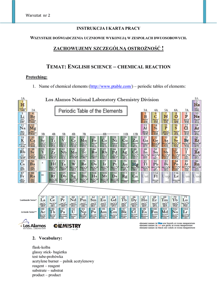 Warsztat nr 2 INSTRUKCJA I KARTA PRACY WSZYSTKIE DOŚWIADCZENIA UCZNIOWIE WYKONUJĄ W ZESPOŁACH DWUOSOBOWYCH. ZACHOWUJEMY SZCZEGÓLNĄ OSTROŻNOŚĆ ! TEMAT: ENGLISH SCIENCE – CHEMICAL REACTION Preteching: 1. Name of chemical elements (http://www.ptable.com/) – periodic tables of elements: 2. Vocabulary: flask-kolba glassy stick- bagietka test tube-probówka acetylene burner – palnik acetylenowy reagent – reagent substrate – substrat product – product Warsztat nr 2 funnel – lejek beaker – zlewka pipette - pipeta Follow experiments as instructed. 1. Oxidation of 2.4 g of magnesium formed 4g magnesium oxide. How many grams of oxygen used up in the reaction? Calculation: Reaction:……………………………………………………………………………………………….. Experiment: The appropriate quantity of magnesium put on the film and warmed over the burner. Draft of the Experiment: Scientific observations: Final findings (name the substrates and product): Warsztat nr 2 2. Was mixed 1.4 g of aluminum with sulfur, then the mixture was heated. How many grams of product was obtained in the chemical reaction. Calculation: Reaction:……………………………………………………………………………………………….. Experiment: The appropriate quantity of aluminum put on the film and warmed over the burner. Draft of the Experiment: Scientific observations: Final findings (name the substrates and product):