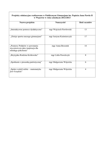 Projekty edukacyjne realizowane w Publicznym Gimnazjum im. Papieża Jana Pawła II w Wąsewie w roku szkolnym 2012/2013 Nazwa projektu Nauczyciel Ilość uczniów „Interaktywne pomoce dydaktyczne” mgr Wojciech Pawłowski 13 „Dzieje sportu naszego gimnazjum” mgr Justyna Kuśmierczyk 17 „Postawy Polaków w powstaniu styczniowym jako inspiracja dla młodego pokolenia” mgr Anna Brzostek 14 „Brytyjska Rodzina Królewska” mgr Lidia Pawelczyk 8 „Spotkanie z piosenką patriotyczną” mgr Małgorzata Wójcicka 6 „Spójrz wokół siebie – matematyka jest wszędzie” mgr Małgorzata Wójcicka 4