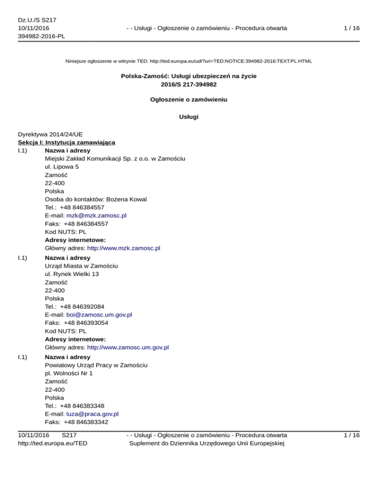 Dz.U./S S217 10/11/2016 394982-2016-PL - - Usługi - Ogłoszenie o zamówieniu - Procedura otwarta 1 / 16 Niniejsze ogłoszenie w witrynie TED: http://ted.europa.eu/udl?uri=TED:NOTICE:394982-2016:TEXT:PL:HTML Polska-Zamość: Usługi ubezpieczeń na życie 2016/S 217-394982 Ogłoszenie o zamówieniu Usługi Dyrektywa 2014/24/UE Sekcja I: Instytucja zamawiająca I.1) Nazwa i adresy Miejski Zakład Komunikacji Sp. z o.o. w Zamościu ul. Lipowa 5 Zamość 22-400 Polska Osoba do kontaktów: Bożena Kowal Tel.: +48 846384557 E-mail: [email protected] Faks: +48 846384557 Kod NUTS: PL Adresy internetowe: Główny adres: http://www.mzk.zamosc.pl I.1) Nazwa i adresy Urząd Miasta w Zamościu ul. Rynek Wielki 13 Zamość 22-400 Polska Tel.: +48 846392084 E-mail: [email protected] Faks: +48 846393054 Kod NUTS: PL Adresy internetowe: Główny adres: http://www.zamosc.um.gov.pl I.1) Nazwa i adresy Powiatowy Urząd Pracy w Zamościu pl. Wolności Nr 1 Zamość 22-400 Polska Tel.: +48 846383348 E-mail: [email protected] Faks: +48 846383342 10/11/2016 S217 http://ted.europa.eu/TED - - Usługi - Ogłoszenie o zamówieniu - Procedura otwarta Suplement do Dziennika Urzędowego Unii Europejskiej 1 / 16 Dz.U./S S217 10/11/2016 394982-2016-PL - - Usługi - Ogłoszenie o zamówieniu - Procedura otwarta 2 / 16 Kod NUTS: PL Adresy internetowe: Główny adres: http://zamosc.praca.gov.pl I.1) Nazwa i adresy Straż Miejska w Zamościu ul. Rynek Wielki 13 Zamość 22-400 Polska Tel.: +48 846399341 E-mail: [email protected] Faks: +48 846399341 Kod NUTS: PL Adresy internetowe: Główny adres: http://www.strazmiejska.zamosc.pl/ I.1) Nazwa i adresy Zarząd Dróg Grodzkich w Zamościu ul. Partyzantów 61 Zamość 22-400 Polska Tel.: +48 846383198 E-mail: [email protected] Faks: +48 846396189 Kod NUTS: PL Adresy internetowe: Główny adres: http://www.zdg-zamosc.nowybip.pl/ I.1) Nazwa i adresy Ogród Zoologiczny w Zamościu ul. Szczebrzeska 12 Zamość 22-400 Polska Tel.: +48 846393470 E-mail: [email protected] Faks: +48 846393470 Kod NUTS: PL Adresy internetowe: Główny adres: http://www.zoo.zamosc.pl/ I.1) Nazwa i adresy Miejskie Centrum Pomocy Rodzinie w Zamościu ul. Lwowska 57 Zamość 22-400 Polska 10/11/2016 S217 http://ted.europa.eu/TED - - Usługi - Ogłoszenie o zamówieniu - Procedura otwarta Suplement do Dziennika Urzędowego Unii Europejskiej 2 / 16 Dz.U./S S217 10/11/2016 394982-2016-PL - - Usługi - Ogłoszenie o zamówieniu - Procedura otwarta 3 / 16 Tel.: +48 846775630 E-mail: [email protected] Faks: +48 846775640 Kod NUTS: PL Adresy internetowe: Główny adres: http://www.mcpr.zamosc.pl/ I.1) Nazwa i adresy Pogotowie Opiekuńcze w Zamościu ul. Źródlana 1a Zamość 22-400 Polska Tel.: +48 846169421 E-mail: [email protected] Faks: +48 846169421 Kod NUTS: PL Adresy internetowe: Główny adres: http://www.pozamosc.neostrada.pl/ I.1) Nazwa i adresy Środowiskowy Dom Samopomocy w Zamościu ul. Sadowa 51a Zamość 22-400 Polska Tel.: +48 846412117 E-mail: [email protected] Faks: +48 846493437 Kod NUTS: PL Adresy internetowe: Główny adres: http://www.zamosc.naszsds.pl/ I.1) Nazwa i adresy Dom Dziecka w Zamościu ul. Źródlana 1a Zamość 22-400 Polska Tel.: +48 846169196 E-mail: [email protected] Faks: +48 846169197 Kod NUTS: PL Adresy internetowe: Główny adres: http://www.domydziecka.org/placowka,1203.html I.1) Nazwa i adresy Organizator Pieczy Zastępczej i Wspierania Rodziny w Zamościu ul. Bolesława Prusa 2 10/11/2016 S217 http://ted.europa.eu/TED - - Usługi - Ogłoszenie o zamówieniu - Procedura otwarta Suplement do Dziennika Urzędowego Unii Europejskiej 3 / 16 Dz.U./S S217 10/11/2016 394982-2016-PL - - Usługi - Ogłoszenie o zamówieniu - Procedura otwarta 4 / 16 Zamość 22-400 Polska Tel.: +48 846270773 E-mail: [email protected] Faks: +48 846270773 Kod NUTS: PL Adresy internetowe: Główny adres: https://sites.google.com/site/opziwr I.1) Nazwa i adresy Centrum Kultury Filmowej „Stylowy” w Zamościu ul. Odrodzenia 9 Zamość 22-400 Polska Tel.: +48 846392313 E-mail: [email protected] Faks: +48 846392313 Kod NUTS: PL Adresy internetowe: Główny adres: http://www.stylowy.net/ I.1) Nazwa i adresy Książnica Zamojska w Zamościu ul. Kamienna 20 Zamość 22-400 Polska Tel.: +48 846271154 E-mail: [email protected] Faks: +48 846271154 Kod NUTS: PL Adresy internetowe: Główny adres: http://biblioteka.zamosc.pl/ I.1) Nazwa i adresy Centrum Kształcenia Zawodowego i Ustawicznego w Zamościu ul. Partyzantów 14 Zamość 22-400 Polska Tel.: +48 846271360 E-mail: [email protected] Faks: +48 846386590 Kod NUTS: PL Adresy internetowe: Główny adres: http://ckziu.zamosc.pl/ 10/11/2016 S217 http://ted.europa.eu/TED - - Usługi - Ogłoszenie o zamówieniu - Procedura otwarta Suplement do Dziennika Urzędowego Unii Europejskiej 4 / 16 Dz.U./S S217 10/11/2016 394982-2016-PL - - Usługi - Ogłoszenie o zamówieniu - Procedura otwarta I.1) Nazwa i adresy Specjalny Ośrodek Szkolno – Wychowawczy w Zamościu ul. Śląska 45A Zamość 22-400 Polska Tel.: +48 846392525 E-mail: [email protected] Faks: +48 846396760 Kod NUTS: PL Adresy internetowe: Główny adres: http://www.soswzamosc.internetdsl.pl/ I.1) Nazwa i adresy Poradnia Psychologiczno – Pedagogiczna Nr 1 w Zamościu ul. Okrzei 24 Zamość 22-400 Polska Tel.: +48 846395699 E-mail: [email protected] Faks: +48 846395699 Kod NUTS: PL Adresy internetowe: Główny adres: http://www.pppnr1zamosc.pl/ I.1) Nazwa i adresy Żłobek Miejski w Zamościu ul. Kamienna 4 Zamość 22-400 Polska Tel.: +48 846275014 E-mail: [email protected] Faks: +48 846275014 Kod NUTS: PL Adresy internetowe: Główny adres: http://zlobek.zamosc.pl/ I.1) Nazwa i adresy Zespół Szkół Nr 1 z oddziałami integracyjnymi w Zamościu ul. Peowiaków 30 A Zamość 22-400 Polska Tel.: +48 846385047 E-mail: [email protected] Faks: +48 846385047 10/11/2016 S217 http://ted.europa.eu/TED - - Usługi - Ogłoszenie o zamówieniu - Procedura otwarta Suplement do Dziennika Urzędowego Unii Europ
