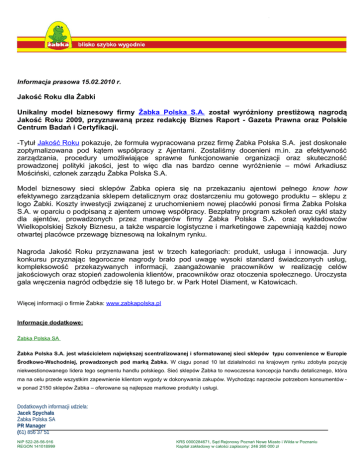Żabka Polska S.A. 61-821 Poznań, ul. Ogrodowa 12, tel. +48 618 563 700, fax +48 618 525 313 Informacja prasowa 15.02.2010 r. Jakość Roku dla Żabki Unikalny model biznesowy firmy Żabka Polska S.A. został wyróżniony prestiżową nagrodą Jakość Roku 2009, przyznawaną przez redakcję Biznes Raport - Gazeta Prawna oraz Polskie Centrum Badań i Certyfikacji. -Tytuł Jakość Roku pokazuje, że formuła wypracowana przez firmę Żabka Polska S.A. jest doskonale zoptymalizowana pod kątem współpracy z Ajentami. Zostaliśmy docenieni m.in. za efektywność zarządzania, procedury umożliwiające sprawne funkcjonowanie organizacji oraz skuteczność prowadzonej polityki jakości, jest to więc dla nas bardzo cenne wyróżnienie – mówi Arkadiusz Mościński, członek zarządu Żabka Polska S.A. Model biznesowy sieci sklepów Żabka opiera się na przekazaniu ajentowi pełnego know how efektywnego zarządzania sklepem detalicznym oraz dostarczeniu mu gotowego produktu – sklepu z logo Żabki. Koszty inwestycji związanej z uruchomieniem nowej placówki ponosi firma Żabka Polska S.A. w oparciu o podpisaną z ajentem umowę współpracy. Bezpłatny program szkoleń oraz cykl staży dla ajentów, prowadzonych przez managerów firmy Żabka Polska S.A. oraz wykładowców Wielkopolskiej Szkoły Biznesu, a także wsparcie logistyczne i marketingowe zapewniają każdej nowo otwartej placówce przewagę biznesową na lokalnym rynku. Nagroda Jakość Roku przyznawana jest w trzech kategoriach: produkt, usługa i innowacja. Jury konkursu przyznając tegoroczne nagrody brało pod uwagę wysoki standard świadczonych usług, kompleksowość przekazywanych informacji, zaangażowanie pracowników w realizację celów jakościowych oraz stopień zadowolenia klientów, pracowników oraz otoczenia społecznego. Uroczysta gala wręczenia nagród odbędzie się 18 lutego br. w Park Hotel Diament, w Katowicach. Więcej informacji o firmie Żabka: www.zabkapolska.pl Informacje dodatkowe: Żabka Polska SA Żabka Polska S.A. jest właścicielem największej scentralizowanej i sformatowanej sieci sklepów typu convenience w Europie Środkowo-Wschodniej, prowadzonych pod marką Żabka. W ciągu ponad 10 lat działalności na krajowym rynku zdobyła pozycję niekwestionowanego lidera tego segmentu handlu polskiego. Sieć sklepów Żabka to nowoczesna koncepcja handlu detalicznego, która ma na celu przede wszystkim zapewnienie klientom wygody w dokonywania zakupów. Wychodząc naprzeciw potrzebom konsumentów w ponad 2150 sklepów Żabka – oferowane są najlepsze markowe produkty i usługi. Dodatkowych informacji udziela: Jacek Spychała Żabka Polska SA PR Manager (61) 856 37 51 NIP 522-28-56-916 REGON 141018999 KRS 0000284671, Sąd Rejonowy Poznań Nowe Miasto i Wilda w Poznaniu Kapitał zakładowy w całości zapłacony: 246 260 000 zł Żabka Polska S.A. 61-821 Poznań, ul. Ogrodowa 12, tel. +48 618 563 700, fax +48 618 525 313 www.zabka.pl W 2007 roku 100% akcji Żabka Polska S.A. zostało zakupione przez środkowo-europejską grupę inwestycyjną Penta Investments. Nowy właściciel kontynuuje i wspiera strategię rozwoju spółki i dalszą rozbudowę formatu convenience w Polsce. Doświadczenie firmy na rynku krajowym planuje wykorzystać na rynku czeskim. Wizja firmy Żabka Polska S.A. zakłada umacnianie pozycji największej i nowoczesnej sieci sklepów typu convenience w Polsce. Podstawowym celem firmy jest stały rozwój sieci, efektywna obsługa sklepów oraz stworzenie wyjątkowej oferty towarów i usług, zaspokajającej maximum potrzeb lokalnych społeczności. Aby zrealizować tę misję sklepy sieci Żabka posiadają dogodne lokalizacje i charakteryzują się powierzchnią sprzedaży – ok. 60 m², umożliwiającą szybkie i wygodne zakupy. Sklepy są czynne od 6.00 do 23.00 przez 365 dni w roku. W 2009 roku spółka rozpoczęła tworzenie nowej sieci, większych sklepów o charakterze delikatesowym pod nazwą Freshmarket. Więcej informacji o sklepach Żabka na: www.zabka.pl; www.zabkapolska.pl Penta Investments: Penta Investments jest środkowo-europejską grupą inwestycyjną, która powstała w 1994 roku. Działa w sektorze private equity i rozwoju nieruchomości. W private equity zarządza funduszem typu evergreen należącym do pięciu partnerów – jedynych udziałowców firmy. Skupia się na wykupach i – w mniejszym stopniu – na inwestycjach w spółki rozpoczynające działalność. Penta, której przychody w 2007 roku wyniosły 1.3 mld euro, zapewnia ponad 25 tys. miejsc pracy. Penta inwestuje głównie w sektory: energetyczny, lotniczy, bankowości prywatnej, handlowy, inżynierii mechanicznej, telekomunikacyjny, rozrywkowy i opieki zdrowotnej. W 2005 roku firma rozpoczęła działalność w sektorze nieruchomości i aktualnie realizuje 12 projektów w Słowacji i w Czechach. Skupia się na rozwoju powierzchni biurowej, handlowej i rozrywkowej, a także przygotowaniu terenu pod nowe projekty. Penta działa w ponad 10 krajach w Europie i ma biura w Pradze, Bratysławie, Moskwie, Warszawie i Limassol. Więcej informacji o Grupie na: www.pentainvestments.com NIP 522-28-56-916 REGON 141018999 KRS 0000284671, Sąd Rejonowy Poznań Nowe Miasto i Wilda w Poznaniu Kapitał zakładowy w całości zapłacony: 246 260 000 zł