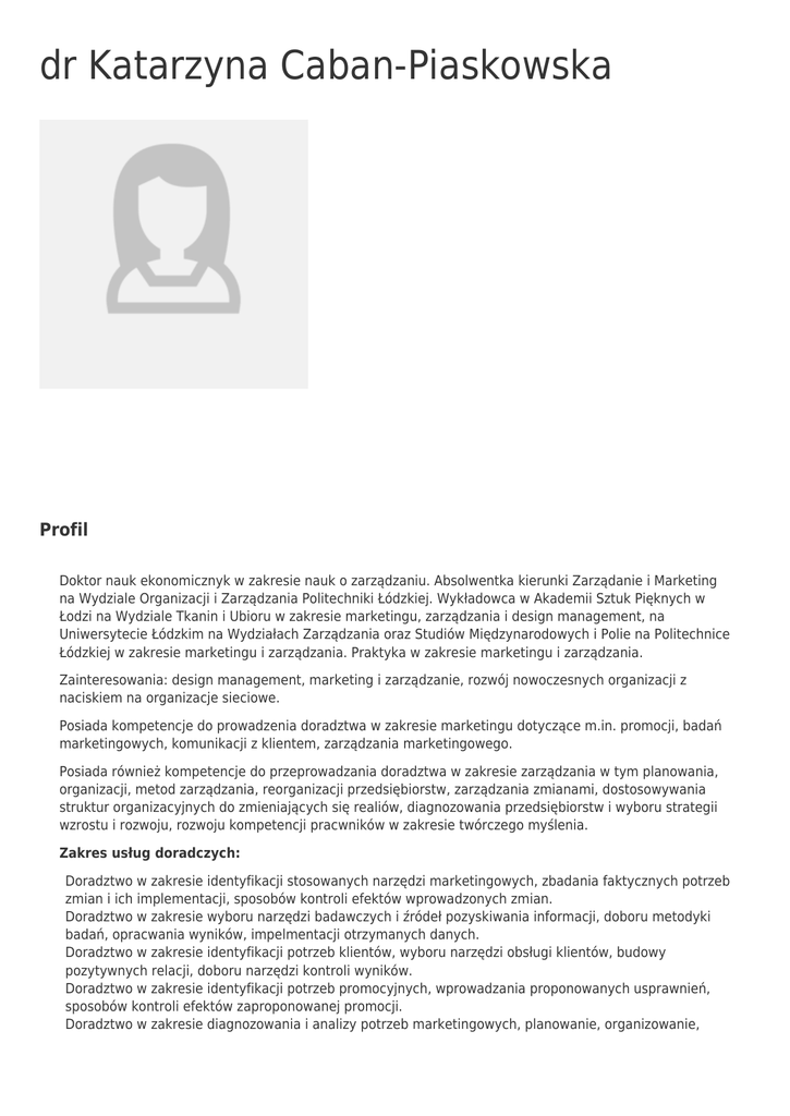 dr Katarzyna Caban-Piaskowska Profil Doktor nauk ekonomicznyk w zakresie nauk o zarządzaniu. Absolwentka kierunki Zarządanie i Marketing na Wydziale Organizacji i Zarządzania Politechniki Łódzkiej. Wykładowca w Akademii Sztuk Pięknych w Łodzi na Wydziale Tkanin i Ubioru w zakresie marketingu, zarządzania i design management, na Uniwersytecie Łódzkim na Wydziałach Zarządzania oraz Studiów Międzynarodowych i Polie na Politechnice Łódzkiej w zakresie marketingu i zarządzania. Praktyka w zakresie marketingu i zarządzania. Zainteresowania: design management, marketing i zarządzanie, rozwój nowoczesnych organizacji z naciskiem na organizacje sieciowe. Posiada kompetencje do prowadzenia doradztwa w zakresie marketingu dotyczące m.in. promocji, badań marketingowych, komunikacji z klientem, zarządzania marketingowego. Posiada również kompetencje do przeprowadzania doradztwa w zakresie zarządzania w tym planowania, organizacji, metod zarządzania, reorganizacji przedsiębiorstw, zarządzania zmianami, dostosowywania struktur organizacyjnych do zmieniających się realiów, diagnozowania przedsiębiorstw i wyboru strategii wzrostu i rozwoju, rozwoju kompetencji pracwników w zakresie twórczego myślenia. Zakres usług doradczych: Doradztwo w zakresie identyfikacji stosowanych narzędzi marketingowych, zbadania faktycznych potrzeb zmian i ich implementacji, sposobów kontroli efektów wprowadzonych zmian. Doradztwo w zakresie wyboru narzędzi badawczych i źródeł pozyskiwania informacji, doboru metodyki badań, opracwania wyników, impelmentacji otrzymanych danych. Doradztwo w zakresie identyfikacji potrzeb klientów, wyboru narzędzi obsługi klientów, budowy pozytywnych relacji, doboru narzędzi kontroli wyników. Doradztwo w zakresie identyfikacji potrzeb promocyjnych, wprowadzania proponowanych usprawnień, sposobów kontroli efektów zaproponowanej promocji. Doradztwo w zakresie diagnozowania i analizy potrzeb marketingowych, planowanie, organizowanie, przeprowadzanie i kontrla wprowadzonych usprawnień. Doradztwo w zakresie metod i narzędzi zarządzania grupami zróżnicowanymi, zarządzania innowacją, koordynacji na wszystkich poziomach przedsiębiorstwa, zarządzania rozwojem nowego produktu. Doradztwo w zakresie kompleksowej analizy przedsiębiorstwa z punktu widzenia stosowanych narzędzi zarządzania, wprowadzania strategii, sposobów kontroli efektów wprowadzanych strategii. Doradztwo w zakresie polepszenia atmosfery w pracy, podniesienia efektywności, stosowania różnych stylów zarządzania i motywacji w przedsiębiorstwie. Doradztwo w zakresie redukcji negatywnych skutków wprowadzania zmian, polepszania komunikacji wewnątrz przedsiębiorstwa, przewodzenia w procesie wprowadzania innowacji i kontroli jej efektów. Ekspert w projektach Zintegrowan y Program Modernizacji Branży Tekstylnej i Odzieżowej Województw a Łódzkiego Baza wiedzy Od struktury liniowej do macierzowej analiza przypadku View more Strona CBI Pro-Akademia używa ciasteczek (cookies), dzięki którym nasz serwis może działać lepiej. Zobacz