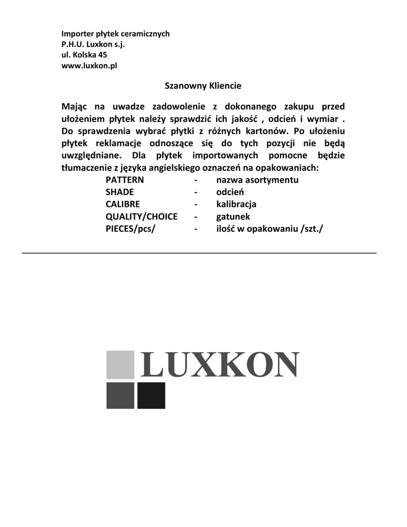 Importer płytek ceramicznych P.H.U. Luxkon s.j. ul. Kolska 45 www.luxkon.pl Szanowny Kliencie Mając na uwadze zadowolenie z dokonanego zakupu przed ułożeniem płytek należy sprawdzić ich jakość , odcień i wymiar . Do sprawdzenia wybrać płytki z różnych kartonów. Po ułożeniu płytek reklamacje odnoszące się do tych pozycji nie będą uwzględniane. Dla płytek importowanych pomocne będzie tłumaczenie z języka angielskiego oznaczeń na opakowaniach: PATTERN nazwa asortymentu SHADE odcień CALIBRE kalibracja QUALITY/CHOICE gatunek PIECES/pcs/ ilość w opakowaniu /szt./