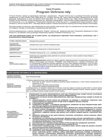 ISTNIEJE MOŻLIWOŚĆ ZAPOZNANIA SIĘ Z KARTĄ PRODUKTU WYDRUKOWANĄ WIĘKSZĄ CZCIONKĄ. ZAPYTAJ O TO PRZEDSTAWICIELA UBEZPIECZAJĄCEGO. Karta Produktu Program Ochrona raty W Karcie Produktu zawarte są najważniejsze informacje o ubezpieczeniu „Program Ochrona raty” na podstawie Warunków grupowego ubezpieczenia na życie Klientów Getin Noble Bank S.A. „Program Ochrona raty” (zwane dalej Warunkami Ubezpieczenia) do Umowy grupowego ubezpieczenia na życie dla Klientów Getin Noble Bank S.A. "Program Ochrona raty" (dalej Umowa ubezpieczenia). Karta Produktu nie jest elementem Umowy ubezpieczenia ani materiałem marketingowym. Karta Produktu została przygotowana przez Pośrednik Finansowy Sp. z o.o. we współpracy z Towarzystwem Ubezpieczeń na Życie Europa S.A. z uwzględnieniem zasad zawartych w Rekomendacji U z dnia 24 czerwca 2014 r. dotyczącej dobrych praktyk w zakresie bancassurace wydanej przez Komisję Nadzoru Finansowego. Przeczytaj uważnie ten dokument, abyś wiedział jakie są cechy produktu, jakie korzyści daje Ci to ubezpieczenie oraz jakie obowiązki są z nim związane. Pamiętaj, że skorzystanie z ubezpieczenia jest dobrowolne. Ochrona ubezpieczeniowa w zakresie ubezpieczenia „Program Ochrona raty” świadczona jest przez Towarzystwo Ubezpieczeń na Życie Europa S.A. na podstawie umowy grupowego ubezpieczenia zawartej z Pośrednik Finansowy Sp. z o.o. Jeśli masz jakiekolwiek pytania lub nie jesteś pewien, czy ubezpieczenie odpowiada Twoim potrzebom, porozmawiaj o tym z przedstawicielem Ubezpieczającego. FORMA UBEZPIECZENIA Ubezpieczenie grupowe CHARAKTER UBEZPIECZENIA Ubezpieczenie życia i zdrowie Ubezpieczonego TOWARZYSTWO UBEZPIECZEŃ Towarzystwo Ubezpieczeń na Życie Europa S.A. UBEZPIECZAJĄCY Pośrednik Finansowy Sp. z o.o. z siedzibą we Wrocławiu UBEZPIECZONY Osoba fizyczna posiadająca pełną zdolność do czynności prawnych, która zawarła Umowę Kredytu z Getin Noble Bank S.A. ROLA GETIN NOBLE BANK S.A. Agent ubezpieczeniowy wpisany do rejestru agentów ubezpieczeniowych prowadzonego przez Komisję Nadzoru Finansowego, pod numerem 11165368/A. Getin Noble Bank S.A. z siedzibą w Warszawie, przy ul. Przyokopowej 33 wykonuje czynności agencyjne na rzecz wielu zakładów ubezpieczeń, w tym na rzecz Towarzystwa Ubezpieczeń na Życie Europa S.A. Informacje o wpisie Banku do rejestru agentów Klient może sprawdzić poprzez złożenie wniosku do KNF lub poprzez stronę internetową: https://au.knf.gov.pl/Au_online/. PODSTAWOWE INFORMACJE O UBEZPIECZENIU ZAKRES OCHRONY UBEZPIECZENIOWEJ Życie Ubezpieczonego WARUNKI OBJĘCIA OCHRONĄ UBEZPIECZENIOWĄ 1.Ochroną ubezpieczeniową, może zostać objęta osoba fizyczna: 1) której wiek na dzień złożenia podpisanej Deklaracji Zgody powiększony o okres trwania ubezpieczenia nie przekracza 70 lat, )która zawarła z Bankiem Umowę Kredytu, 2) która złożyła podpisaną Deklarację Zgody, 2.Ubezpieczeniem, na zasadach określonych w Umowie, może być objęty nie więcej niż jeden Klient w ramach jednej Umowy Kredytu, który posiada w chwili zawarcia danej Umowy Kredytu najwyższy dochód, ustalony zgodnie z regulacjami, na podstawie których została zawarta Umowa Kredytu. 1. 2. WYŁĄCZENIA I OGRANICZENIA ODPOWIEDZIALNOŚCI TOWARZYSTWA UBEZPIECZEŃ Ubezpieczyciel nie ponosi odpowiedzialności, jeżeli zgon Ubezpieczonego nastąpił wskutek samobójstwa w okresie 2 pierwszych lat od dnia objęcia ochroną ubezpieczeniową. Ubezpieczyciel nie ponosi również odpowiedzialności, jeżeli zgon Ubezpieczonego nastąpił na skutek lub w związku z: 1) nieprzestrzeganiem zaleceń lekarza lub poddaniem się zabiegom o charakterze medycznym poza kontrolą lekarską lub uprawnionych do tego osób (z wyjątkiem sytuacji związanej 2) z Nieszczęśliwym wypadkiem); 3) następstwami zabiegów o charakterze kosmetycznym, poddaniem się przez Ubezpieczonego zabiegom chirurgii plastycznej lub operacji zmiany płci; 4) pozostawaniem Ubezpieczonego w stanie po użyciu alkoholu lub w stanie nietrzeźwości, lub w stanie po użyciu środków odurzających, substancji psychotropowych lub środków zastępczych w rozumieniu przepisów o przeciwdziałaniu narkomanii, a także lekarstw lub innych środków wyłączających świadomość z wyjątkiem sytuacji, gdy spożycie tych środków nastąpiło zgodnie z zaleceniami lekarza; 5) działaniami wojennymi (w tym wojna domowa), rozruchami, zamieszkami, stanem wojennym, aktami terroryzmu lub sabotażu; 6) alkoholizmem lub zaburzeniami psychicznymi Ubezpieczonego (choroba zakwalifikowana w Międzynarodowej Statystycznej Kwalifikacji Chorób i Problemów Zdrowotnych, jako zaburzenia psychiczne lub zaburzenia zachowania, w tym nerwice); 7) prowadzeniem przez Ubezpieczonego pojazdu mechanicznego bez wymaganych uprawnień; 8) jazdą motocyklem o pojemności skokowej silnika powyżej 50 cm3; 9) uczestnictwem Ubezpieczonego w locie w charakterze pilota, członka załogi lub pasażera samolotu poza licencjonowanymi liniami lotniczymi; 10) eksplozją atomową oraz napromieniowaniem; 11) uprawianiem przez Ubezpieczonego niebezpiecznych dyscyplin sportu lub aktywności fizycznej: alpinizm, wspinaczka górska i skałkowa, rafting, speleologia, baloniarstwo, bobsleje, saneczkarstwo, sporty motorowe i motorowodne, jeździectwo, lotniarstwo, paralotniarstwo, lotnictwo, spadochroniarstwo, szybownictwo, szermierka, sporty siłowe, sporty walki i obronne, kajakarstwo wysokogór- 3. 1. Suma ubezpieczenia obliczana jest zgodnie z poniższym wzorem: SU = 125% PR * 12 - dotyczy Zgonu Ubezpieczonego w wyniku Nieszczęśliwego Wypadku, lub SU = 125% PR * 6 - dotyczy Zgonu Ubezpieczonego z innej przyczyny niż Nieszczęśliwy Wypadek gdzie: SU – suma ubezpieczenia stanowiąca górną granicę odpowiedzialności Ubezpieczyciela z tytułu Zdarzenia ubezpieczeniowego w okresie odpowiedzialności, PR – pierwsza Rata Kredytu wynikająca z harmonogramu spłaty Kredytu ustalonego: 1) na dzie