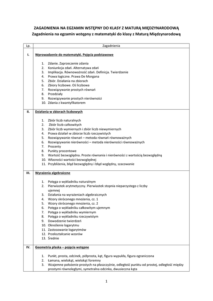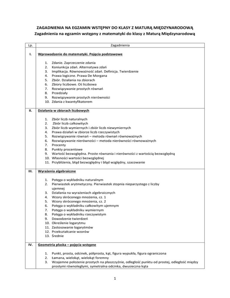 ZAGADNIENIA NA EGZAMIN WSTĘPNY DO KLASY Z MATURĄ MIĘDZYNARODOWĄ Zagadnienia na egzamin wstępny z matematyki do klasy z Maturą Międzynarodową Lp. I. Zagadnienia Wprowadzenie do matematyki. Pojęcia podstawowe 1. 2. 3. 4. 5. 6. 7. 8. 9. 10. II. Działania w zbiorach liczbowych 1. 2. 3. 4. 5. 6. 7. 8. 9. 10. 11. III. Zbiór liczb naturalnych Zbiór liczb całkowitych Zbiór liczb wymiernych i zbiór liczb niewymiernych Prawa działań w zbiorze liczb rzeczywistych Rozwiązywanie równań – metoda równań równoważnych Rozwiązywanie nierówności – metoda nierówności równoważnych Procenty Punkty procentowe Wartość bezwzględna. Proste równania i nierówności z wartością bezwzględną Własności wartości bezwzględnej Przybliżenia, błąd bezwzględny i błąd względny, szacowanie Wyrażenia algebraiczne 1. 2. 3. 4. 5. 6. 7. 8. 9. 10. 11. 12. 13. IV. Zdanie. Zaprzeczenie zdania Koniunkcja zdań. Alternatywa zdań Implikacja. Równoważność zdań. Definicja. Twierdzenie Prawa logiczne. Prawa De Morgana Zbiór. Działania na zbiorach Zbiory liczbowe. Oś liczbowa Rozwiązywanie prostych równań Przedziały Rozwiązywanie prostych nierówności Zdania z kwantyfikatorem Potęga o wykładniku naturalnym Pierwiastek arytmetyczny. Pierwiastek stopnia nieparzystego z liczby ujemnej Działania na wyrażeniach algebraicznych Wzory skróconego mnożenia, cz. 1 Wzory skróconego mnożenia, cz. 2 Potęga o wykładniku całkowitym ujemnym Potęga o wykładniku wymiernym Potęga o wykładniku rzeczywistym Dowodzenie twierdzeń Określenie logarytmu Zastosowanie logarytmów Przekształcanie wzorów Średnie Geometria płaska – pojęcia wstępne 1. 2. 3. Punkt, prosta, odcinek, półprosta, kąt, figura wypukła, figura ograniczona Łamana, wielokąt, wielokąt foremny Wzajemne położenie prostych na płaszczyźnie, odległość punktu od prostej, odległość między prostymi równoległymi, symetralna odcinka, dwusieczna kąta 1 4. 5. 6. 7. 8. 9. 10. Dwie proste przecięte trzecią prostą. Suma kątów w wielokącie Wektor na płaszczyźnie (bez układu współrzędnych) Wybrane przekształcenia płaszczyzny, cz. 1 Wybrane przekształcenia płaszczyzny, cz. 2 Twierdzenie Talesa Okrąg i koło Kąty i koła V. Geometria płaska – trójkąty 1. Podział trójkątów. Suma kątów w trójkącie. Nierówność trójkąta Odcinek łączący środki dwóch boków w trójkącie 2. Twierdzenie Pitagorasa. Twierdzenie odwrotne do twierdzenia Pitagorasa 3. Wysokości w trójkącie. Środkowe w trójkącie 4. Symetralne boków trójkąta. Okrąg opisany na trójkącie 5. Dwusieczne kątów trójkąta. Okrąg wpisany w trójkąt 6. Przystawanie trójkątów 7. Podobieństwo trójkątów 8. Twierdzenie o stycznej i siecznej VI. Trygonometria 1. 2. 3. 4. 5. 6. 7. 8. VII. Geometria płaska – pole koła, pole trójkąta 1. 2. 3. 4. 5. 6. VIII. Określenie sinusa, cosinusa, tangensa i cotangensa w trójkącie prostokątnym Wartości sinusa, cosinusa, tangensa i cotangensa dla kątów 30, 45 i 60 Kąt skierowany Sinus, cosinus, tangens i cotangens dowolnego kąta Podstawowe tożsamości trygonometryczne Wzory redukcyjne Twierdzenie sinusów Twierdzenie cosinusów Pole figury geometrycznej Pole trójkąta, cz. 1 Pole trójkąta, cz. 2 Pola trójkątów podobnych Pole koła, pole wycinka koła Zastosowanie pojęcia pola w dowodzeniu twierdzeń Funkcja i jej własności 1. 2. 3. 4. 5. 6. 7. 8. 9. 10. 11. 12. 13. Pojęcie funkcji. Funkcja liczbowa. Dziedzina i zbiór wartości funkcji Sposoby opisywania funkcji Wykres funkcji Dziedzina funkcji liczbowej Zbiór wartości funkcji liczbowej Miejsce zerowe funkcji Równość funkcji Monotoniczność funkcji Funkcje różnowartościowe Funkcje parzyste i funkcje nieparzyste Funkcje okresowe Największa i najmniejsza wartość funkcji liczbowej Odczytywanie własności funkcji na podstawie jej wykresu. Szkicowanie wykresów funkcji o zadanych własnościach 14. Zastosowanie wykresów funkcji do rozwiązywania równań i nierówności 15. Zastosowanie wiadomości o funkcjach do opisywania, interpretowania 2 i przetwarzania informacji wyrażonych w postaci wykresu funkcji Informacja o egzaminie ustnym z języka angielskiego do klasy z Maturą Międzynarodową Egzamin z języka angielskiego będzie miał formę rozmowy kwalifikacyjnej sprawdzającej predyspozycje i motywację kandydata do nauki w klasie z programem Międzynarodowej Matury. Będzie się składał z trzech następujących części: 1. Autoprezentacja kandydata i uzasadnienie chęci podjęcia nauki w projekcie IB Diploma Programme. 2. Opis i interpretacja zdjęcia. 3. Dyskusja dotycząca jednego ze wskazanych zagadnień. Człowiek, Państwo i społeczeństwo, Dom, Świat przyrody, Szkoła, Praca, Życie rodzinne i towarzyskie, Kultura, Zakupy i usługi, Nauka i technika, Żywienie, Zdrowie, Sport, Podróżowanie i turystyka, Wiedza o krajach angielskiego obszaru językowego i Polsce oraz Unii Europejskiej. Od kandydatów wymagana jest znajomość języka na poziomie B2 z elementami C1 (wg Common European Framework of Reference for Languages). 3