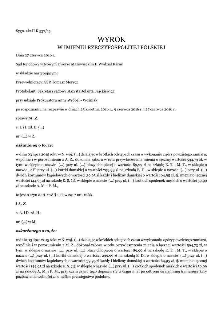 Sygn. akt II K 537/15 WYROK W IMIENIU RZECZYPOSPOLITEJ POLSKIEJ Dnia 27 czerwca 2016 r. Sąd Rejonowy w Nowym Dworze Mazowieckim II Wydział Karny w składzie następującym: Przewodniczący: SSR Tomasz Morycz Protokolant: Sekretarz sądowy stażysta Jolanta Frąckiewicz przy udziale Prokuratora Anny Wróbel - Woźniak po rozpoznaniu na rozprawie w dniach 25 kwietnia 2016 r., 9 czerwca 2016 r. i 27 czerwca 2016 r. sprawy M. Z. c. I. i I. zd. B. (...) ur. (...) w Ż. oskarżonej o to, że: w dniu 03 lipca 2015 roku w N. woj. (...) działając w krótkich odstępach czasu w wykonaniu z góry powziętego zamiaru, wspólnie i w porozumieniu z A. Z., dokonała zaboru w celu przywłaszczenia mienia o łącznej wartości 594,73 zł, w tym: w sklepie o nazwie (...) przy ul. (...) bluzy chłopięcej o wartości 89,99 zł na szkodę E. T. i M. T., w sklepie o nazwie ,,4F” przy ul. (...) kurtki damskiej o wartości 299,99 zł na szkodą E. D., w sklepie o nazwie (...) przy ul. (...) dwóch kostiumów kąpielowych o wartości 39,95 zł każdy i bielizny damskiej o wartości 64,95 zł, tj. mienia o łącznej wartości 144,95 zł na szkodę K. S. (1), w sklepie o nazwie (...) przy ul. (...) krótkich spodenek męskich o wartości 59,99 zł na szkodę A. M. i P. M., to jest o czyn z art. 278 § 1 kk w zw. z art. 12 kk i A. Z. s. A. i D. zd. H. ur. (...) w M. oskarżonego o to, że: w dniu 03 lipca 2015 roku w N. woj. (...) działając w krótkich odstępach czasu w wykonaniu z góry powziętego zamiaru, wspólnie i w porozumieniu z M. Z., dokonał zaboru w celu przywłaszczenia mienia o łącznej wartości 594,73 zł, w tym: w sklepie o nazwie (...) przy ul. (...) bluzy chłopięcej o wartości 89,99 zł na szkodę E. T. i M. T., w sklepie o nazwie (...) przy ul. (...) kurtki damskiej o wartości 299,99 zł na szkodą E. D., w sklepie o nazwie (...) przy ul. (...) dwóch kostiumów kąpielowych o wartości 39,95 zł każdy i bielizny damskiej o wartości 64,95 zł, tj. mienia o łącznej wartości 144,95 zł na szkodę K. S. (1), w sklepie o nazwie (...) przy ul. (...) krótkich spodenek męskich o wartości 59,99 zł na szkodę A. M. i P. M., przy czym czynu tego dopuścił się w ciągu 5 lat po odbyciu co najmniej 6 miesięcy kary pozbawienia wolności za umyślne przestępstwo podobne, to jest o czyn z art. 278 § 1 kk w zw. z art. 12 kk w zw. z art. 64 § 1 kk orzeka I. w ramach czynu zarzucanego oskarżonej M. Z. uznaje ją za winną tego, że w dniu 3 lipca 2015 r. w N., działając w krótkich odstępach czasu w wykonaniu z góry powziętego zamiaru, wspólnie i w porozumieniu z A. Z., dokonała zaboru w celu przywłaszczenia bluzy chłopięcej o wartości 89,99 złotych ze sklepu (...) znajdującego się przy ul. (...) na szkodę E. T. i M. T., kurtki damskiej o wartości 299,90 złotych ze sklepu (...) znajdującego się przy ul. (...) na szkodę E. D., dwóch kostiumów kąpielowych o wartości 39,95 złotych każdy i bielizny damskiej o wartości 64,95 złotych ze sklepu (...) znajdującego się przy ul. (...) na szkodę K. S. (1) i krótkich spodenek męskich o wartości 59,99 złotych ze sklepu (...) znajdującego się przy ul. (...) na szkodę A. M. i P. M., powodując straty w łącznej kwocie 594,73 złotych, za który na podstawie art. 278 § 1 kk w zw. z art. 12 kk skazuje ją, a na podstawie art. 278 § 1 kk wymierza jej karę 4 (czterech) miesięcy pozbawienia wolności; II. na podstawie art. 69 § 1 i 2 kk, art. 70 § 1 kk wykonanie orzeczonej wobec oskarżonej kary pozbawienia wolności warunkowo zawiesza na okres 3 (trzech) lat próby; III. na podstawie art. 73 § 1 kk oddaje oskarżoną pod dozór kuratora sądowego w okresie próby, na podstawie art. 72 § 1 pkt 1 kk zobowiązując ją do informowania go o jego przebiegu; IV. w ramach czynu zarzucanego oskarżonemu A. Z. uznaje go za winnego tego, że w dniu 3 lipca 2015 r. w N., działając w krótkich odstępach czasu w wykonaniu z góry powziętego zamiaru, wspólnie i w porozumieniu z M. Z., dokonał zaboru w celu przywłaszczenia bluzy chłopięcej o wartości 89,99 złotych ze sklepu (...) znajdującego się przy ul. (...) na szkodę E. T. i M. T., kurtki damskiej o wartości 299,90 złotych ze sklepu (...) znajdującego się przy ul. (...) na szkodę E. D., dwóch kostiumów kąpielowych o wartości 39,95 złotych każdy i bielizny damskiej o wartości 64,95 złotych ze sklepu (...) znajdującego się przy ul. (...) na szkodę K. S. (1) i krótkich spodenek męskich o wartości 59,99 złotych ze sklepu (...) znajdującego się przy ul. (...) na szkodę A. M. i P. M., powodując straty w łącznej kwocie 594,73 złotych, przy czym czynu tego dopuścił się w ciągu 5 lat po odbyciu co najmniej 6 miesięcy kary pozbawienia wolności orzeczonej za umyślne przestępstwo podobne, za który na podstawie art. 278 § 1 kk w zw. z art. 12 kk w zw. z art. 64 § 1 kk skazuje go, a na podstawie art. 278 § 1 kk wymierza mu karę 6 (sześciu) miesięcy pozbawienia wolności; VI. na podstawie art. 63 § 1 kk zalicza oskarżonemu na poczet orzeczonej wobec niego kary pozbawienia wolności czas zatrzymania od dnia 3 lipca 2015 r., godz. 18.30 do dnia 5 lipca 2015 r., godz. 15.40; VII. na podstawie art. 618 § 1 pkt 11 kpk zasądza od Skarbu Państwa na rzecz adw. A. K. kwotę 672 (sześćset siedemdziesiąt dwa) złote powiększoną o podatek od towarów i usług tytułem wynagrodzenia za pomoc prawną udzieloną oskarżonemu z urzędu; VIII. na podstawie art. 624 § 1 kpk zwalnia oskarżonych od kosztów sądowych w całości, którymi obciąża Skarb Państwa. Sygn. akt II K 537/15 UZASADNIENIE Na podstawie całokształtu zgromadzonego i ujawnionego materiału dowodowego ustalono następujący stan faktyczny: W dniu 3 lipca 2015 r. M. Z. i A. Z., będący małżeństwem, pojechali samochodem marki D. (...) o nr rej. (...), należącym do M. Z., do N.. Następnie M. Z. i A. Z. udali się do sklepów (...), znajdującego się przy 