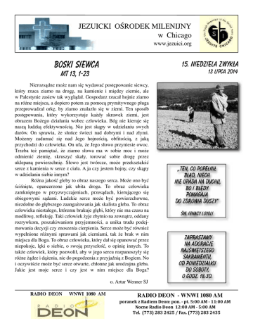 JEZUICKI OŚRODEK MILENIJNY w Chicago www.jezuici.org boski siewca 15. Niedziela zwykła 13 lipca 2014 Mt 13, 1-23 Nierozsądne może nam się wydawać postępowanie siewcy, który rzuca ziarno na drogę, na kamienie i między ciernie, ale w Palestynie zasiew tak wyglądał. Gospodarz rzucał hojnie ziarno na różne miejsca, a dopiero potem za pomocą prymitywnego pługa przeprowadzał orkę, by ziarno znalazło się w ziemi. Ten sposób postępowania, który wykorzystuje każdy skrawek ziemi, jest obrazem Bożego działania wobec człowieka. Bóg nie kieruje się naszą ludzką efektywnością. Nie jest skąpy w udzielaniu swych darów. On sprawia, że słońce świeci nad dobrymi i nad złymi. Możemy zadumać się nad Jego hojnością, obfitością, z jaką przychodzi do człowieka. On ufa, że Jego słowo przyniesie owoc. Trzeba też pamiętać, że ziarno słowa ma w sobie moc i może odmienić ziemię, skruszyć skały, torować sobie drogę przez uklepaną powierzchnię. Słowo jest twórcze, może przekształcić serce z kamienia w serce z ciała. A ja czy jestem hojny, czy skąpy w udzielaniu siebie innym? Różna jakość gleby to obraz naszego serca. Może ono być ściśnięte, opancerzone jak ubita droga. To obraz człowieka zamkniętego w przyzwyczajeniach, przesądach, kierującego się obiegowymi sądami. Ludzkie serce może być powierzchowne, niezdolne do głębszego zaangażowania jak skalista gleba. To obraz człowieka niestałego, któremu brakuje głębi, który nie ma czasu na modlitwę, refleksję. Taki człowiek żyje zbytnio na zewnątrz, oddany rozrywkom, poszukiwaniom przyjemności, a unika trudu podejmowania decyzji czy znoszenia cierpienia. Serce może być również wypełnione różnymi sprawami jak cierniami, tak że brak w nim miejsca dla Boga. To obraz człowieka, który dał się opanować przez niepokoje, lęki o siebie, o swoją przyszłość, o opinię innych. To także człowiek, który pozwolił, aby w jego sercu rozpanoszyły się różne żądze i dążenia, nie do pogodzenia z przyjaźnią z Bogiem. No i oczywiście może być serce otwarte, chłonne jak urodzajna gleba. Jakie jest moje serce i czy jest w nim miejsce dla Boga? o. Artur Wenner SJ RADIO DEON WNWI 1080 AM ,,Ten, co popełnił błąd, niech nie upada na duchu, bo i błędy pomagają do zdrowia duszy” św. IGnacy Loyoli zapraszamy na adorację Najświętszego Sakramentu, od poniedziałku do soboty, o godz. 18:30. RADIO DEON - WNWI 1080 AM poranek z Radiem Deon: pon. - pt. 5:00 AM - 11:00 AM Nocne Radio Deon 12:00 AM - 5:00 AM Tel. (773) 283 2425 / Fax. (773) 283 2435 PORZĄDEK MSZY ŚWIĘTYCH Poniedziałek - pi¹tek: 8:00, 18:00, 19:00 (radiowa: WCEV 1450) I piątek miesiąca: 8:00, 19:00, 20:30 Środa: 19:00 - nowenna do Matki Bożej Nieustającej Pomocy Sobota: 8:00 i 19:00 , tylko w I sobotę miesiąca o 17:00 dla chorych, Niedziela: 8:00 (radiowa), 9:30, 11:00, 13:00, 19:00, 20:30 -=- SpowiedŸ św.: od poniedziałku do soboty - 7:30 i 18:30, w niedzielę - pó³ godziny przed ka¿d¹ Msz¹ Œwiêt¹, w1. pi¹tek miesi¹ca - od 18:30 do 21:00 Adoracja Najświętszego Sakramentu - od poniedziałku do czwartku - od 18:30 do 19:00 sobota - od 18:00 do 19:00 Sanktuarium Najświętszego Serca Pana Jezusa Jezuicki Ośrodek Milenijny 5835 W. Irving Park Rd.; Chicago, IL 60634, Tel. 773 777 7000; fax 773 427 0126 www.jezuici.org e-mail: [email protected] Audycje Radia DEON: tel. 773 283 2425 Fax. 773 283 2435 www. radiodeon.com e-mail: [email protected] Biuro czynne: od poniedziałku do piątku: 8:30 - 9:00, 15:30 - 20:30 sobota: 9:30 - 20:30, niedziela: 8:30 - 14:30, 18:30 - 21:30 Biblioteka czynna: sobota: 18:00 - 19:00; niedziela: 10:30 - 14:30; 19:00 - 21:00 Kawiarenka czynna: niedz.: 10:00 - 15:00, 19:00 - 22:00 Sacred Heart Mission House 4105 N. Avers Ave., Chicago, IL 60618 Tel. 773 588 74 76; fax 773 588 65 17 Rektor Sanktuarium i Przełożony Jezuitów o. Jerzy Sermak, SJ (773-588-7476 - ext. 224) o. Józef Birecki, SJ (773-777-7000 - ext. 121) o. Jerzy Mordarski, SJ (773-588-7476 - ext. 234) o. Jerzy Karpiński, SJ (773-588-7476 - ext. 237) o. Piotr Kochanowicz, SJ (773-588-7476 - ext. 227) br. Adam Poręba, SJ (773-777-7000 - ext. 122) Wszelkie ofiary i donacje prosimy kierowaæ na adres Sanktuarium. Donacje s¹ wolne od podatku i mo¿na je odpisywaæ przy rozliczeniu z IRS. TRANSMISJE RADIOWE I INTERNETOWE od poniedziałku do piątku,transmisja Mszy Św. z godz. 19:00 Radio WCEV 1450 (www.wcev1450.com) Niedziela 9:30 www.RadioSiedeM.net w niedziele: godz 8-9, Radio WCEV 1450, oraz Polskie Radio Chicago 1030 WNVR (www.polskieradio.com) Codziennie przez całą dobę: Kamera internetowa z Sanktuarium (obraz i dźwięk; używać Internet Explorer): www.jezuici.org - link „Transmisje na żywo” – wpisać jako użytkownik i hasło: 5835 INTENCJE MSZY ŚWIĘTYCH Niedziela, 13 VII 2014 8:00 + Stanisław Sarna, o Boże błogosławieństwo i opiekę Matki Bożej dla Sebastiana Skóry 9:30 Zbiorowa 11:00 dziękczynna za pracę z prośbą o dalsze błogosławieństwo dla rodziny Pawła w dniu jego urodzin 13:00 + Ireneusz Włodarek 19:00 Zbiorowa 20:30 + Andrzej Świderski w 10. rocznicę tragicznej śmierci Poniedziałek, 14 VII 8:00 o zdrowie dla mamy Janiny 18:00 + Jan Schab w 23. rocznicę śmierci 19:00 Zbiorowa Wtorek, 15 VII - św. Bonawentury 8:00 + Rene Corado w 2. rocznicę śmierci 18:00 + Tadeusz Poręcki w 38. rocznicę śmierci o łaskę miłosierdzia 19:00 Zbiorowa Środa, 16 VII - NMP z Góry Karmel 8:00 + Piotr Romaniak, + Andrzej Rutkowski w 7. rocznicę śmierci 18:00 + Zofia Łata 19:00 Zbiorowa Czwartek, 17 VII 8:00 + Filomena, Bolesław i Władysław Wilisowski 18:00 + Edward Raś w rocznicę śmierci, + + Marianna i Ryszard Raś 19:00 Zbiorowa. Piątek, 18 VII - św. Szymona z Lipnicy 8:00 + Marian Gunia 18:00 + + Jan, Emil i Zofia Ptak 19:00 Zbiorowa Sobota, 19 VII 8:00 intencja dziękczynno-błagalna w 10. rocznicę ślubu Anny i Andrzeja 19:00 Zbiorowa 