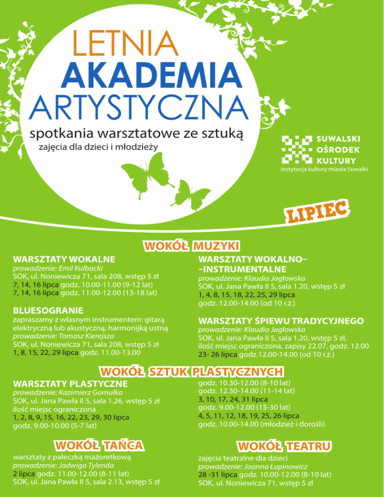 LETNIA AKADEMIA ARTYSTYCZNA spotkania warsztatowe ze sztuką zajęcia dla dzieci i młodzieży instytucja kultury miasta Suwałki LIPIEC WOKÓŁ MUZYKI WARSZTATY WOKALNE prowadzenie: Emil Kulbacki SOK, ul. Noniewicza 71, sala 208, wstęp 5 zł 7, 14, 16 lipca godz. 10.00-11.00 (9-12 lat) 7, 14, 16 lipca godz. 11.00-12.00 (13-18 lat) BLUESOGRANIE zapraszamy z własnym instrumentem: gitarą elektryczną lub akustyczną, harmonijką ustną prowadzenie: Tomasz Kierejsza SOK, ul. Noniewicza 71, sala 208, wstęp 5 zł 1, 8, 15, 22, 29 lipca godz. 11.00-13.00 WARSZTATY WOKALNO– –INSTRUMENTALNE prowadzenie: Klaudia Jagłowska SOK, ul. Jana Pawła II 5, sala 1.20, wstęp 5 zł 1, 4, 8, 15, 18, 22, 25, 29 lipca godz. 12.00-14.00 (od 10 r.ż.) WARSZTATY ŚPIEWU TRADYCYJNEGO prowadzenie: Klaudia Jagłowska SOK, ul. Jana Pawła II 5, sala 1.20, wstęp 5 zł, ilość miejsc ograniczona, zapisy 22.07, godz. 12.00 23- 26 lipca godz.12.00-14.00 (od 10 r.ż.) WOKÓŁ SZTUK PLASTYCZNYCH WARSZTATY PLASTYCZNE prowadzenie: Kazimierz Gomułka SOK, ul. Jana Pawła II 5, sala 1.26, wstęp 5 zł ilość miejsc ograniczona 1, 2, 8, 9, 15, 16, 22, 23, 29, 30 lipca godz. 9.00-10.00 (5-7 lat) WOKÓŁ TAŃCA warsztaty z pałeczką mażoretkową prowadzenie: Jadwiga Tylenda 2 lipca godz. 11.00-12.00 (8-11 lat) SOK, ul. Jana Pawła II 5, sala 2.13, wstęp 5 zł godz. 10.30-12.00 (8-10 lat) godz. 12.30-14.00 (11-14 lat) 3, 10, 17, 24, 31 lipca godz. 9.00-12.00 (15-30 lat) 4, 5, 11, 12, 18, 19, 25, 26 lipca godz. 10.00-14.00 (młodzież i dorośli) WOKÓŁ TEATRU zajęcia teatralne dla dzieci prowadzenie: Joanna Łupinowicz 28 -31 lipca godz. 10.00-12.00 (8-10 lat) SOK, ul. Noniewicza 71, wstęp 5 zł Ń SIERPIE WOKÓŁ MUZYKI IMPROWIZACJE GITAROWE prowadzenie: Wiesław Jarmoc SOK, ul. Jana Pawła II 5, sala 1.22 wstęp 5 zł 12, 19, 26 sierpnia godz. 16.00-17.30 (od 16 r.ż) WARSZTATY WOKALNO– –INSTRUMENTALNE prowadzenie: Klaudia Jagłowska SOK, ul. Jana Pawła II 5, sala 1.20, wstęp 5 zł 4, 11, 18, 25 sierpnia godz. 12.00-15.00 (od 10 r.ż.) WOKÓŁ TEATRU i SZTUK PLASTYCZNYCH WARSZTATY TEATRALNE prowadzenie: Joanna Łupinowicz SOK, ul. Noniewicza 71, wstęp 5 zł 1–8 sierpnia godz. 10.00-12.00 (8-10 lat) WARSZTATY CERAMICZNE prowadzenie: Beata Kochańska SOK, ul. Noniewicza 71, wstęp 5 zł 1, 5, 8, 12, 19, 22, 26, 29 sierpnia godz. 15.30-17.00 TRZY FONTANNY prowadzenie: Halina Mackiewicz, Mirosława Krymska, Andrzej Zujewicz • warsztaty plastyczno-teatralne dla rodzin z dziećmi • opowieści dziwnej treści, czyli warsztaty opowiadania dla rodziców i dziadków ŚWIAT WODNYCH ISTOT malarstwo dużego formatu dla dzieci plener przed SOK, wstęp 2 zł/osoba 12 sierpnia godz. 11.00-13.00 SKRZYDLATY ŚWIAT MODY, OWADY rysunkowy zawrót głowy dla dzieci park Konstytucji 3 Maja, wstęp 2 zł od osoby 13 sierpnia godz. 11.00-13.00 MALI ARCHITEKCI – ZAMKI małe i duże formy przestrzenne dla dzieci plac Marii Konopnickiej, wstęp 2 zł od osoby 14 sierpnia godz. 11.00-13.00 WOKÓŁ TAŃCA WARSZTATY TANECZNE • tańce polskie, regionalne, narodowe i integracyjne prowadzenie: Gosia Wojdełko i Renata Skórkiewicz SOK, ul. Jana Pawła II 5, sala 2.15 4, 6 sierpnia godz. 17.00-19.00 WARSZTATY W PRACOWNI RĘKODZIEŁA I RZEMIOSŁA WARSZTATY TANECZNE • balet, taniec współczesny, show dance, modern prowadzenie: Mihaił Nikolov SOK, ul. Jana Pawła II 5, sala 2.14, wstęp 5 zł 4, 11, 18, 25 sierpnia godz. 12.30-14.00 (8-11 lat) 6, 13, 20, 27 sierpnia godz. 12.30-14.00 (12-17 lat) WOKÓŁ REGIONU prowadzenie: Halina Lutyńska i Lidia Żyniewicz SOK, ul. Jana Pawła II 5, sala 0.28, wstęp 5 zł ilość miejsc ograniczona • gry zespołowe i planszowe 18 sierpnia godz. 11.00-13.00 • różnorodne techniki ozdabiania przedmiotów 19 sierpnia godz. 11.00-13.00 • zabytki architektury i kultury Suwałk cie z przewodnikiem) (wycieczka piesza po mieście 20 sierpnia godz.11.00-13.00 (od 7 r.ż.) UWAGA! zbiórka: SOK, ul. Noniewicza 71 • zajęcia dekoratorskie 21 sierpnia godz.11.00-13.00 • gry i zabawy zespołowe, ruchowe, zagadki, wyliczanki 22 sierpnia godz.11.00-13.00 www.soksuwalki.eu Organizator zastrzega sobie możliwość wprowadzenia zmian w programie, w szczególności dotyczących terminu i miejsca.