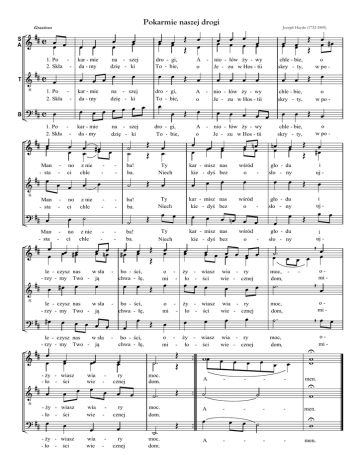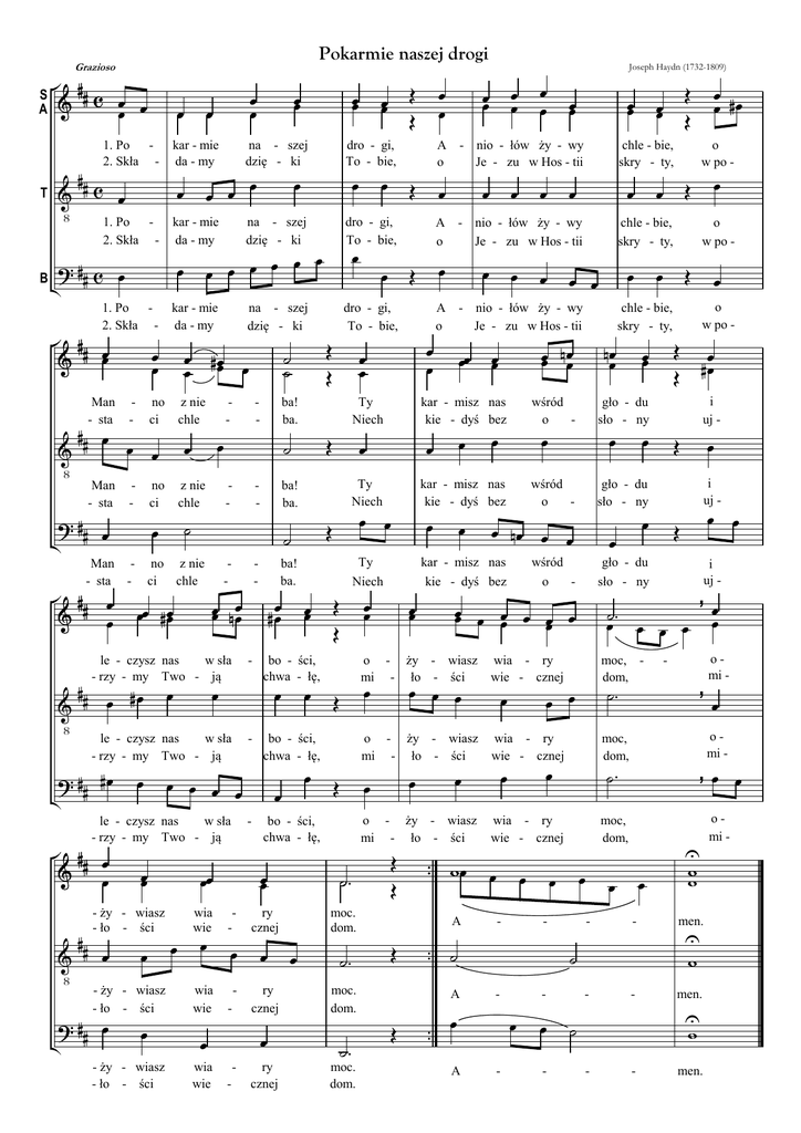 Pokarmie naszej drogi Grazioso S A 1. Po 2. Skła - T 1. Po B kar - mie da - my - - - z nie chle z nie chle - - - - le - czysz nas - w sła - rzy - my Two - ją - le - czysz nas w sła - rzy - my Two - ją - ży - wiasz - ło - ści - ży - wiasz - ło - ści - ży - wiasz - ło - ści bo - ści, chwa - łę, wia wie wia wie - - - wia wie - ry cznej o - ży - wiasz mi - ło - ści moc. dom. moc. dom. A o w po - chle - bie, skry - ty, gło - du sło - ny wśród o - gło - du sło - ny wśród o - o w po - i uj - i uj - gło - du sło - ny i uj - moc, dom, wia - ry wie - cznej , - , omi - omi - wia - ry wie - cznej moc, dom, , wia - ry wie - cznej moc, dom, omi - - - - - - - - - men. - - men. - - men. A o w po - wśród o - chle - bie, skry - ty, A o - ży - wiasz mi - ło - ści moc. dom. chle - bie, skry - ty, - nio - łów ży - wy Je - zu w Hos - tii ry cznej ry cznej A o o - ży - wiasz mi - ło - ści kar - misz nas kie - dyś bez kar - misz nas kie - dyś bez Ty Niech - nio - łów ży - wy Je - zu w Hos - tii kar - misz nas kie - dyś bez Ty Niech bo - ści, chwa - łę, - bo - ści, chwa - łę, - nio - łów ży - wy Je - zu w Hos - tii A o dro - gi, To - bie, A o Ty Niech ba! ba. ba! ba. - dro - gi, To - bie, ba! ba. le - czysz nas w sła - rzy - my Two - ją - Man - no z nie - sta - ci chle no ci na - szej dzię - ki dro - gi, To - bie, no ci na - szej dzię - ki kar - mie da - my Man - sta 1. Po 2. Skła - na - szej dzię - ki kar - mie da - my Man - sta 2. Skła Joseph Haydn (1732-1809)