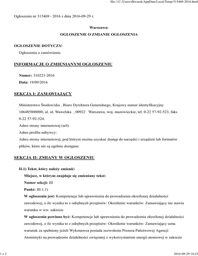 Ogłoszenie o zmianie ogłoszenia data: 2016-09